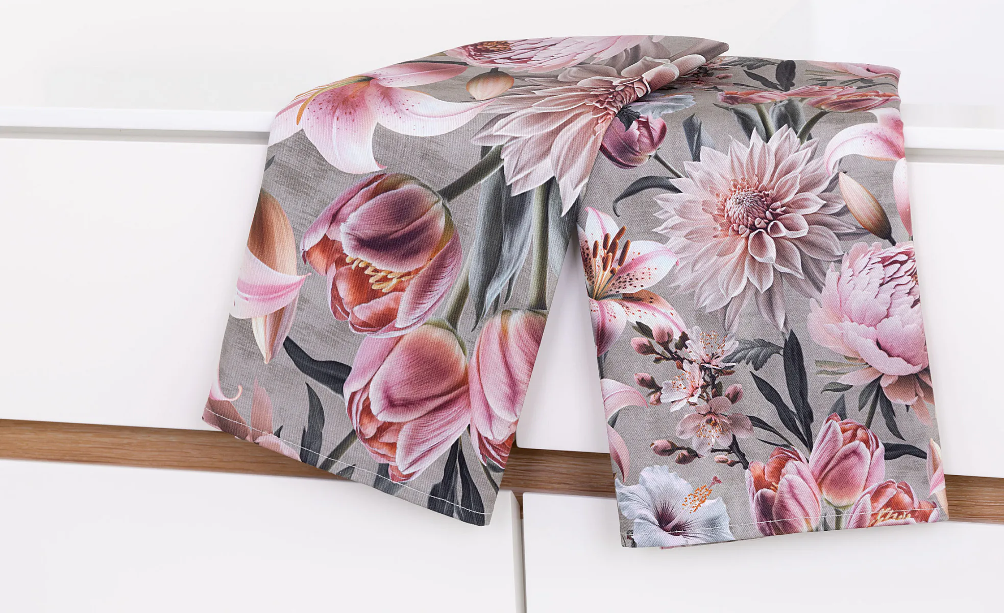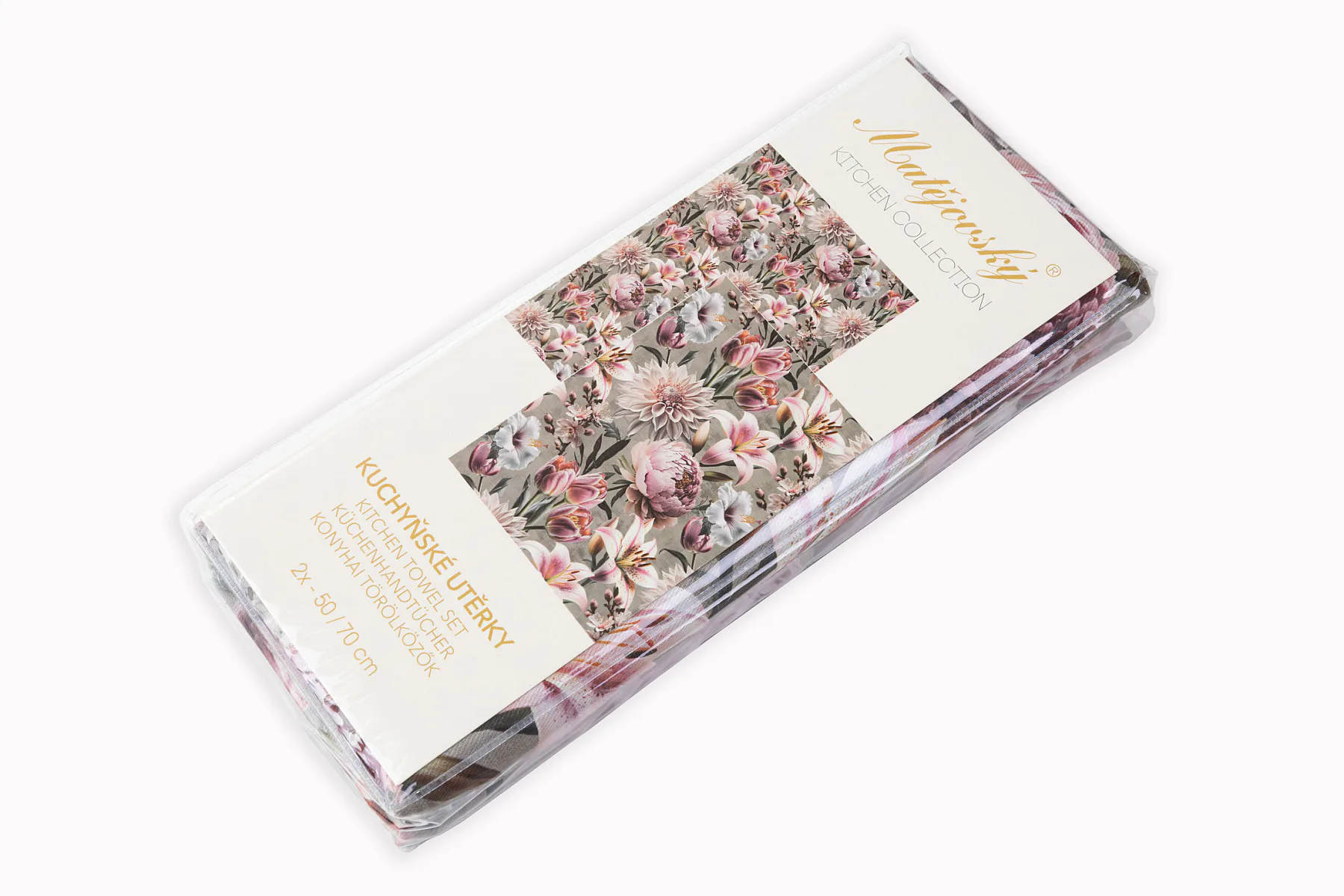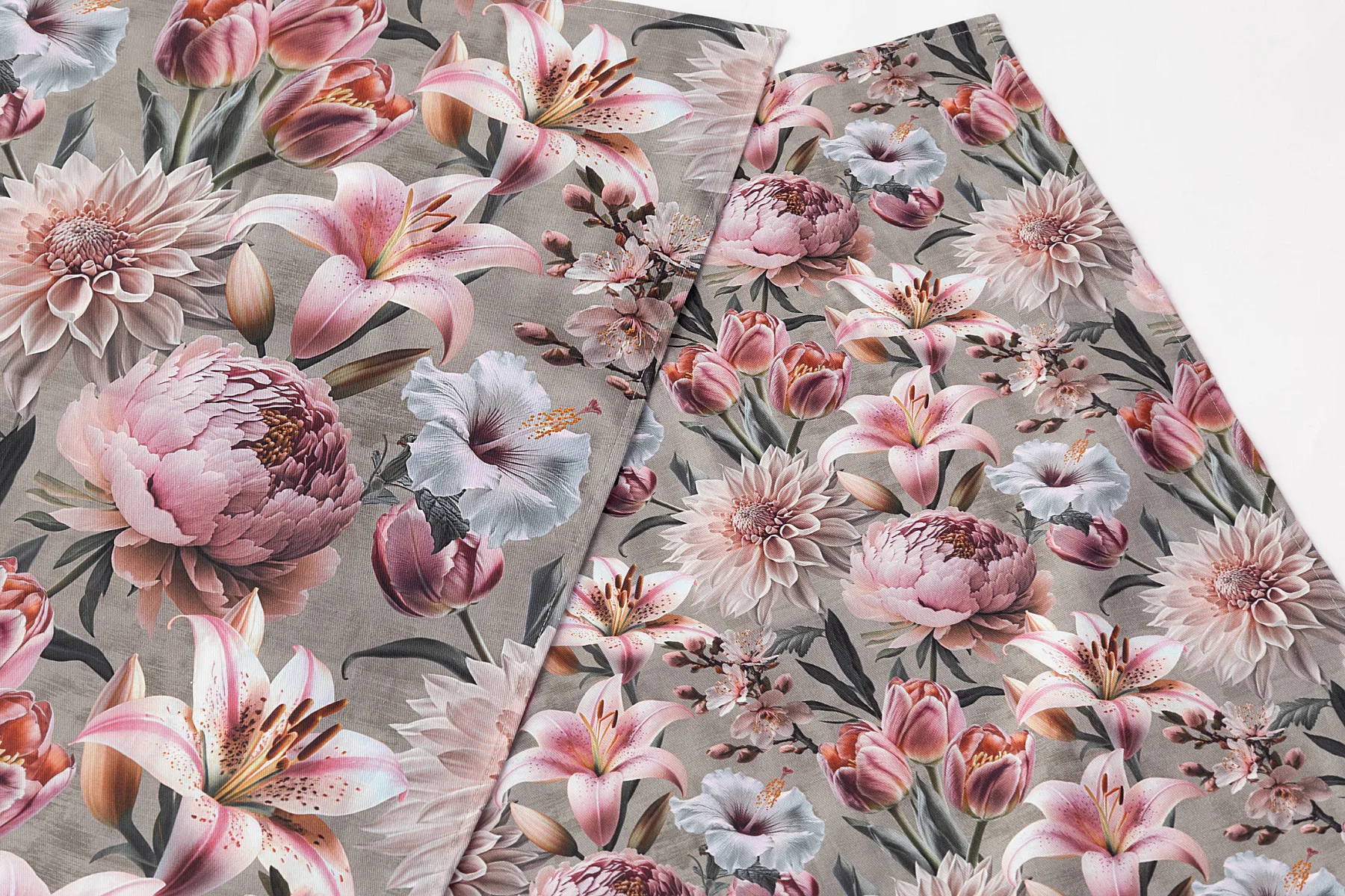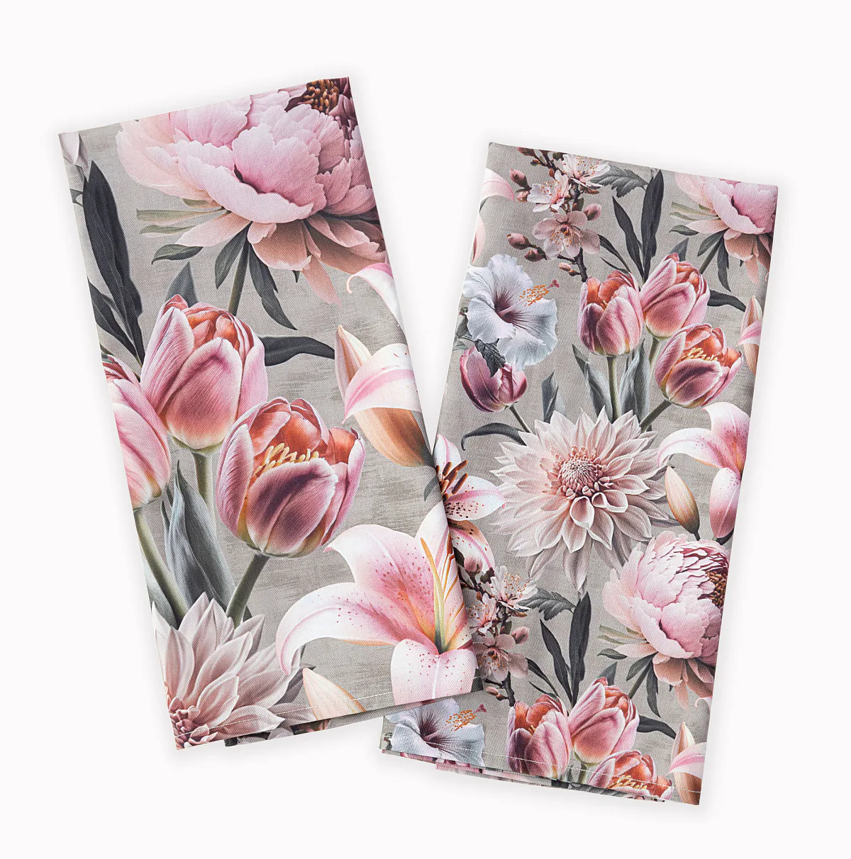 Potisk: jednostranný, obě utěrky zachycují stejný florální motiv s odlišnou velikostí květin