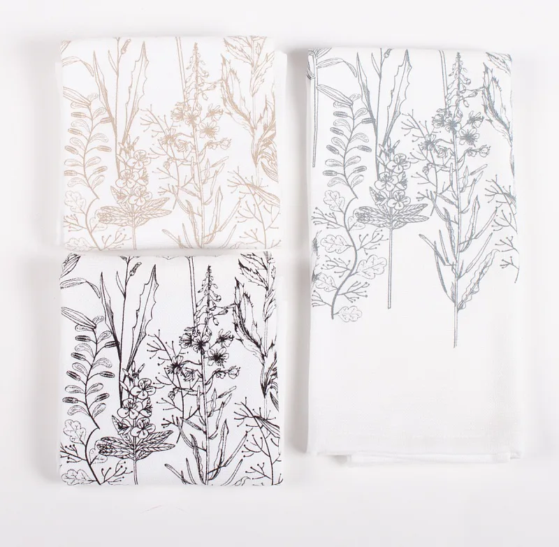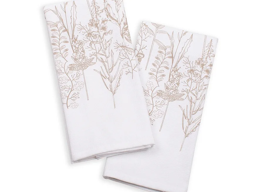 Kuchyňské utěrky Herbář si vás získají svým praktickým provedením i moderním vzorem. Luční kvítí je vykresleno v jemných béžových linkách. Vrchní potištěná strana je hladká s jemnou vlnkovou strukturou, spodní stranu tvoří hebké bílé froté. Utěrky mají všechny čtyři strany lemované a jsou opatřeny praktickým poutkem pro zavěšení.