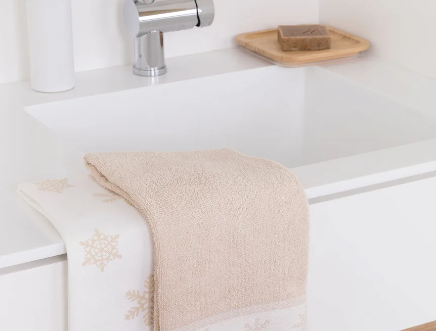 Gramáž: bílá utěrka 250 g/m2, béžový kuchyňský ručník 350 g/m2