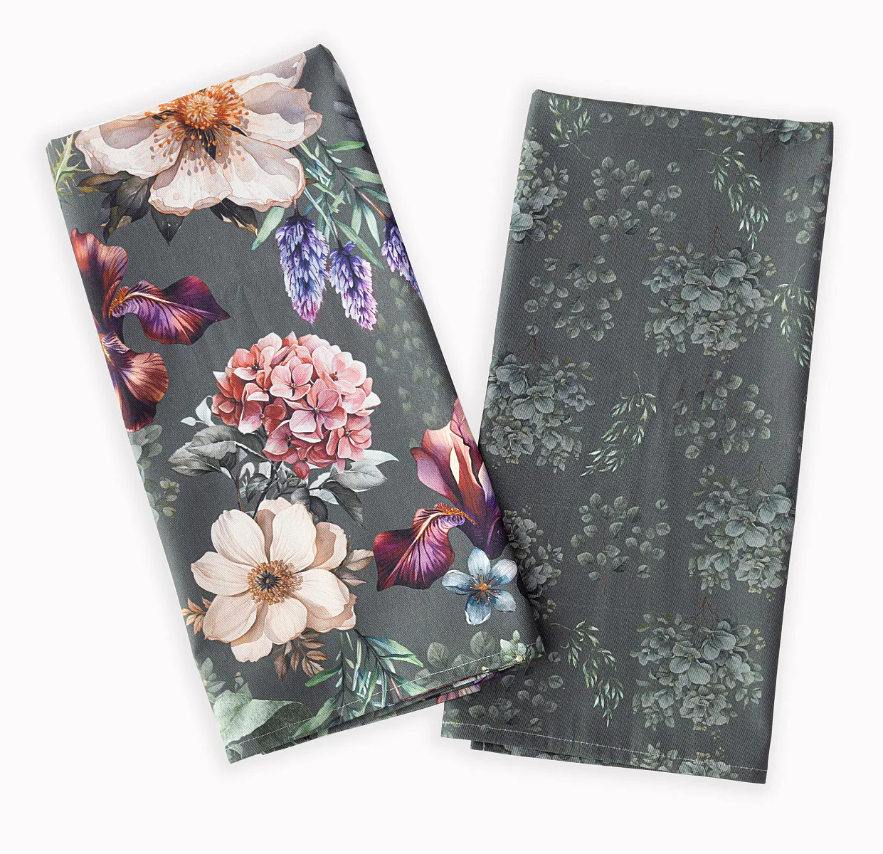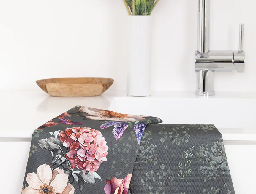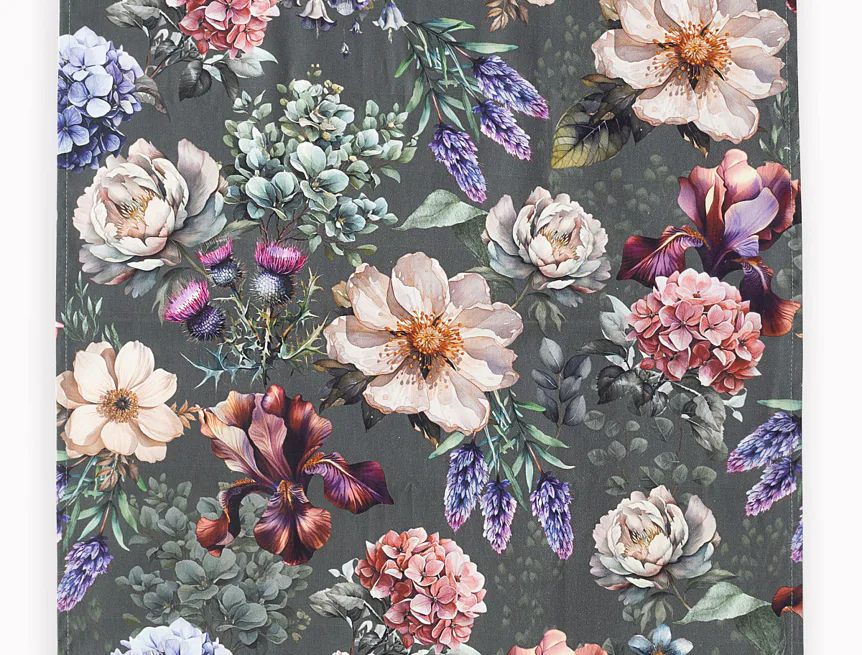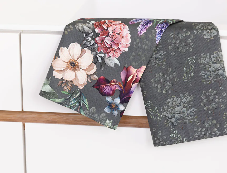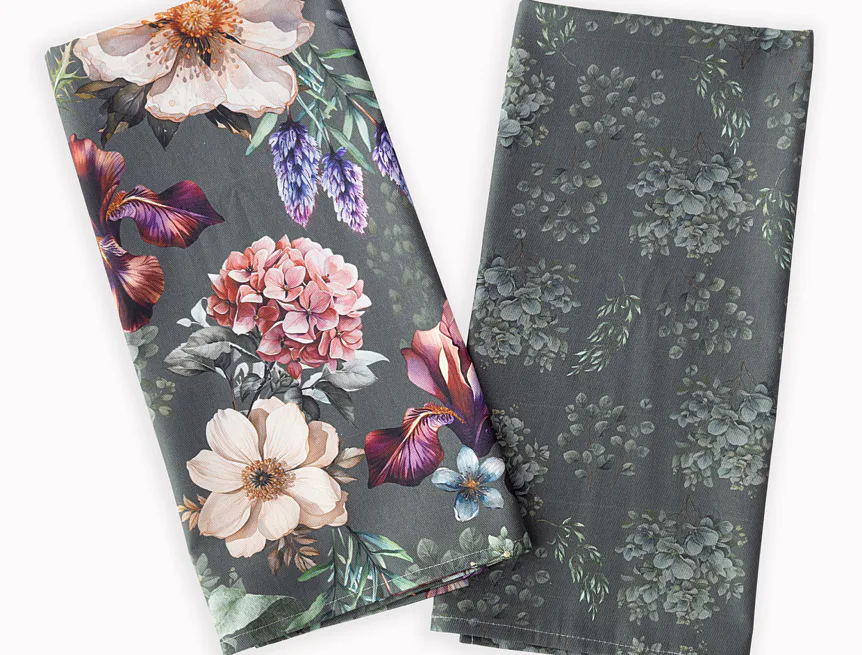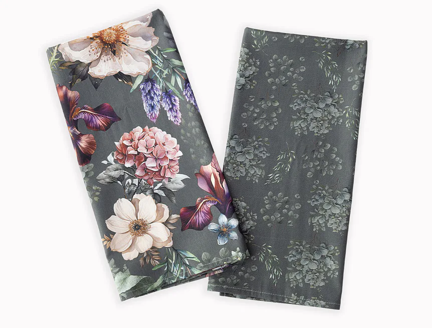 Potisk: jednostranný, obě utěrky zachycují jinak zpracovaný květinový motiv na zelenošedém podkladu