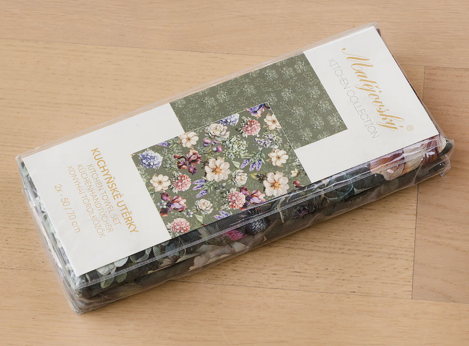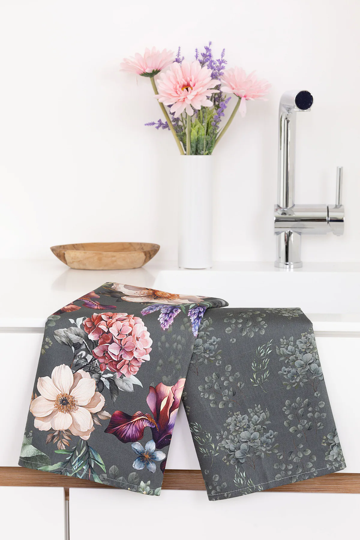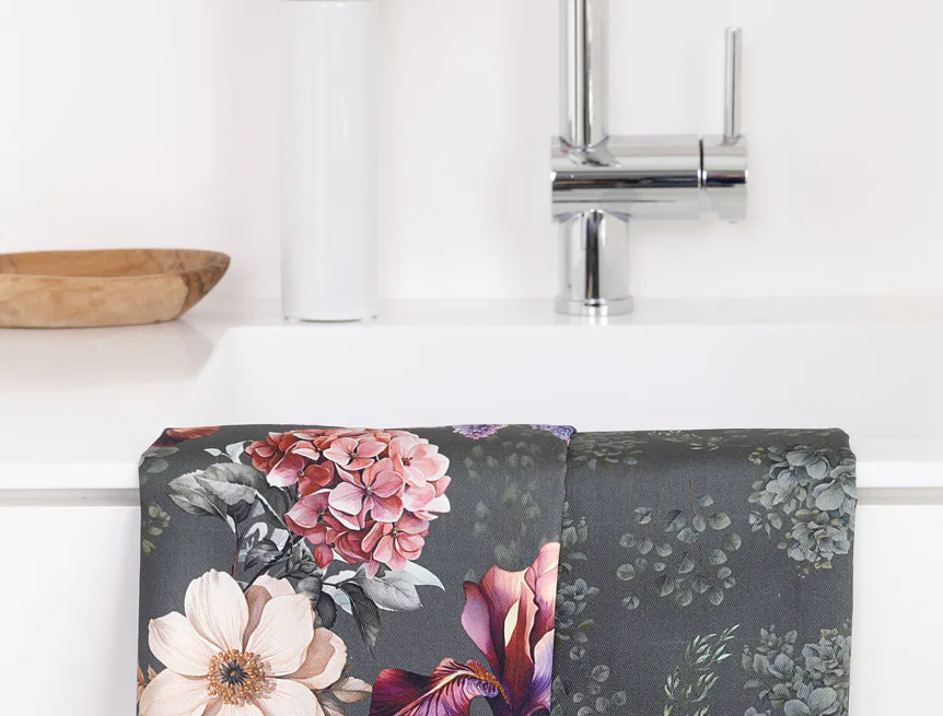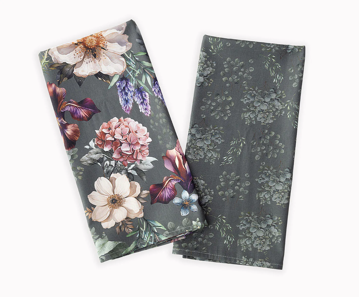 Potisk: jednostranný, obě utěrky zachycují jinak zpracovaný květinový motiv na zelenošedém podkladu