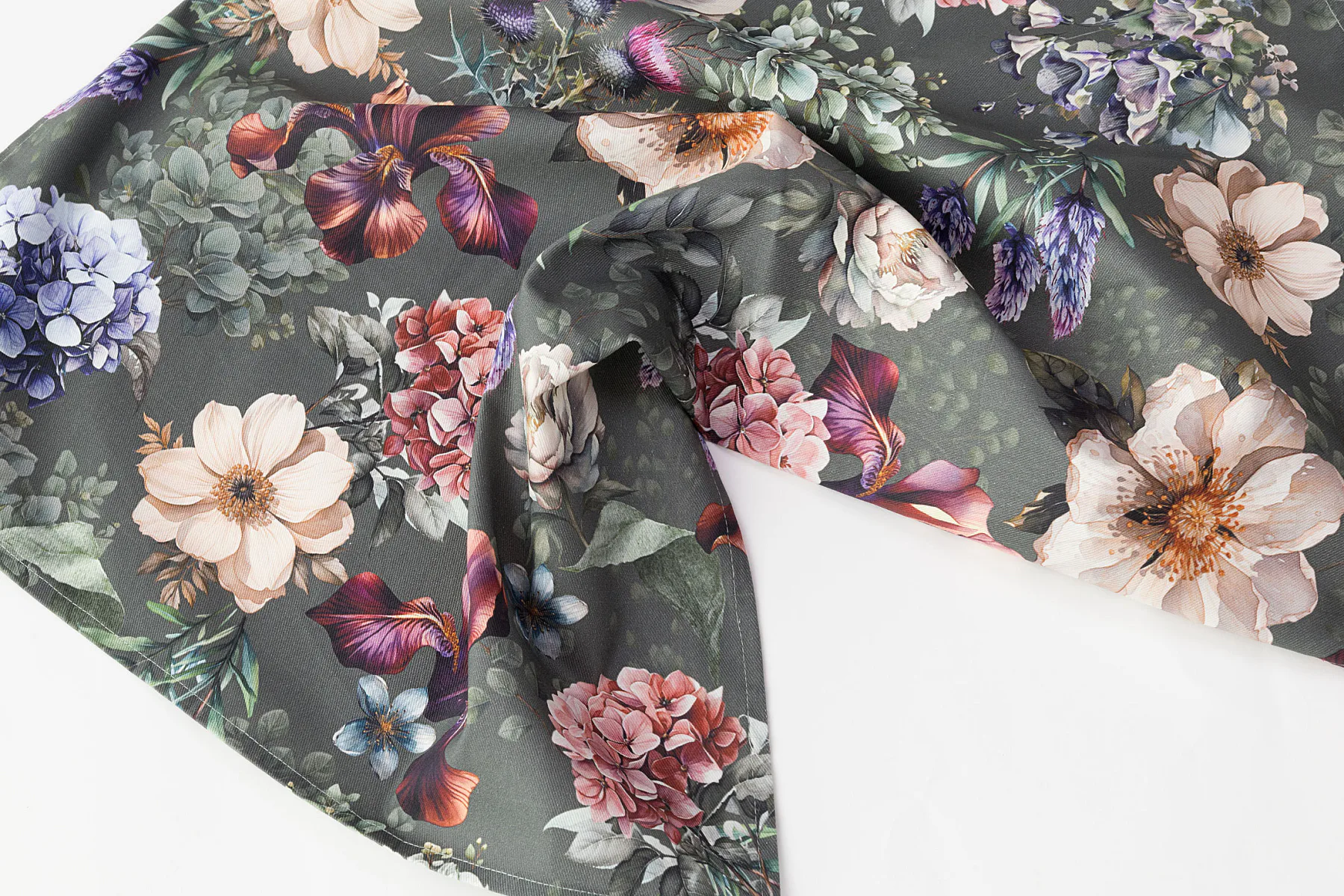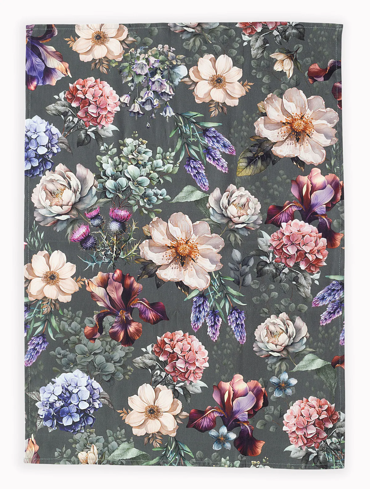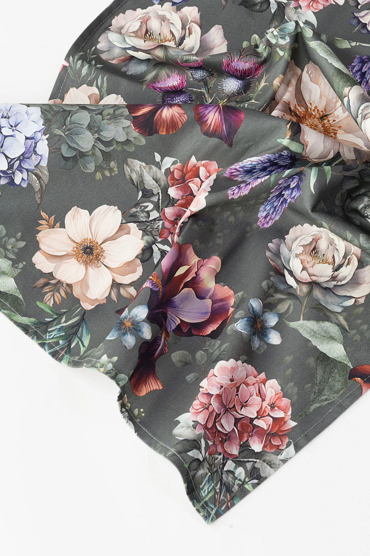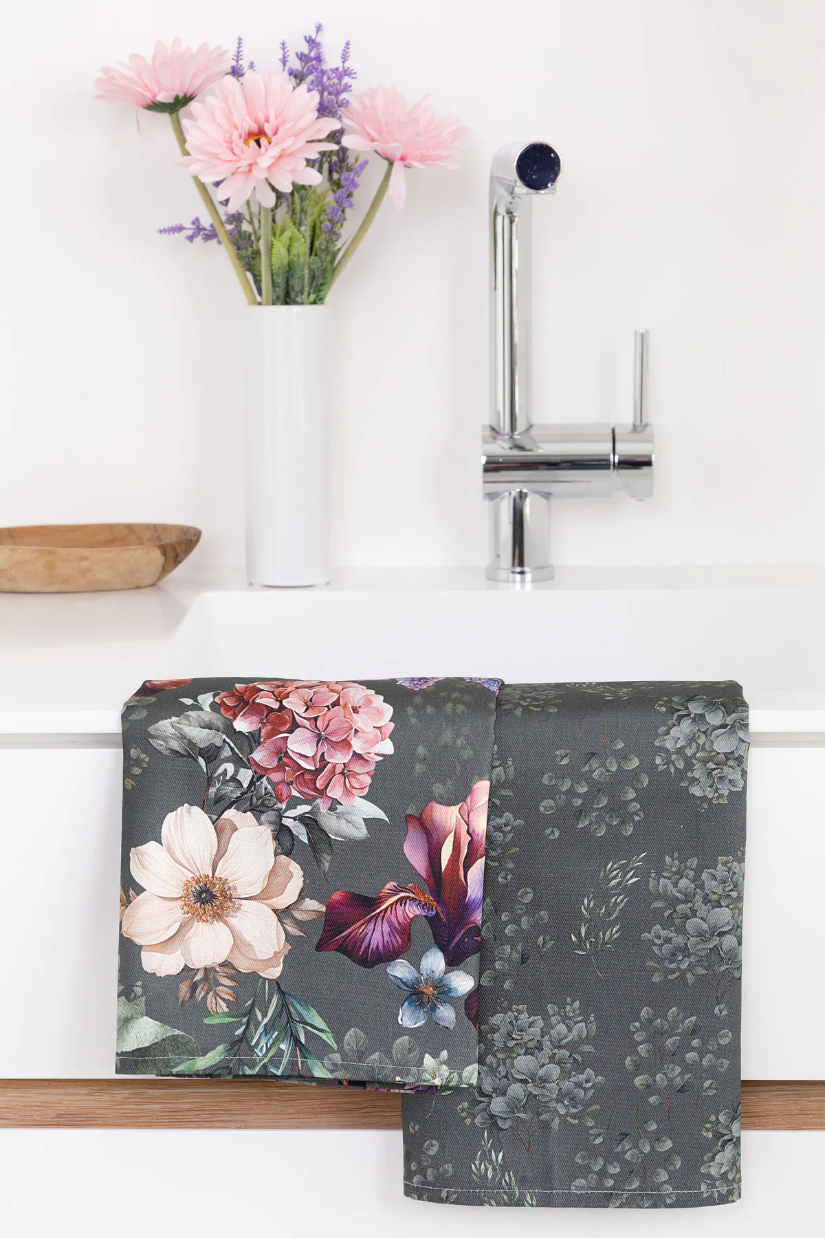 Potisk: jednostranný, obě utěrky zachycují jinak zpracovaný květinový motiv na zelenošedém podkladu