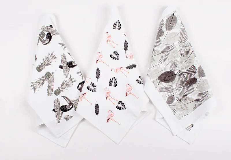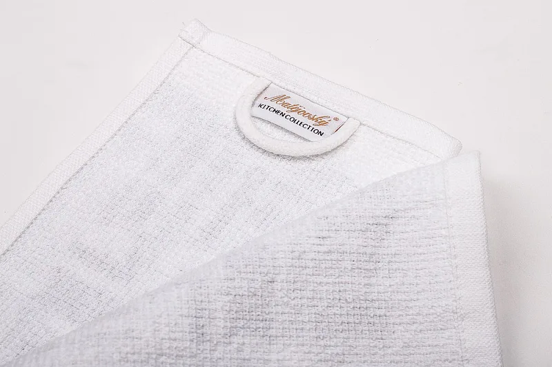 Kuchyňské utěrky jsou zajímavé svým praktickým provedením. Vrchní strana je hladká s jemnou vlnkovou strukturou, spodní stranu tvoří hebké bílé froté. Černobílá verze nejrůznějších tropických listů nenápadně doplní každý moderní interiér kuchyně. Utěrky mají všechny čtyři strany lemované a jsou opatřeny praktickým poutkem pro zavěšení.