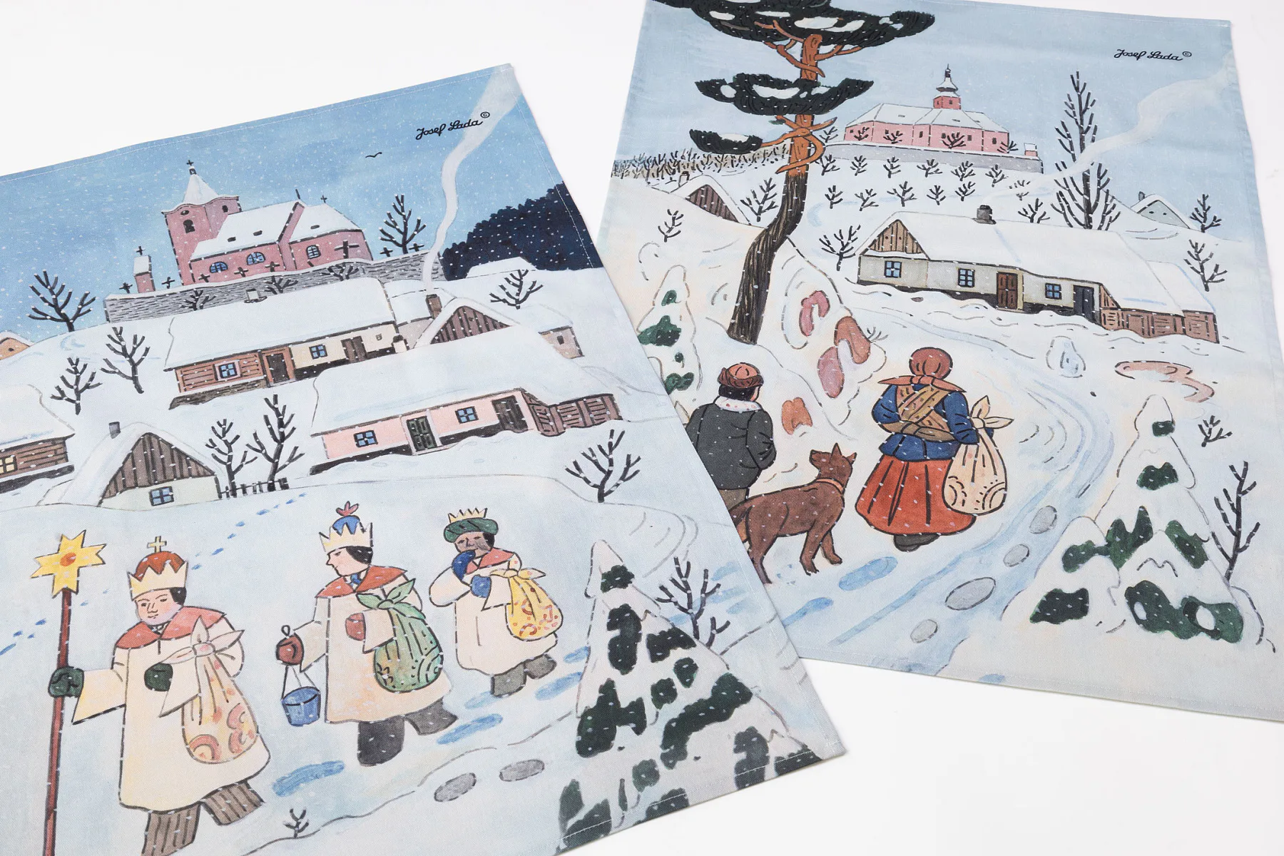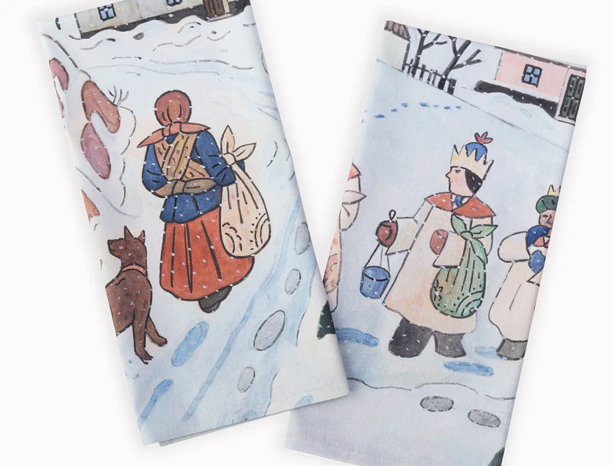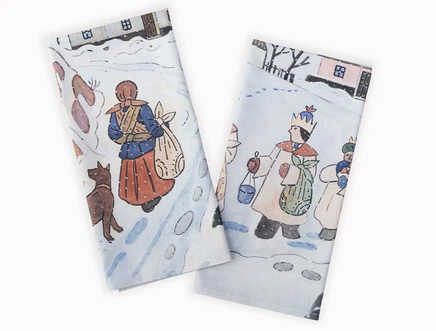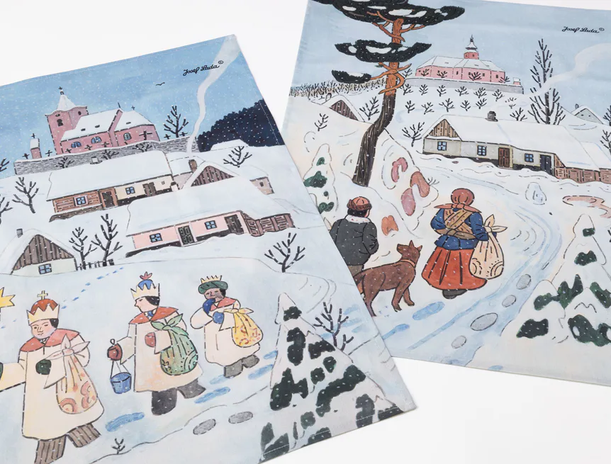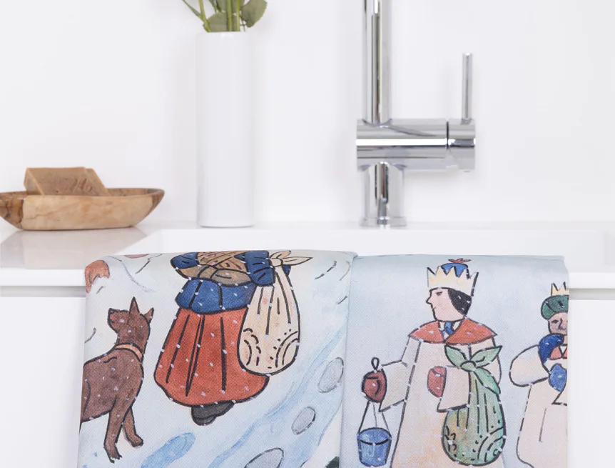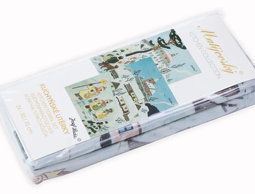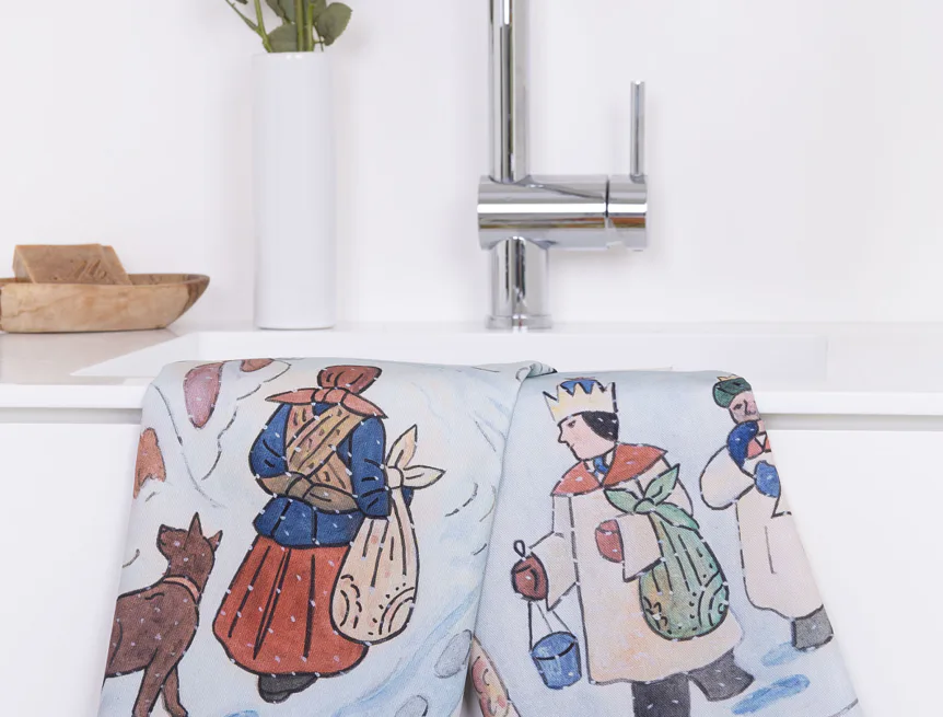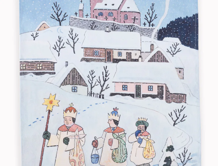 Kuchyňské utěrky Koleda Tříkrálová se díky nejmodernější digitální tiskové technologii pyšní nádhernými barvami a precizními detaily, které vykreslují autentickou ladovskou poetiku.