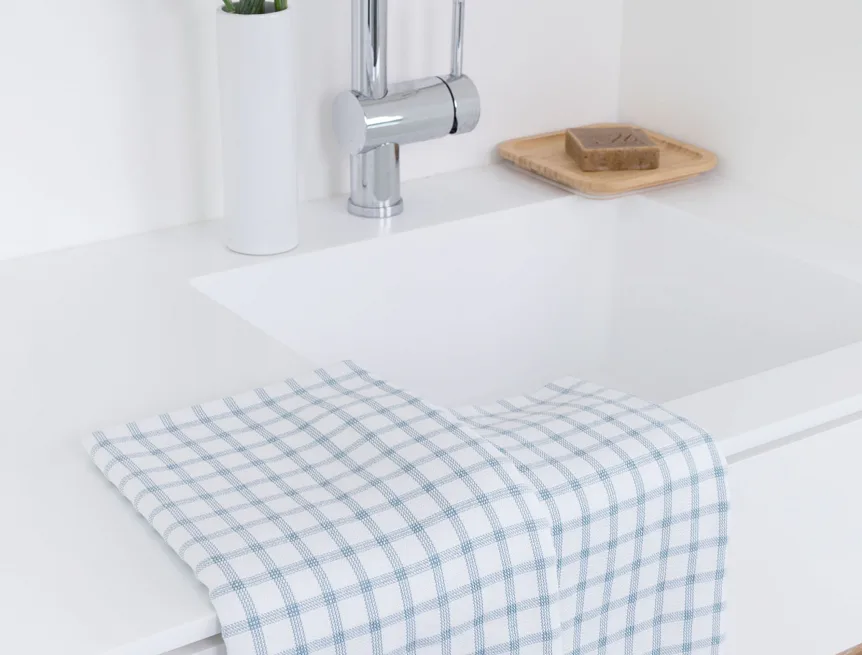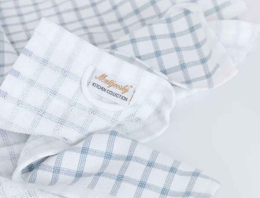 Kuchyňské utěrky Kostky vynikají svým praktickým provedením a nadčasovým designem. Vrchní strana utěrky je hladká s jednoduchým kostkovaným vzorem, spodní stranu tvoří hebké bílé froté s prosvítajícím motivem kostek z vrchní strany. Díky optimální gramáži utěrky výborně sají a velmi rychle schnou. Utěrky mají všechny čtyři strany lemované a jsou opatřeny praktickým poutkem.