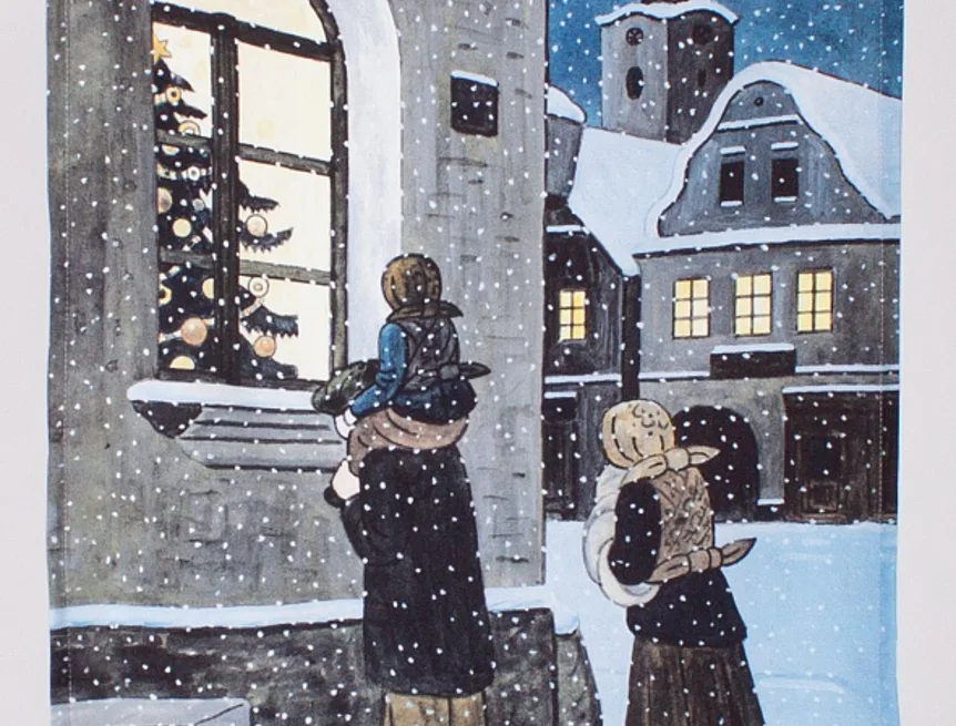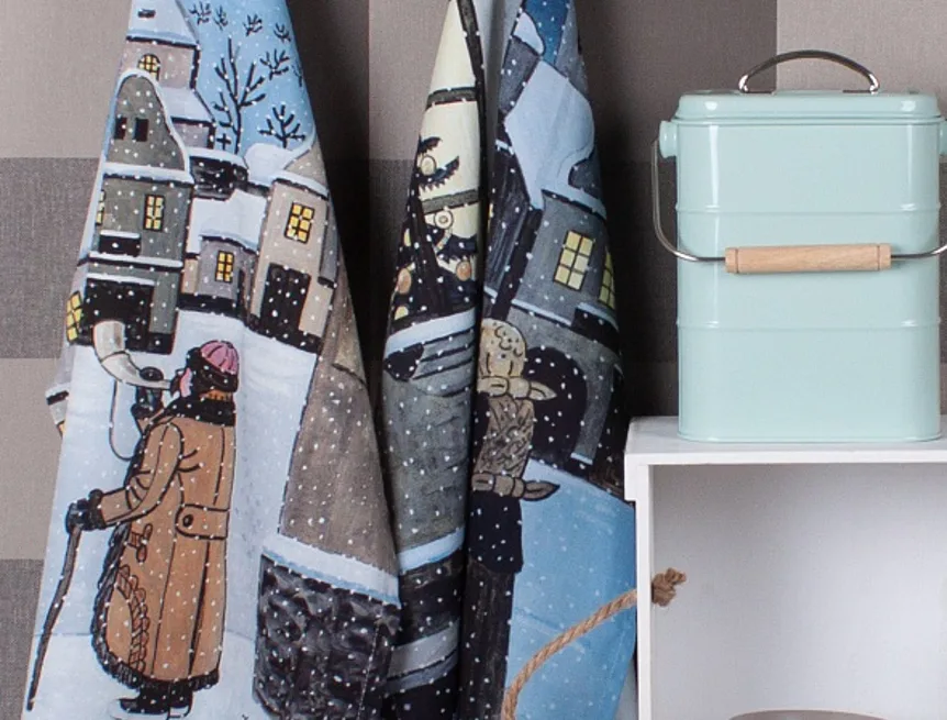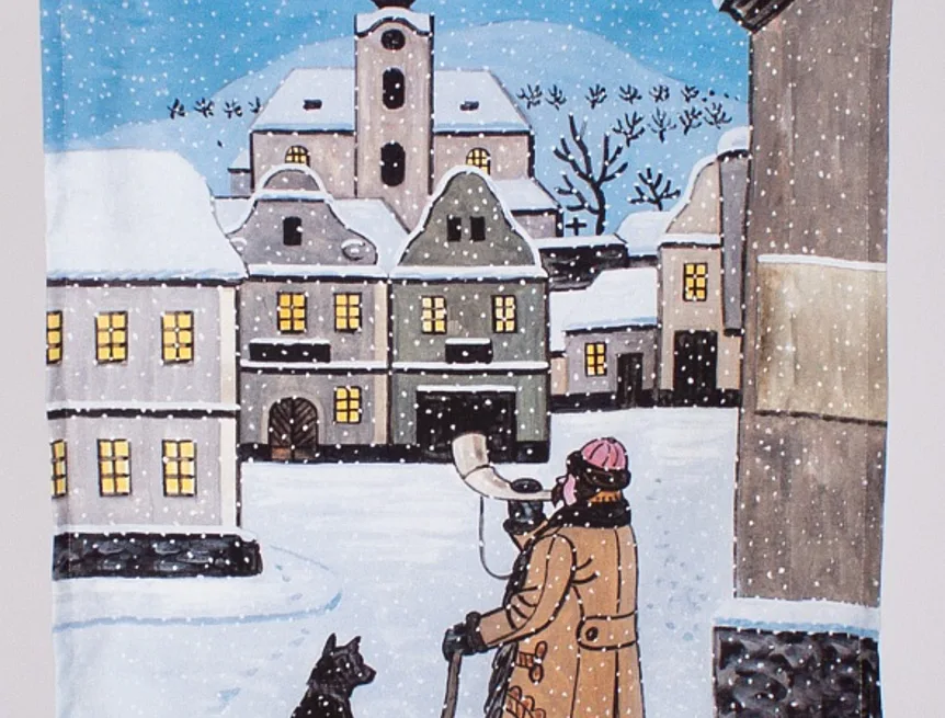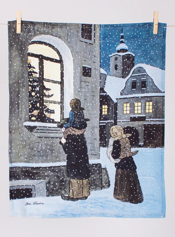 Kuchyňské utěrky Ladovská zima s motivy obrázků Okno se stromkem a Ponocný se díky nejmodernější digitální tiskové technologii pyšní nádhernými barvami a precizními detaily, které vykreslují autentickou ladovskou poetiku.