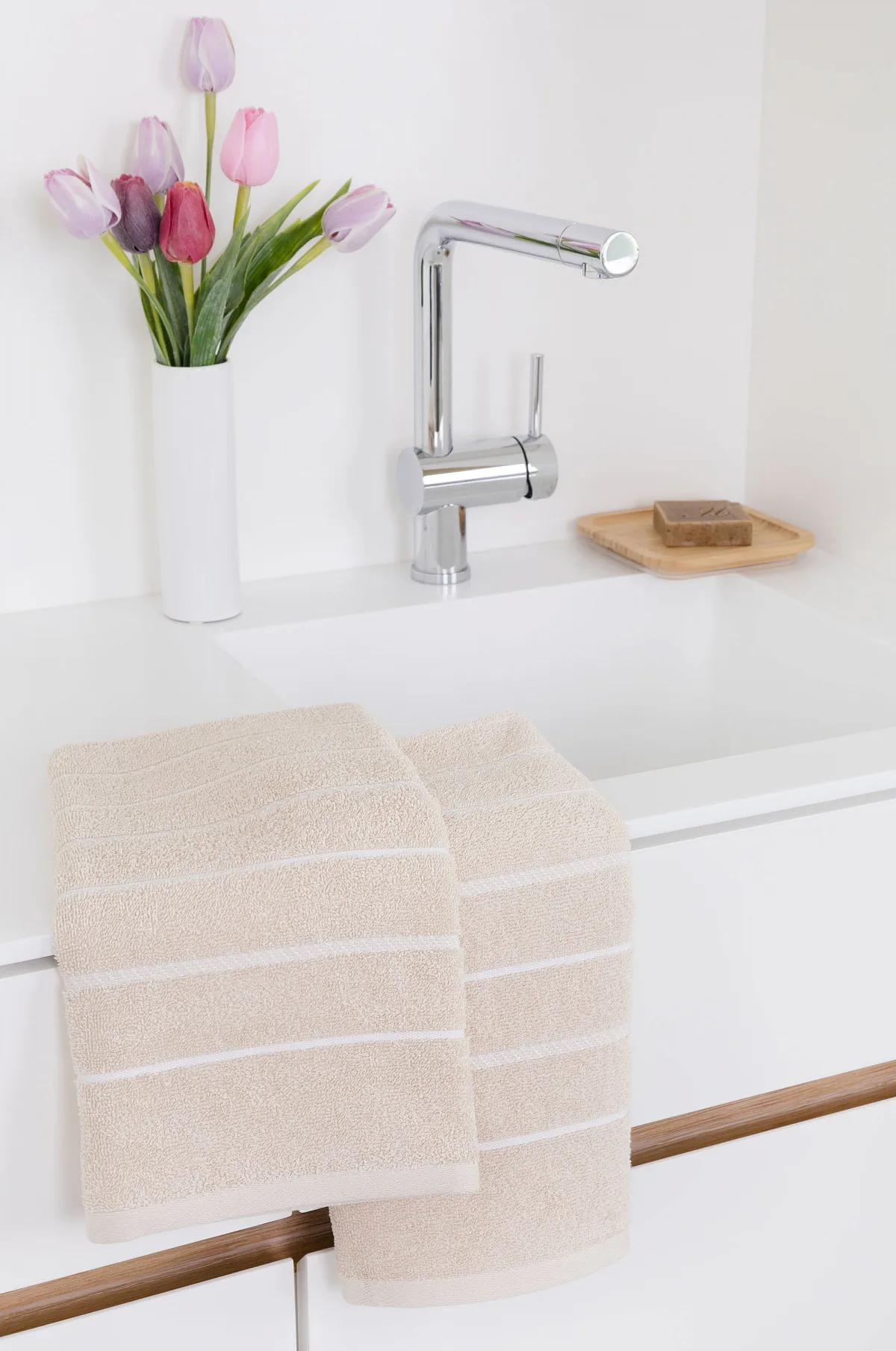 Kuchyňské utěrky Mona zdobí na vrchní straně smyčkového froté elegantní bílé proužky, na spodní straně utěrky jsou tyto proužky v barvě froté. Utěrky jsou navrženy tak, aby měly ideální absorpční vlastnosti a současně rychle schly. Utěrky jsou ze všech čtyř stran lemované a jsou opatřeny praktickým poutkem.