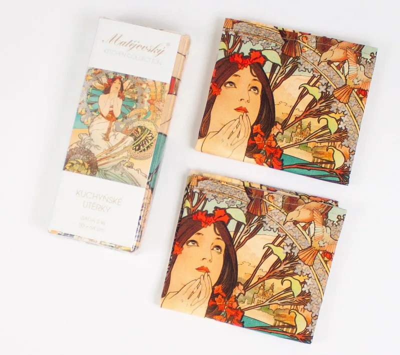 Kolekce bavlněných kuchyňských utěrek s kresbami Alfonse Muchy vnese do vaší kuchyně jediněčnou atmosféru. Nejmodernější digitální tisková technologie zajišťuje zářivé barvy a precizní detaily.