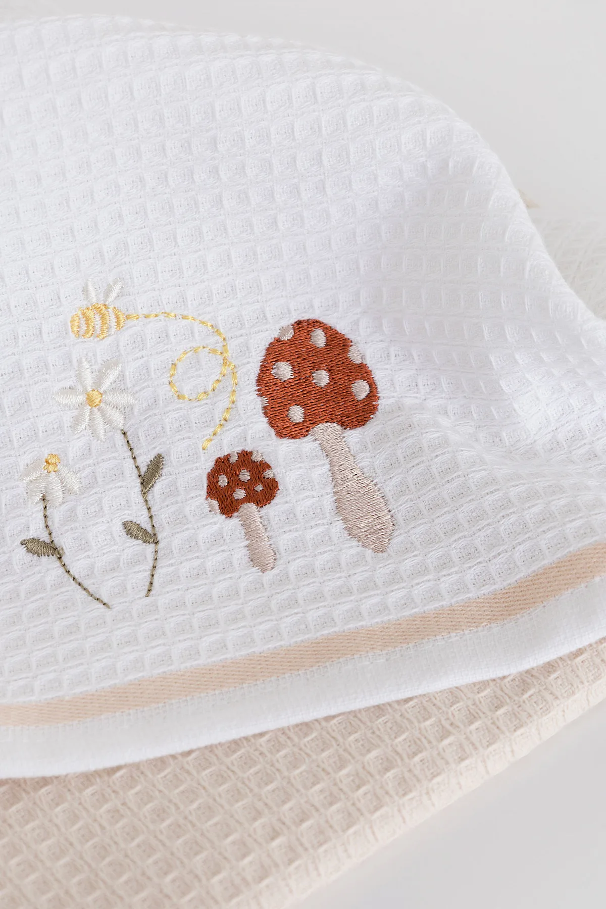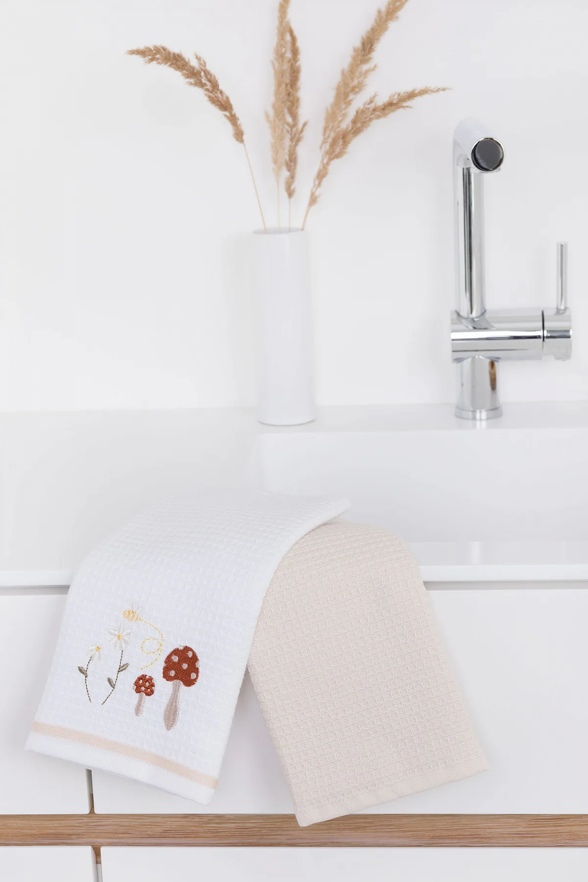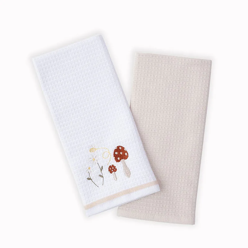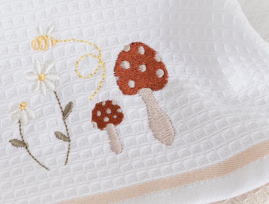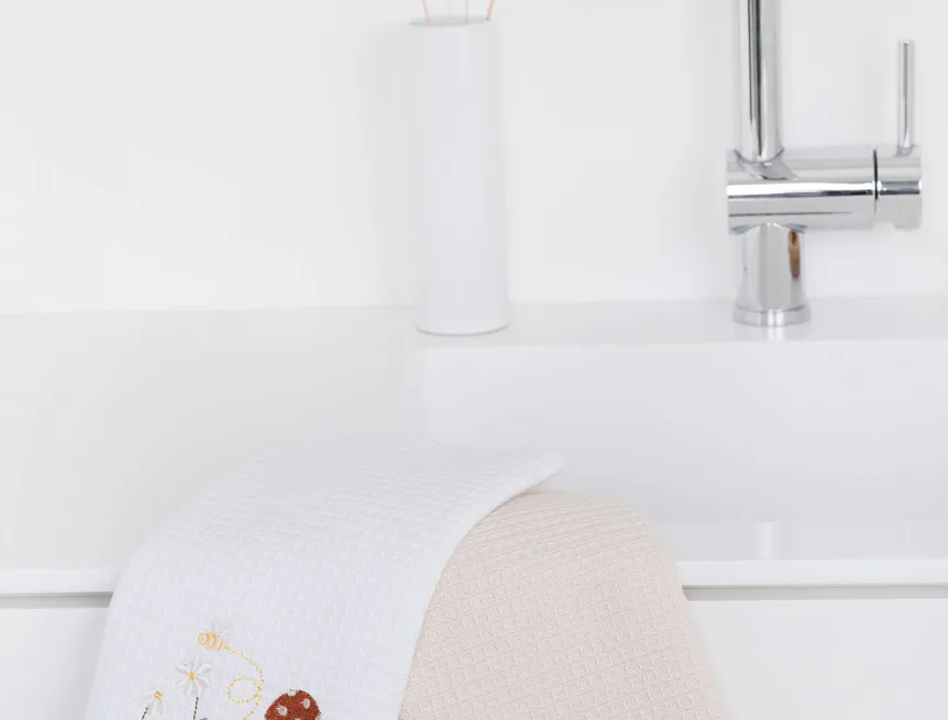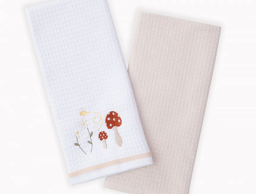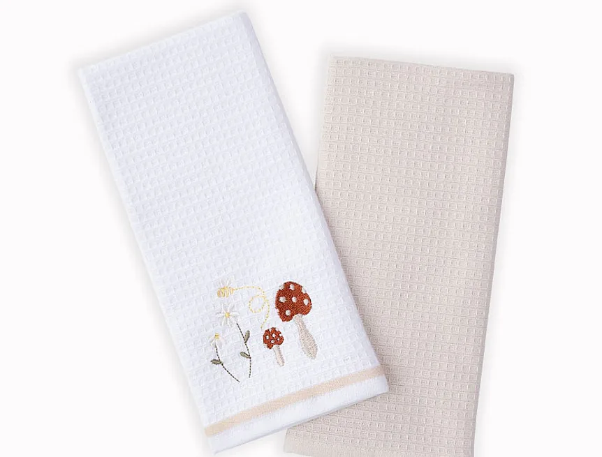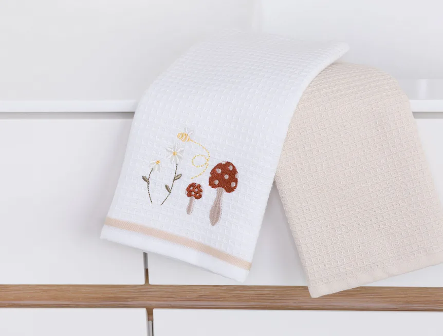 Atraktivní a precizně provedené lesklé výšivky se skvěle doplňují s okouzlujícími barevnými odstíny napříč celou kolekcí vaflových utěrek.
