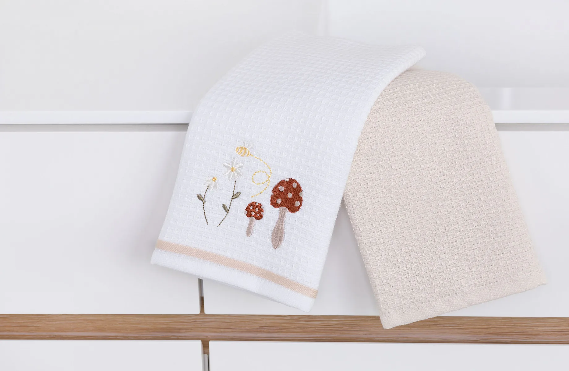 • 1x bílá utěrka s výšivkou a béžovou bordurou