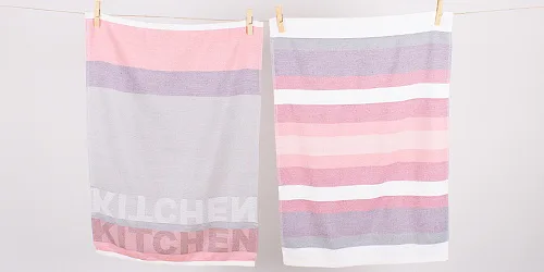 Kuchyňské utěrky Siesta vynikají svým praktickým provedením a moderním designem. Základní barvu tvoří tóny šedé doplněné o odstíny růžové a fialové.Vrchní strana utěrky je hladká s jemnou vlnkovou strukturou, spodní stranu tvoří hebké bílé froté. Jednu z utěrek charakterizuje decentní pruhovaný vzor, na druhé vás na první pohled zaujme vytkaný nápis Kitchen. Utěrky mají všechny čtyři strany lemované a jsou opatřeny praktickým poutkem pro zavěšení.