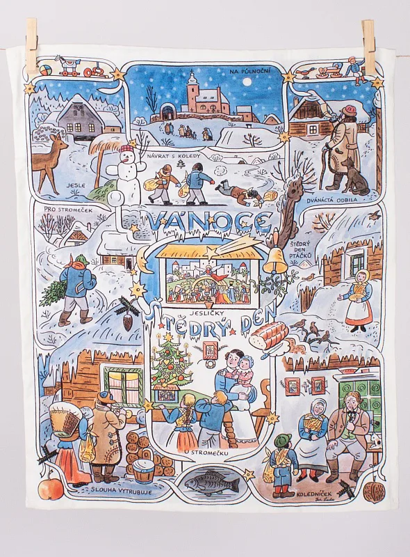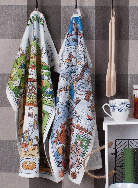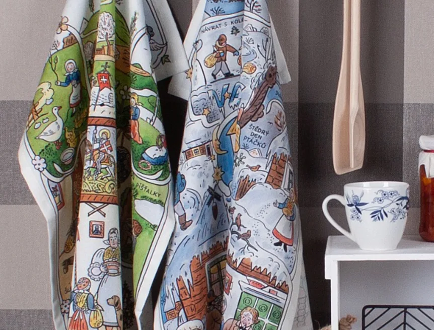 Kuchyňské utěrky Velikonoce & Vánoce se díky nejmodernější digitální tiskové technologii pyšní nádhernými barvami a precizními detaily, které vykreslují autentickou ladovskou poetiku.