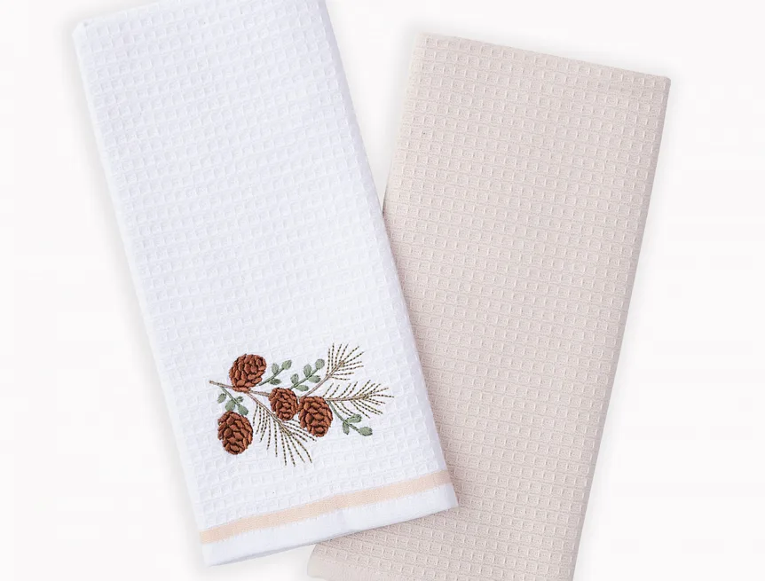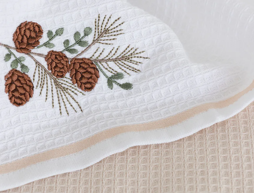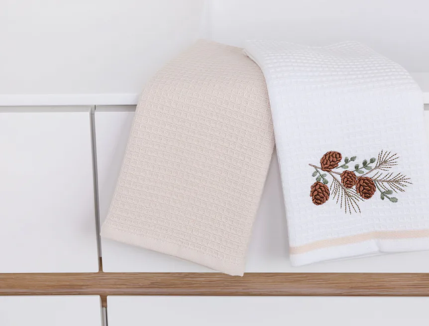 Atraktivní a precizně provedené lesklé výšivky se skvěle doplňují s okouzlujícími barevnými odstíny napříč celou kolekcí vaflových utěrek.