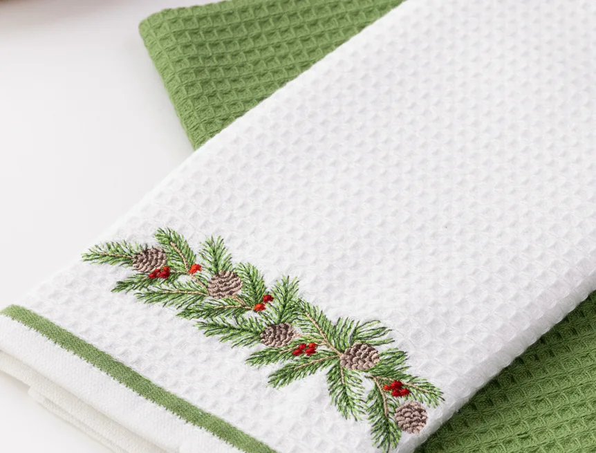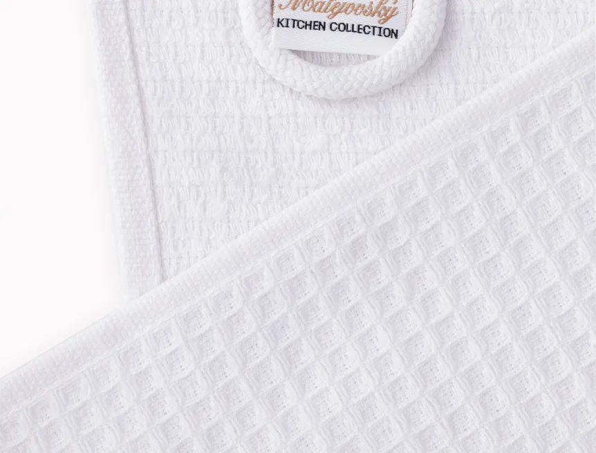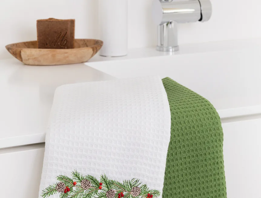 Atraktivní a precizně provedené lesklé výšivky se skvěle doplňují s okouzlujícími barevnými odstíny napříč celou kolekcí vaflových utěrek.