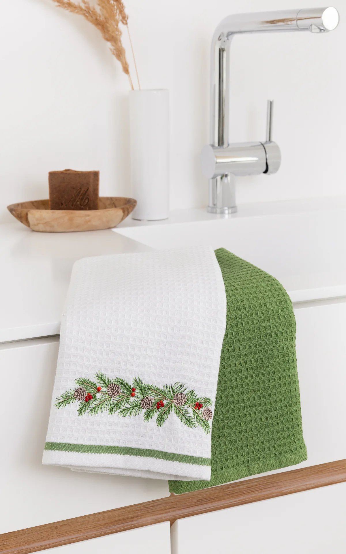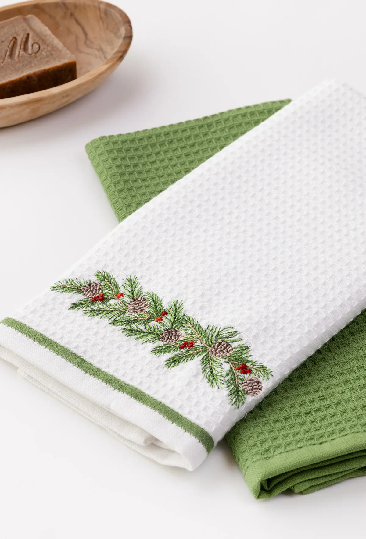 - 1x bílá utěrka s výšivkou a zelenou bordurou