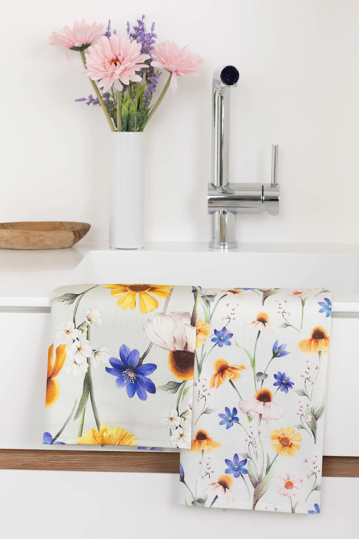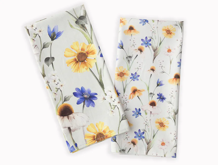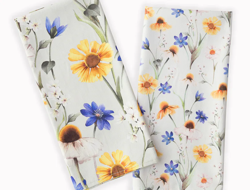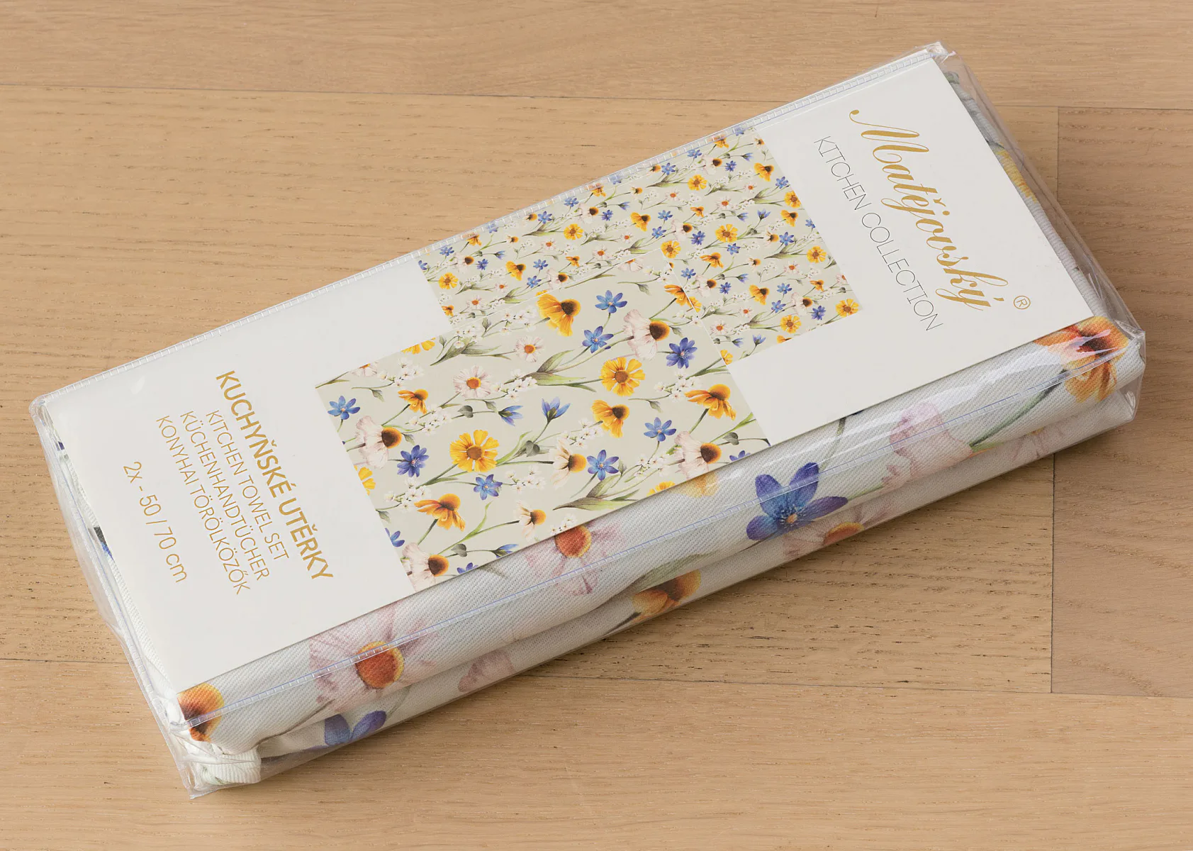 Potisk: jednostranný, obě utěrky zachycují stejný florální motiv s odlišnou velikostí květin