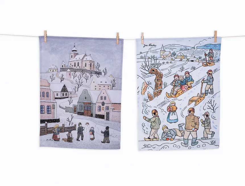 Kuchyňské utěrky Zima & Zimní zábavy se díky nejmodernější digitální tiskové technologii pyšní nádhernými barvami a precizními detaily, které vykreslují autentickou ladovskou poetiku.