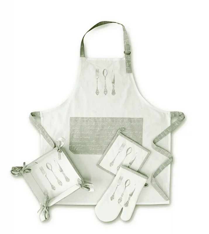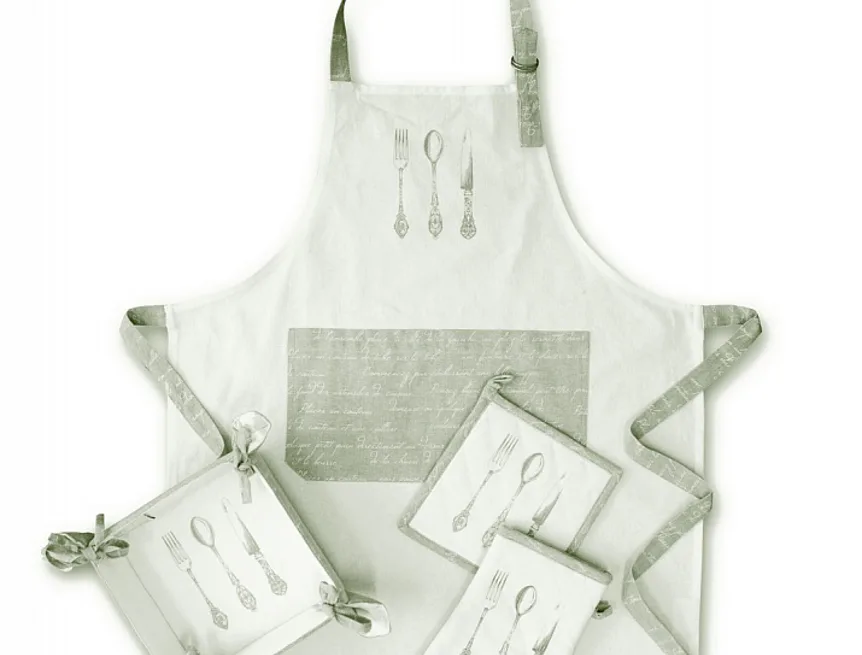 Doplňky, které dodají Vaší kuchyni eleganci a styl. Decentní barevná kombinace bílé, na které dominuje vzor kuchyňského příboru a béžovo šedé, doplněná drobným vzorem psacího písma, dává celému setu noblesní nádech.