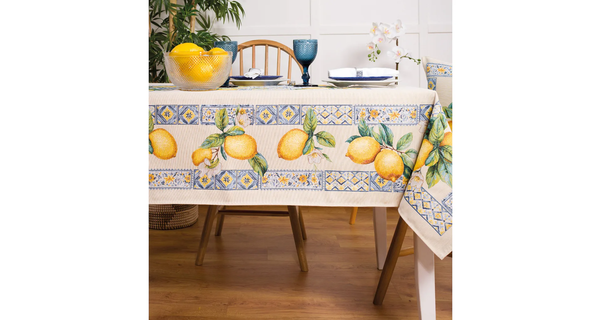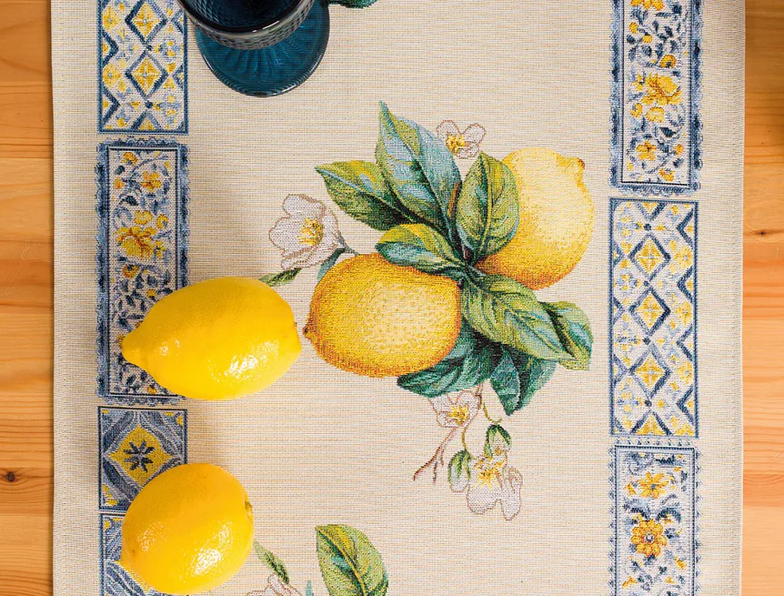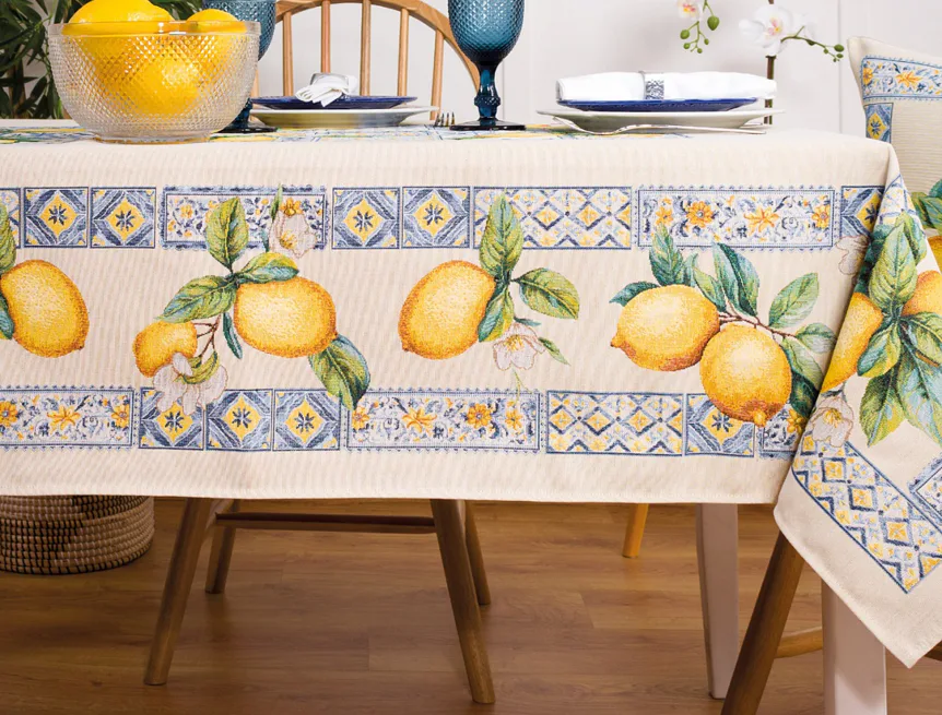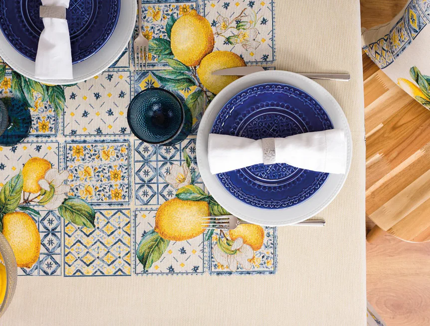 Obrus Laymun s motívom citrusov zdobený nápaditým lemovaním je ideálnym doplnkom pre každú príležitosť. Svieži design s rustikálnym nádychom sa spája s praktickosťou vďaka pevnému a odolnému materiálu.