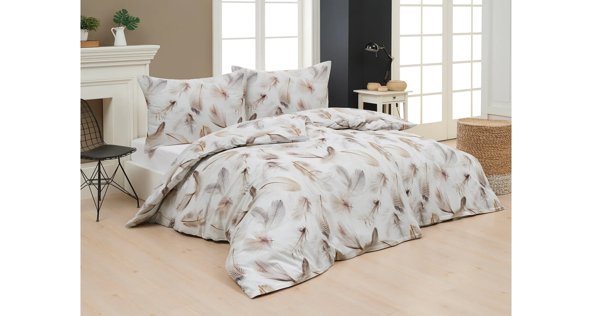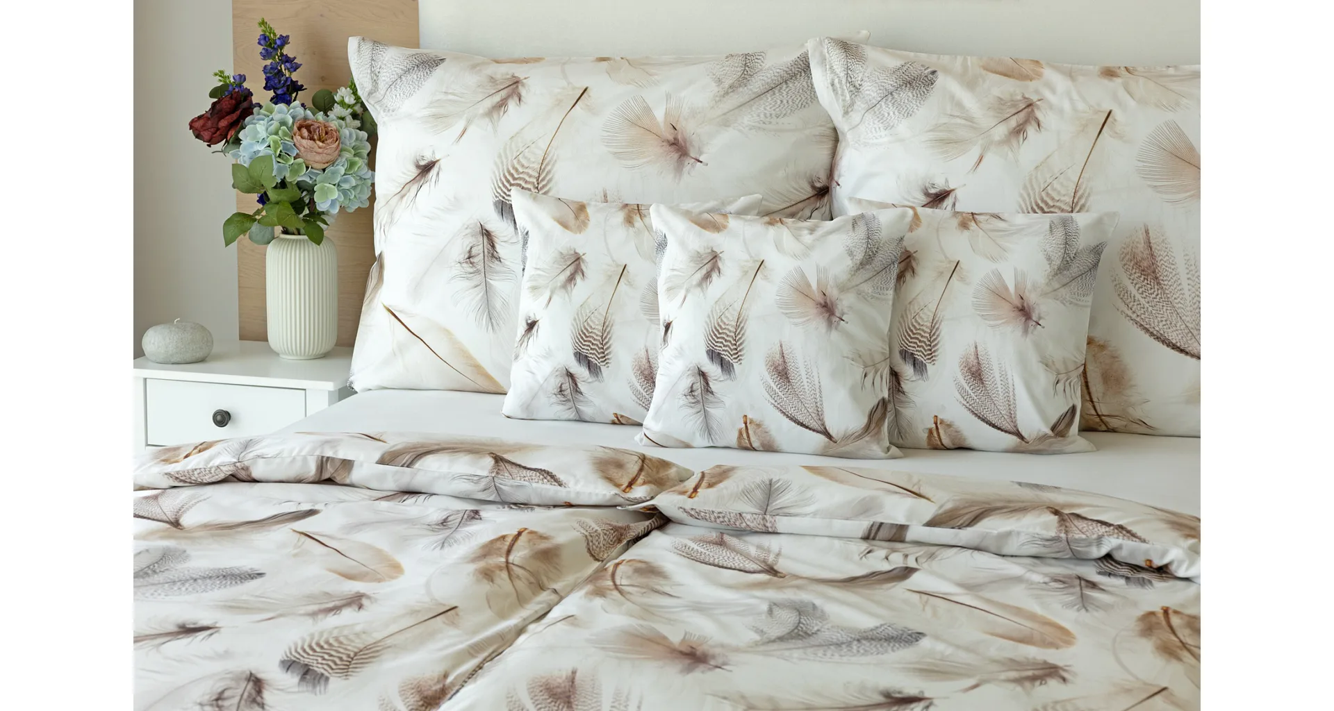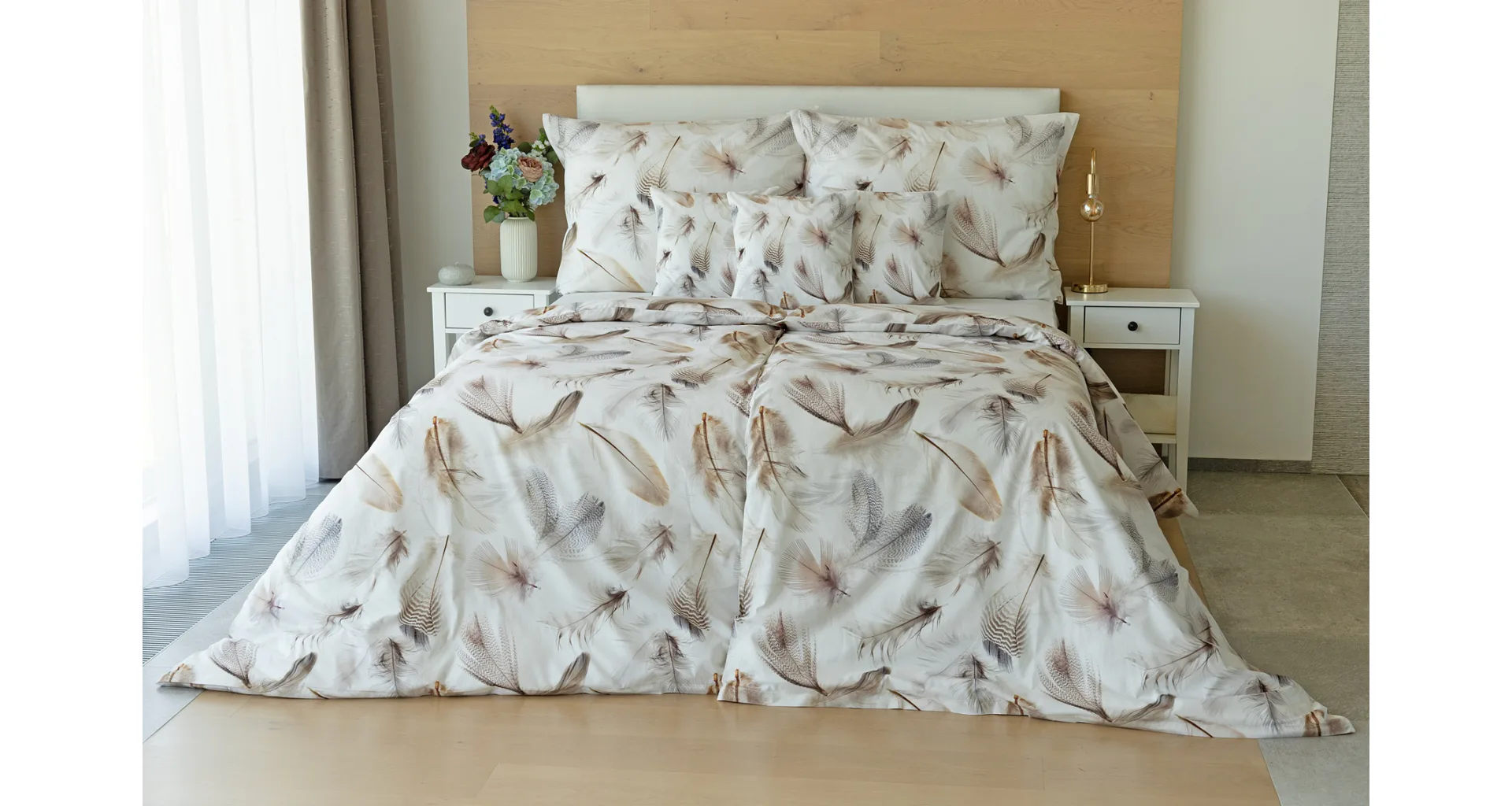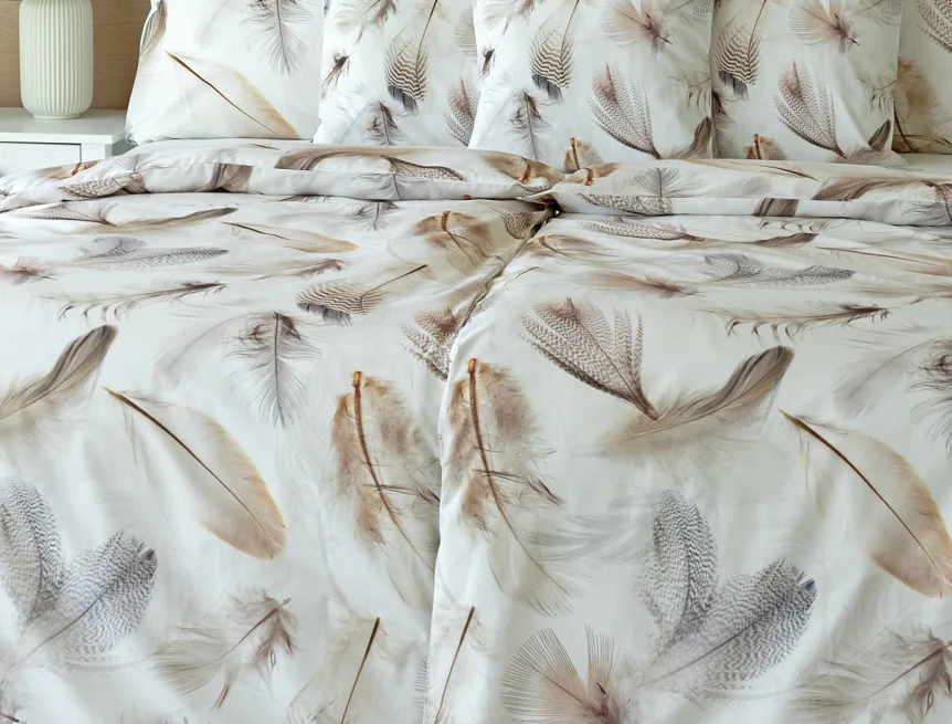 Bavlna ľahká a hebká ako perie, na dotyk aj na pohľad. Túto predstavu splnia obliečky Liberty. Po celej ploche v krémovo bielom odtieni sú posiate hnedým a šedým perím, ktoré vyniká v precíznom detaile vďaka najmodernejšej digitálnej tlači.