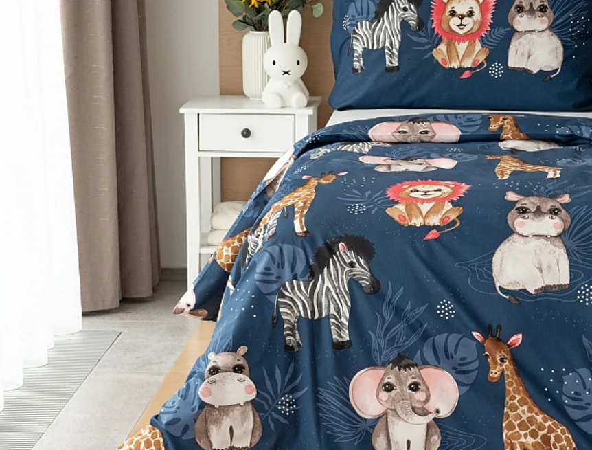 Bavlnené obliečky Little Jungle rozžiaria oči aj detskú izbu. Rozkošné exotické zvieratká na temno modrom podklade budú vyprevádzať deti do sveta snov noc čo noc.