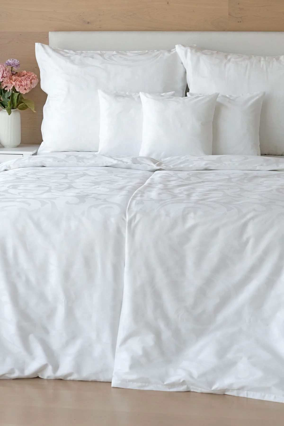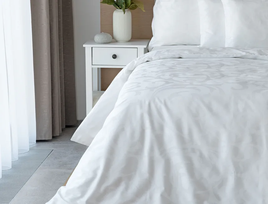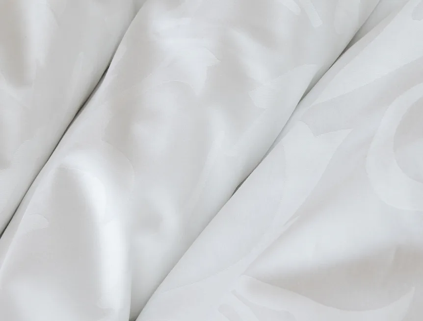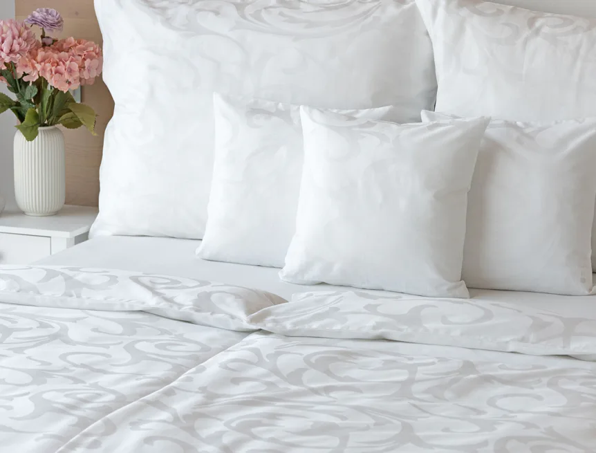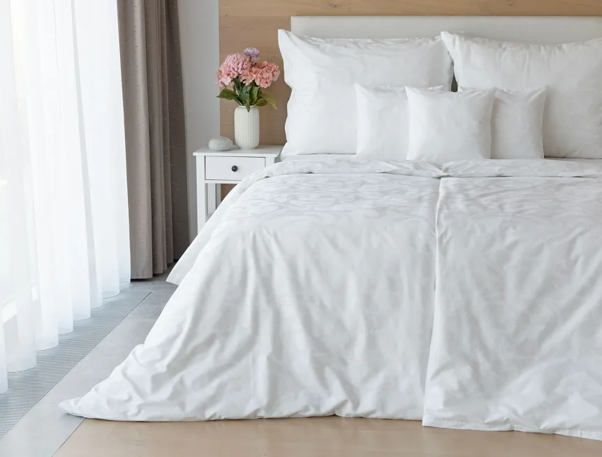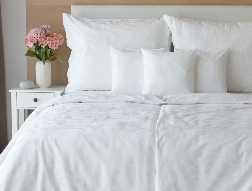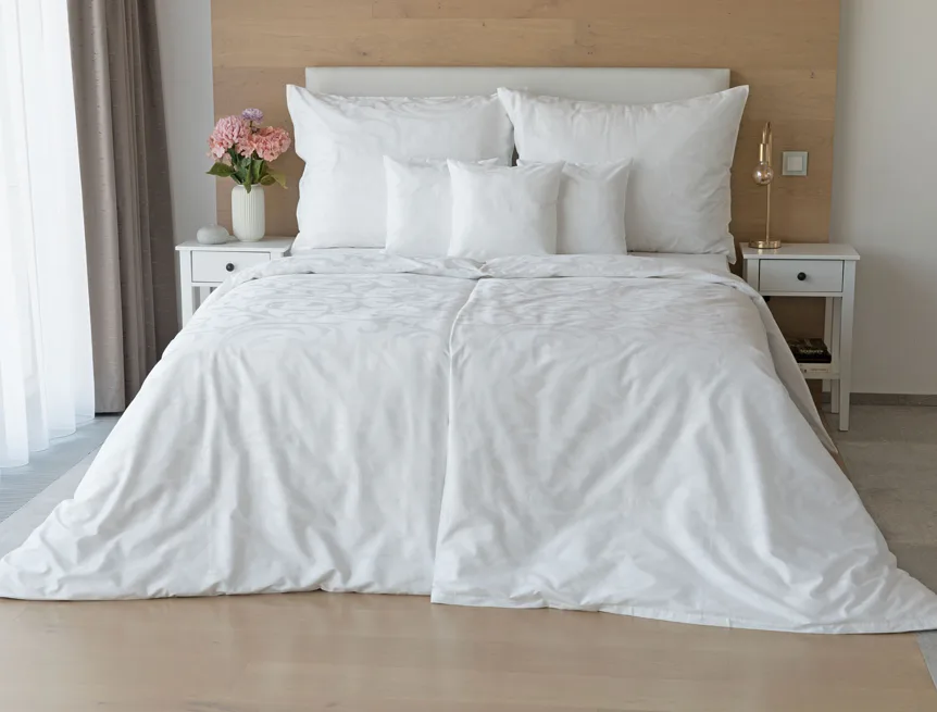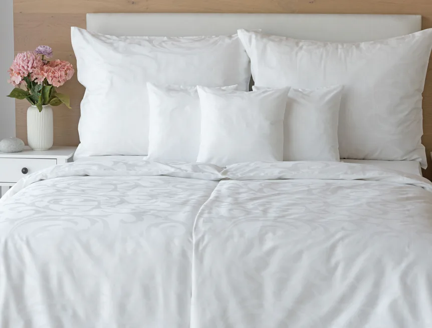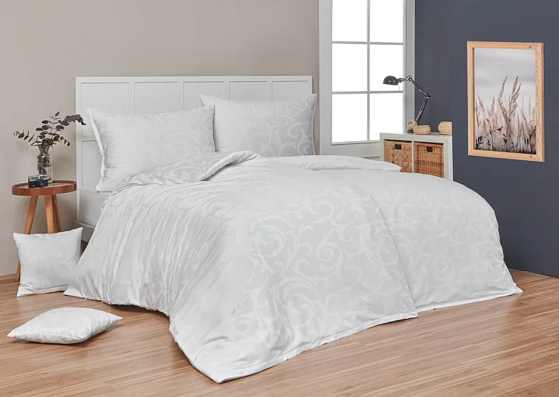 Čisto biela damašková posteľná bielizeň v luxusnom žakárovom vyhotovení s decentným florálnym vzorom, ktorý pôsobí na posteli viac ako elegantne. Posteľná bielizeň je vyrobená z vysokokvalitnej česanej a mercerovanej bavlnenej priadze. Hotelová posteľná bielizeň má tzv. hotelový uzáver (obliečka na vankúš aj prikrývku má uzáver riešený tzv. vreckom = presahom látky na založenie náplne). Foto je len ilustračné. Posteľnú bielizeň možno žehliť, prať môžete až na 60 °C.
