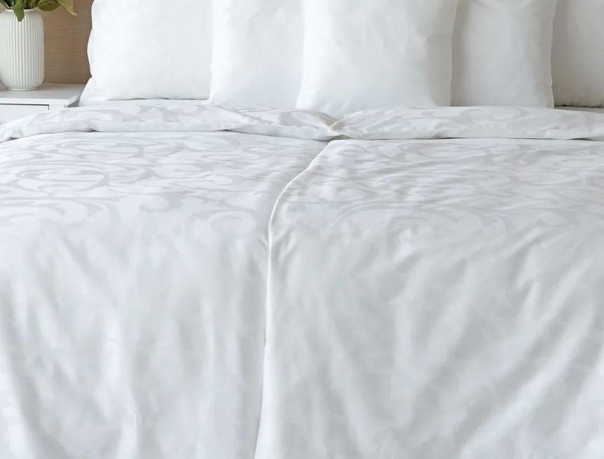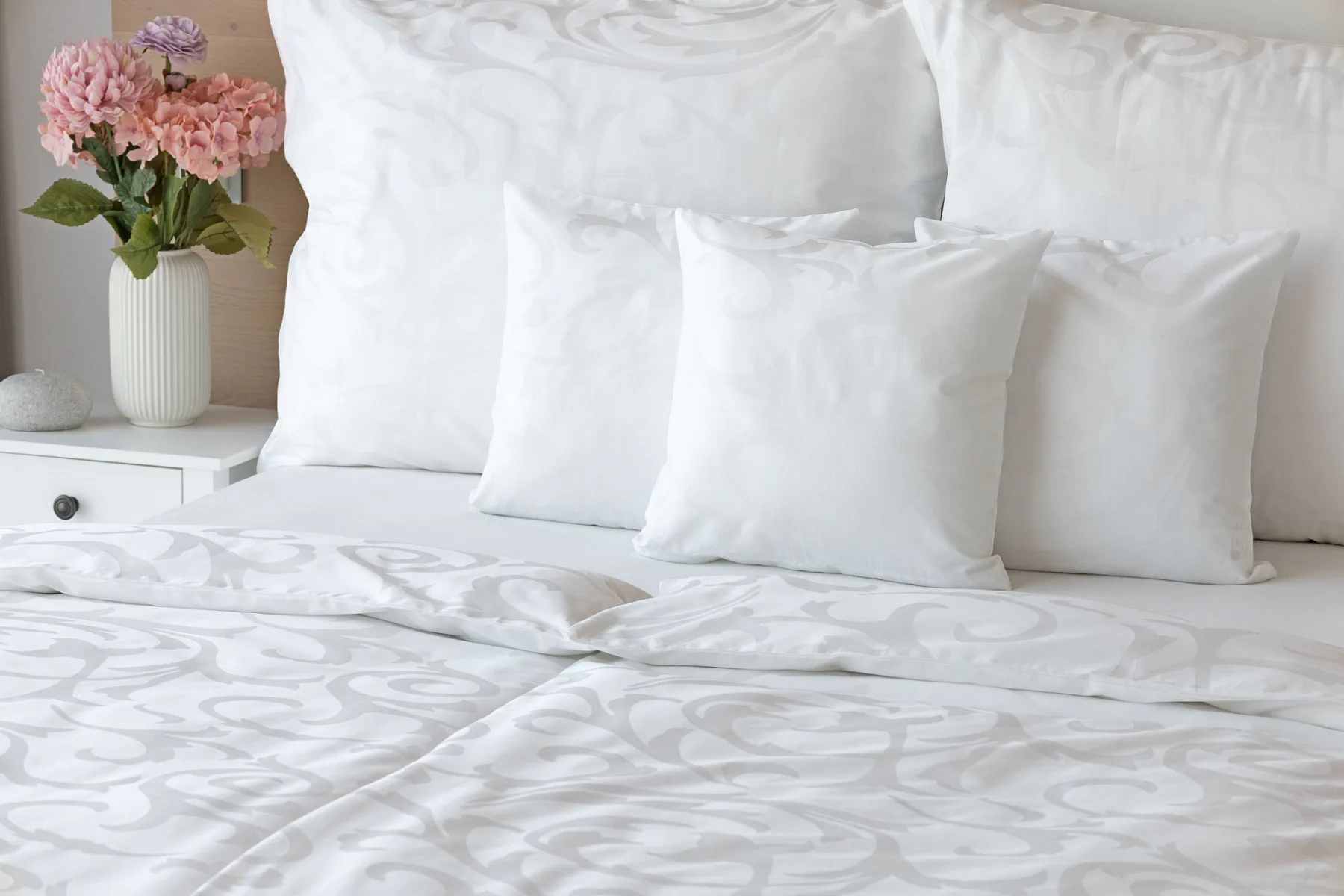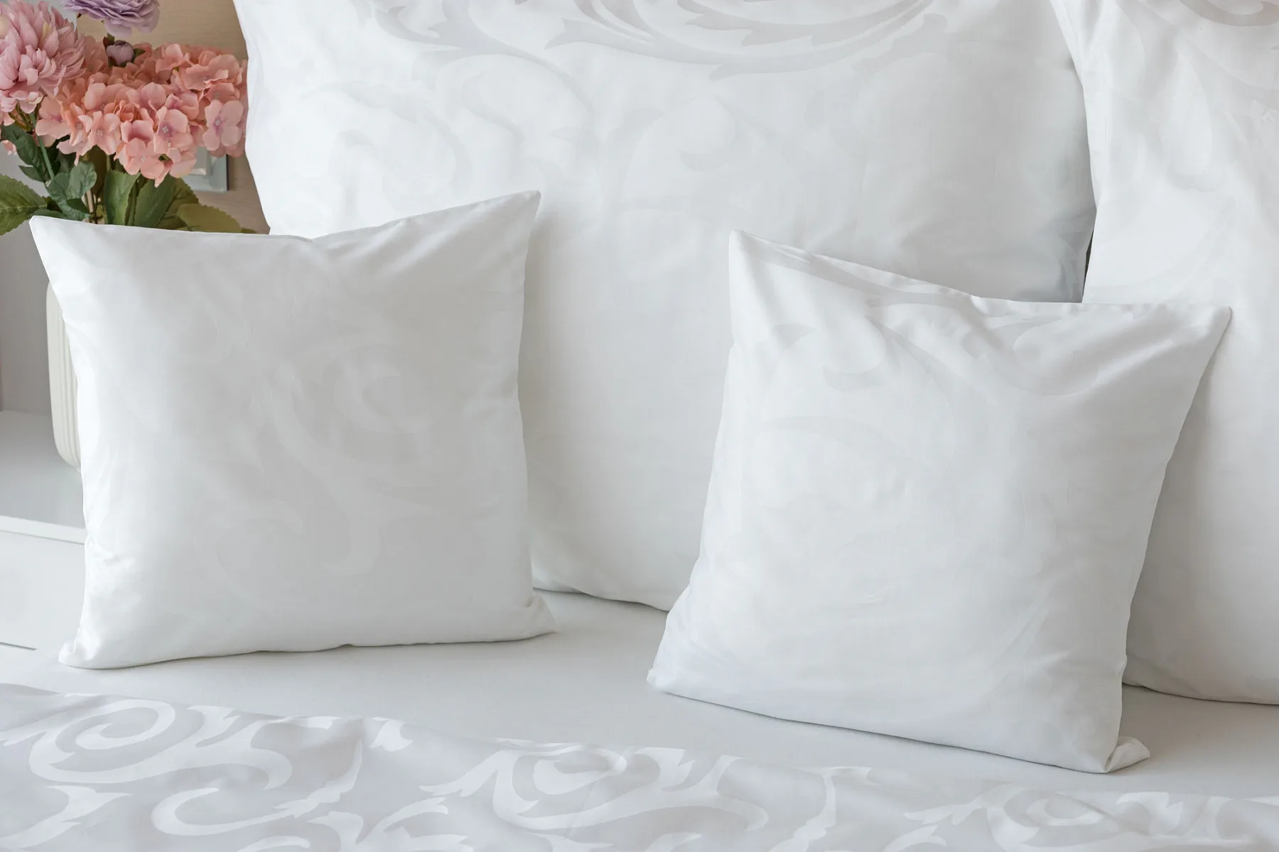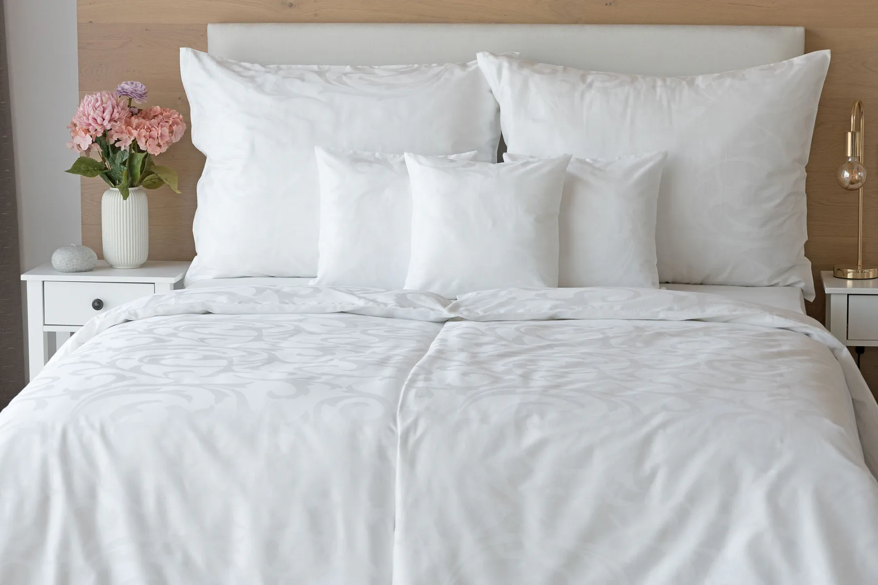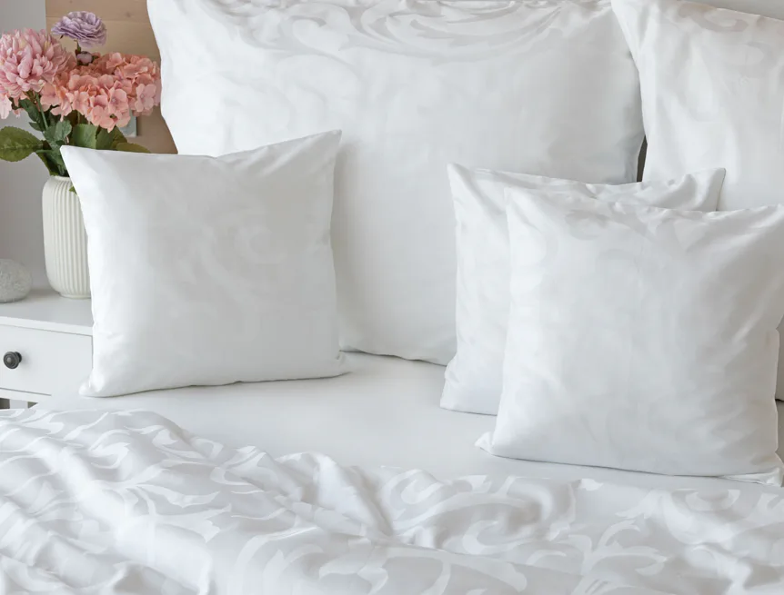 Čisto biela damašková posteľná bielizeň v luxusnom žakárovom vyhotovení s decentným florálnym vzorom, ktorý pôsobí na posteli viac ako elegantne. Posteľná bielizeň je vyrobená z vysokokvalitnej česanej a mercerovanej bavlnenej priadze. Hotelová posteľná bielizeň má tzv. hotelový uzáver (obliečka na vankúš aj prikrývku má uzáver riešený tzv. vreckom = presahom látky na založenie náplne). Foto je len ilustračné. Posteľnú bielizeň možno žehliť, prať môžete až na 60 °C.