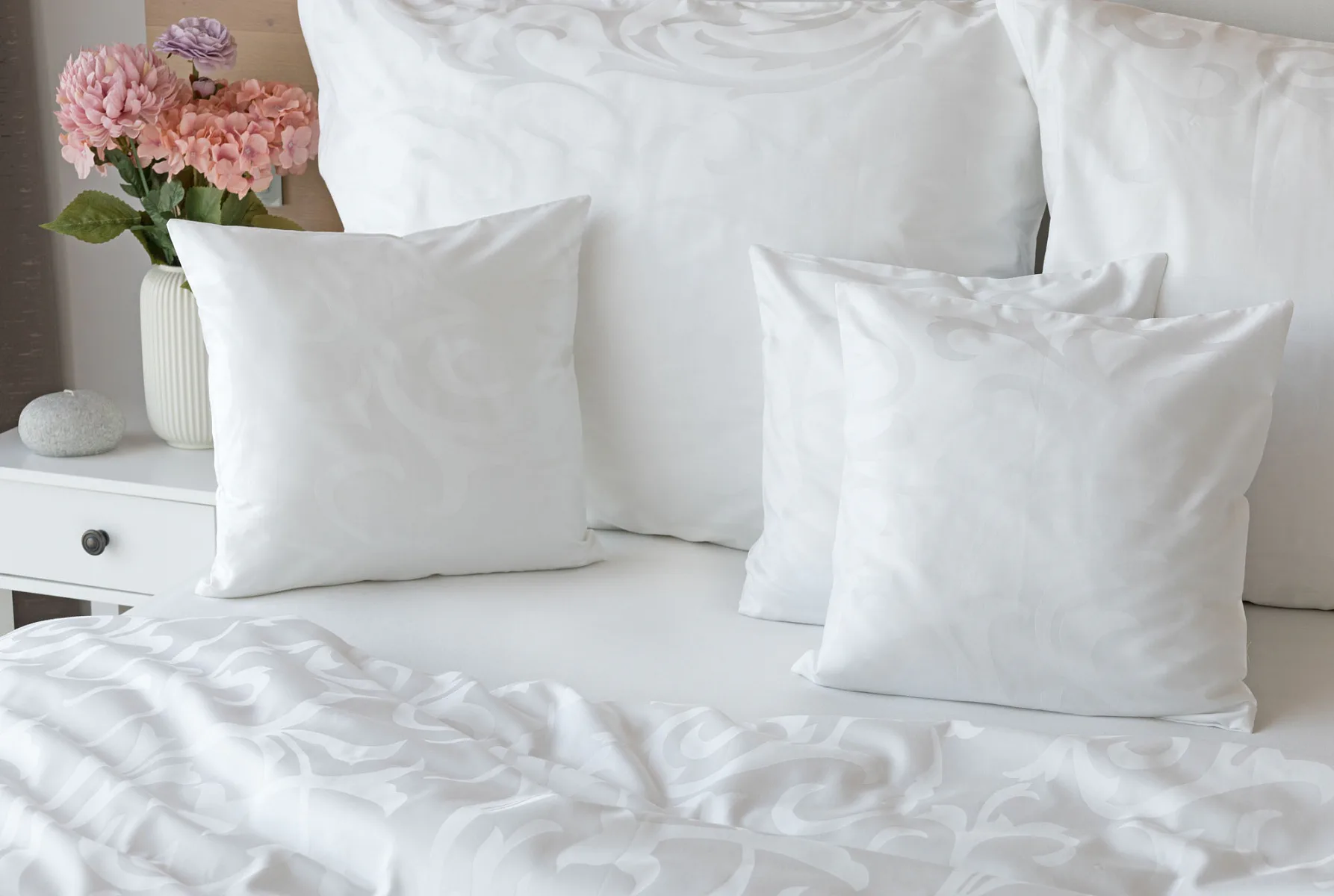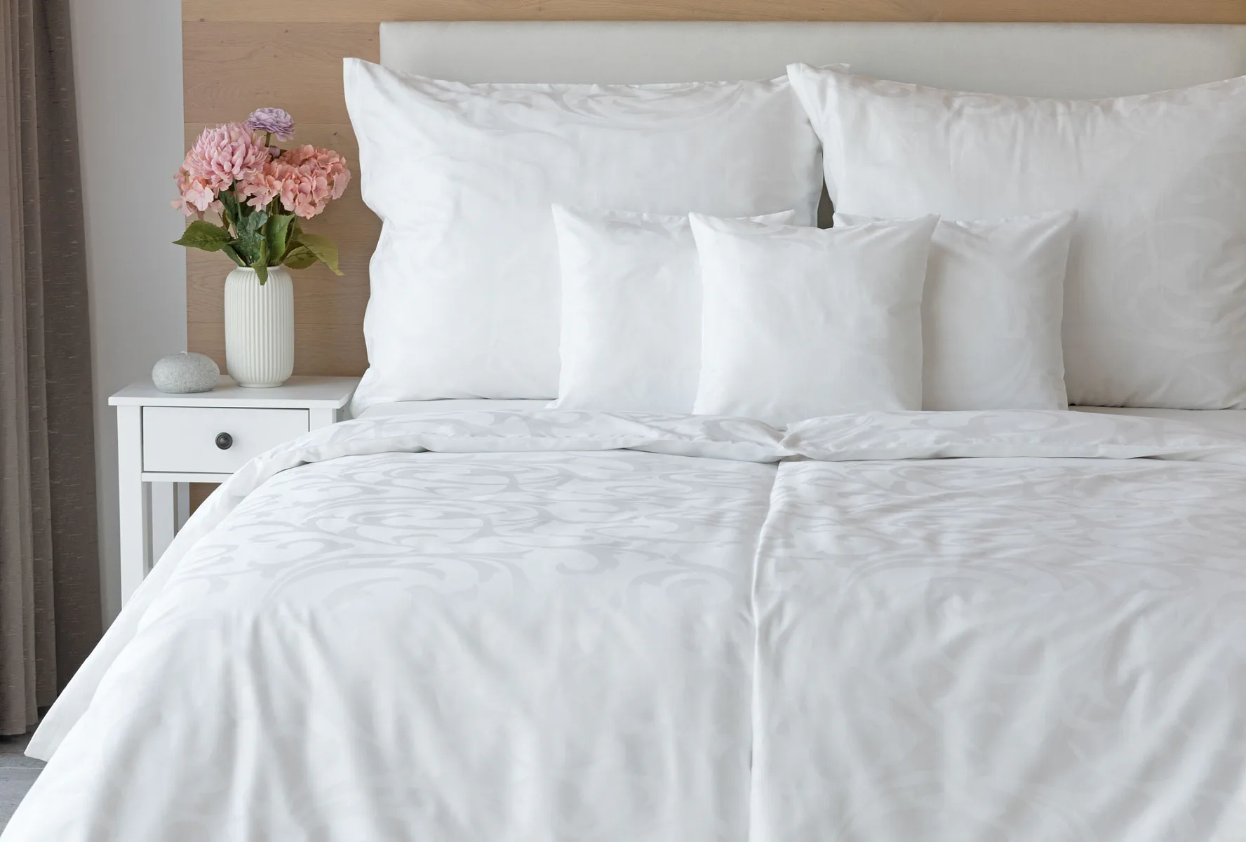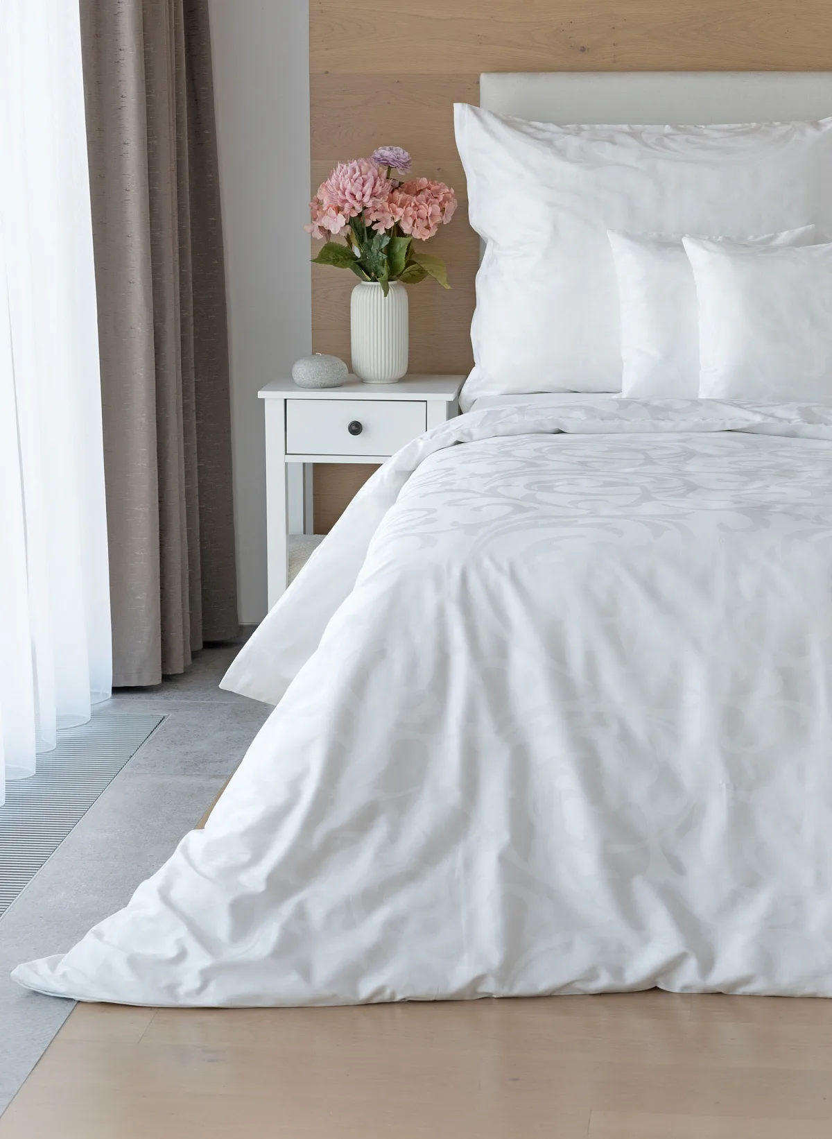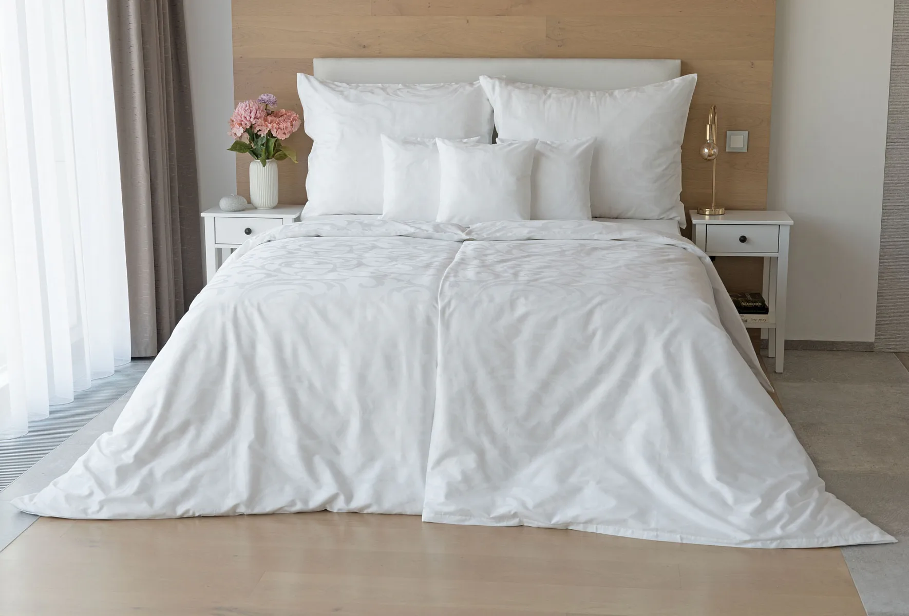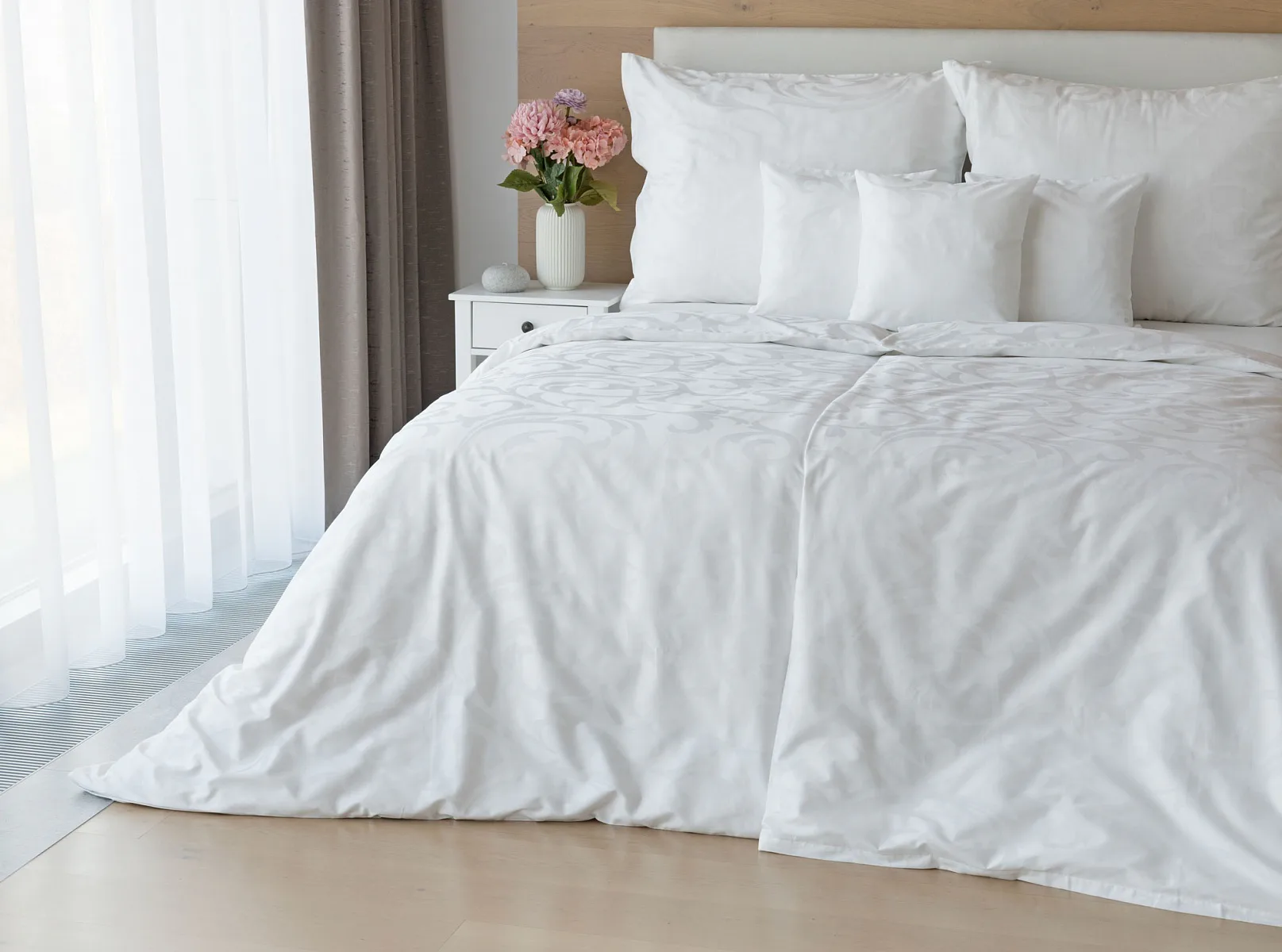 Čisto biela damašková posteľná bielizeň v luxusnom žakárovom vyhotovení s decentným florálnym vzorom, ktorý pôsobí na posteli viac ako elegantne. Posteľná bielizeň je vyrobená z vysokokvalitnej česanej a mercerovanej bavlnenej priadze. Hotelová posteľná bielizeň má tzv. hotelový uzáver (obliečka na vankúš aj prikrývku má uzáver riešený tzv. vreckom = presahom látky na založenie náplne). Foto je len ilustračné. Posteľnú bielizeň možno žehliť, prať môžete až na 60 °C.