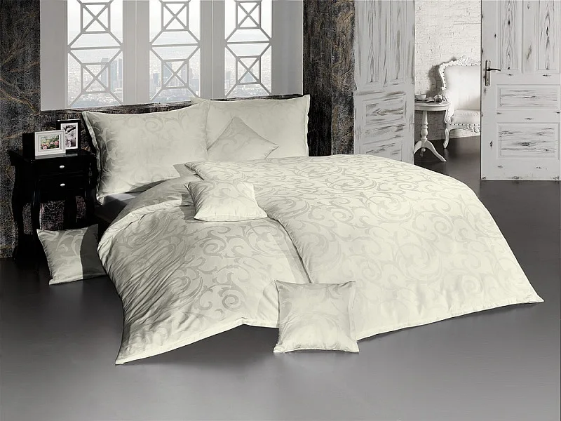Svetlobéžová damašková posteľná bielizeň v luxusnom žakárovom vyhotovení s decentným florálnym vzorom, ktorý pôsobí na lôžku viac ako elegantne. Posteľná bielizeň je vyrobená z vysokokvalitnej česanej a mercerovanej bavlnenej priadze. Hotelová posteľná bielizeň má tzv. hotelový uzáver (obliečka na vankúš aj prikrývku má uzáver riešený tzv. vreckom = presahom látky na založenie náplne). Foto je len ilustračné. Posteľnú bielizeň možno mangľovať, prať môžete až na 60 °C.