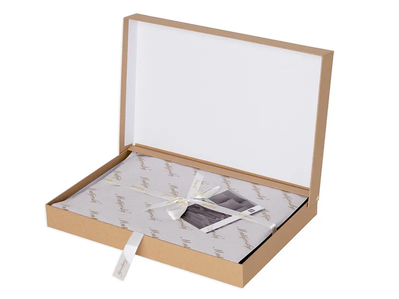 Balenie: Obliečky Luna sú dodávané v luxusnej darčekovej krabici, zabalené do jemného hodvábneho papiera. Obal z prírodných surovín podčiarkuje jedinečnosť tohto 100% prírodného produktu.