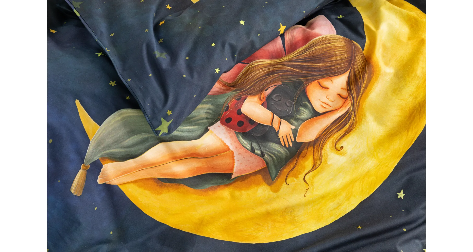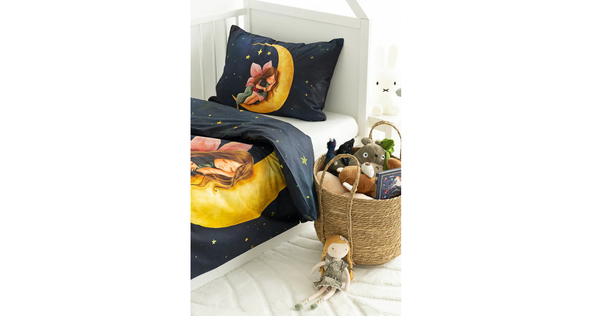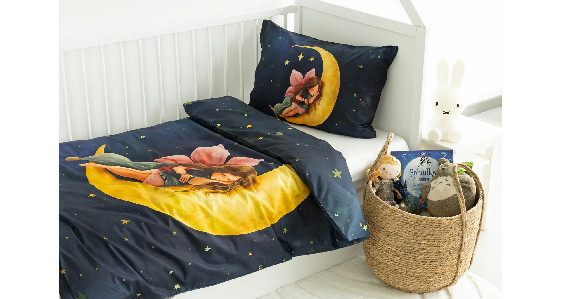 Proměňte dětský pokojíček v kouzelnou říši s bavlněným povlečením Malá víla. Motiv víly spící na měsíci, obklopené hvězdnou oblohou, vnese do dětského pokoje magickou atmosféru. Povlečení je vyrobeno ze 100% prémiové bavlny v úpravě DELUXE, která je jemná na dotek a prodyšná.