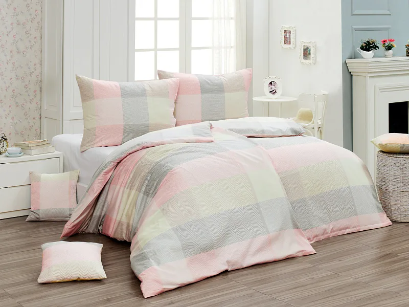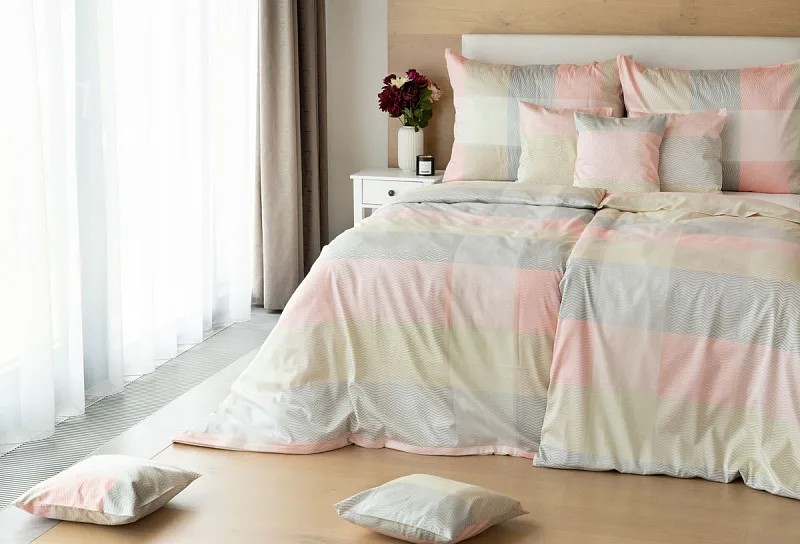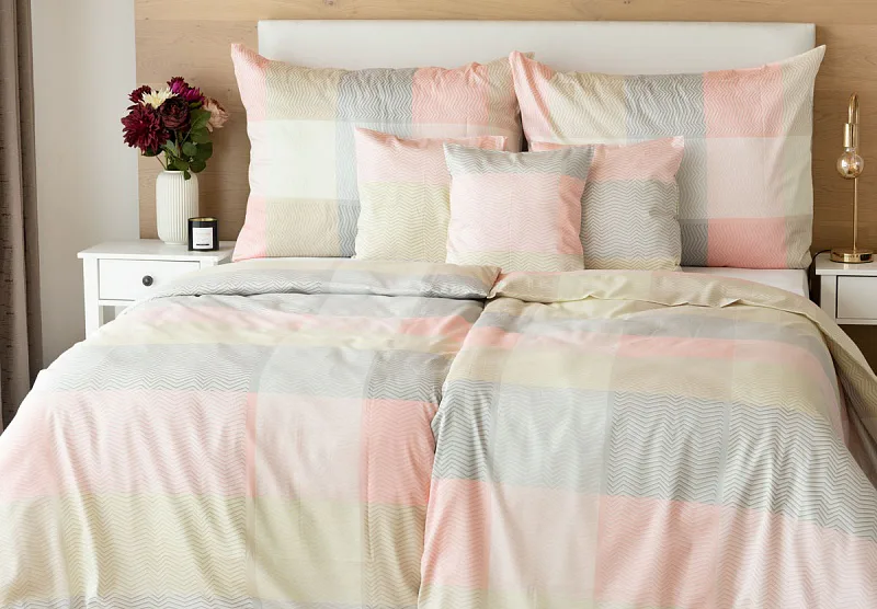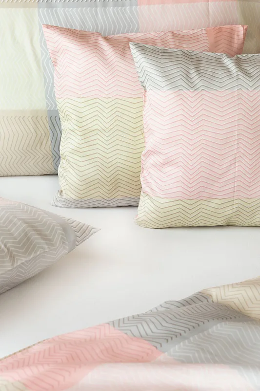 Svieži károvaný motív s cik-cak vzorom v odtieňoch pastelovej lososovej, krémovej a sivej na posteľnej bielizni MANGO bude ozdobou každej spálne. Obliečka na vankúš z každej strany zachytáva inú časť motívu. Prikrývka je z oboch strán rovnaká. Posteľná bielizeň má komfortný zipsový uzáver. Obliečky 40/40 cm sa šijú z rovnakej látky ako obliečka na prikrývku, preto je každá iná.