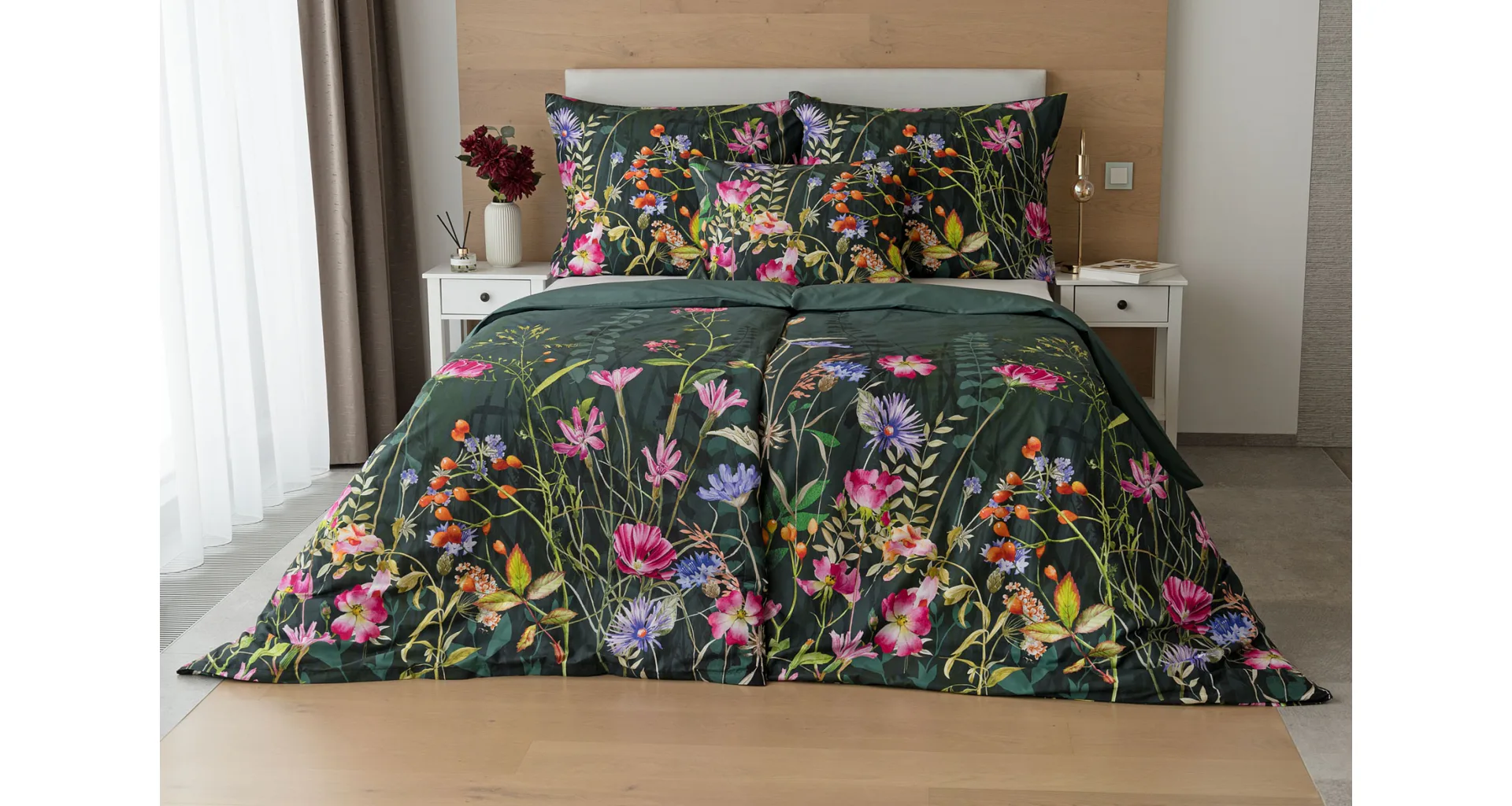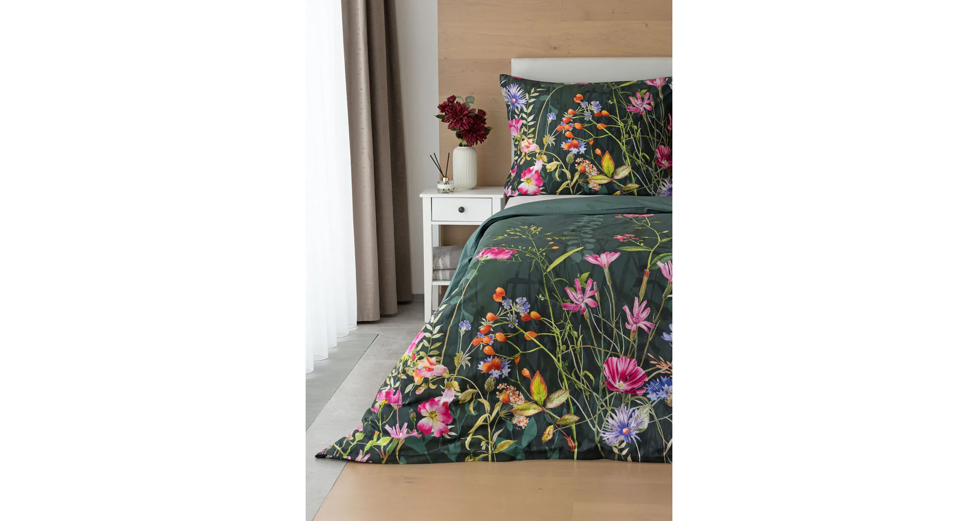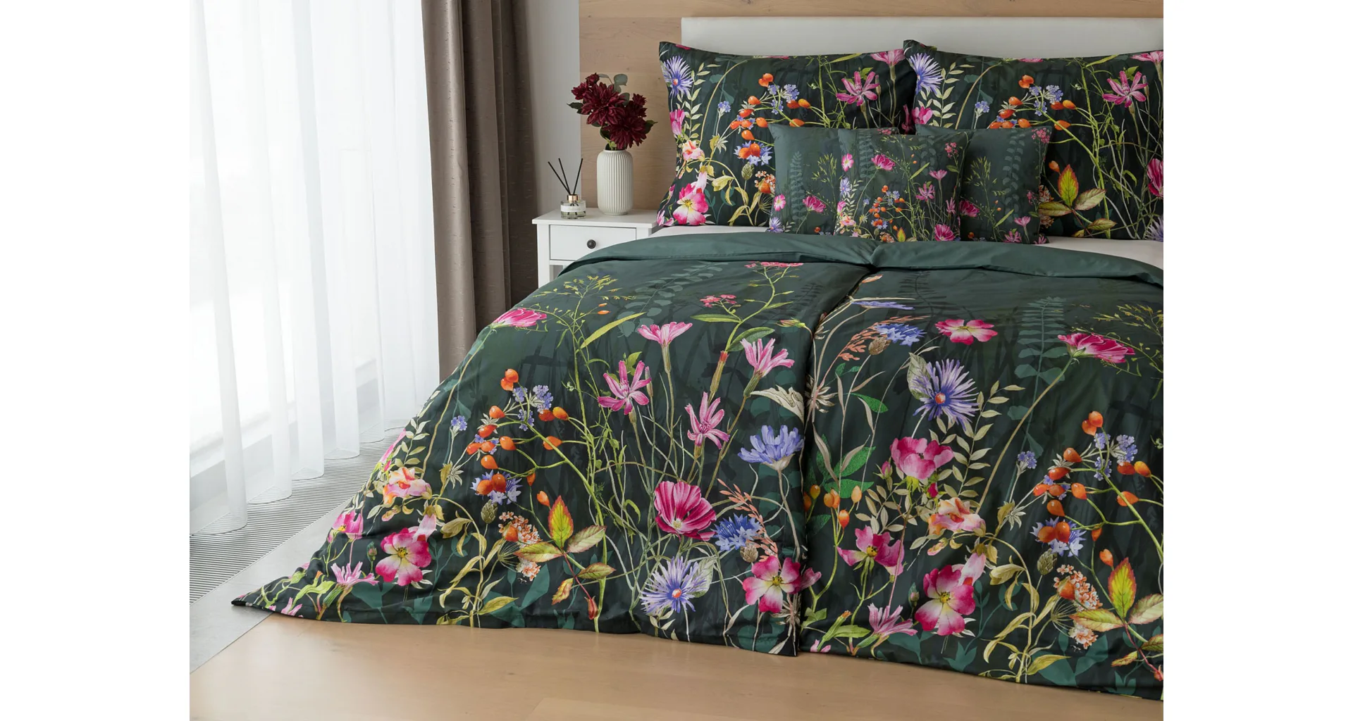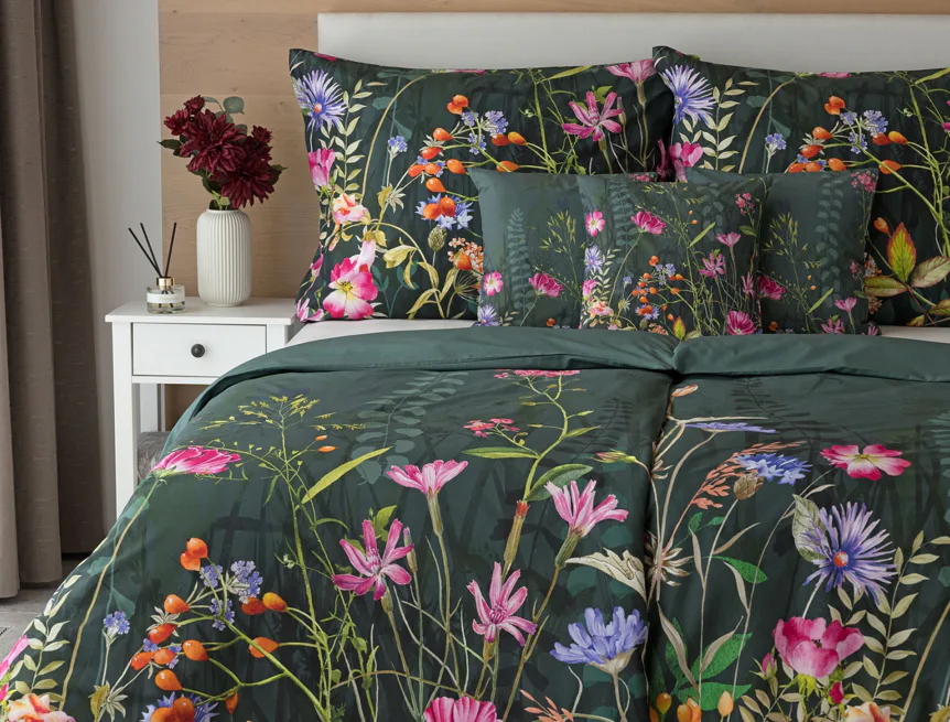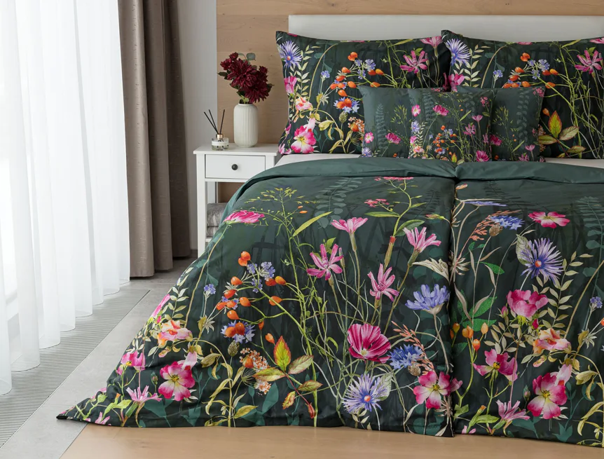 Povlak na přikrývku je z obou stran stejný, povlak na polštář zachycuje z každé strany jinou část květinového vzoru. Povlečení je opatřeno komfortním zipovým uzávěrem.