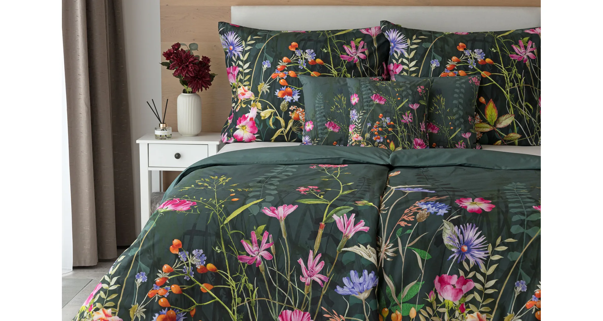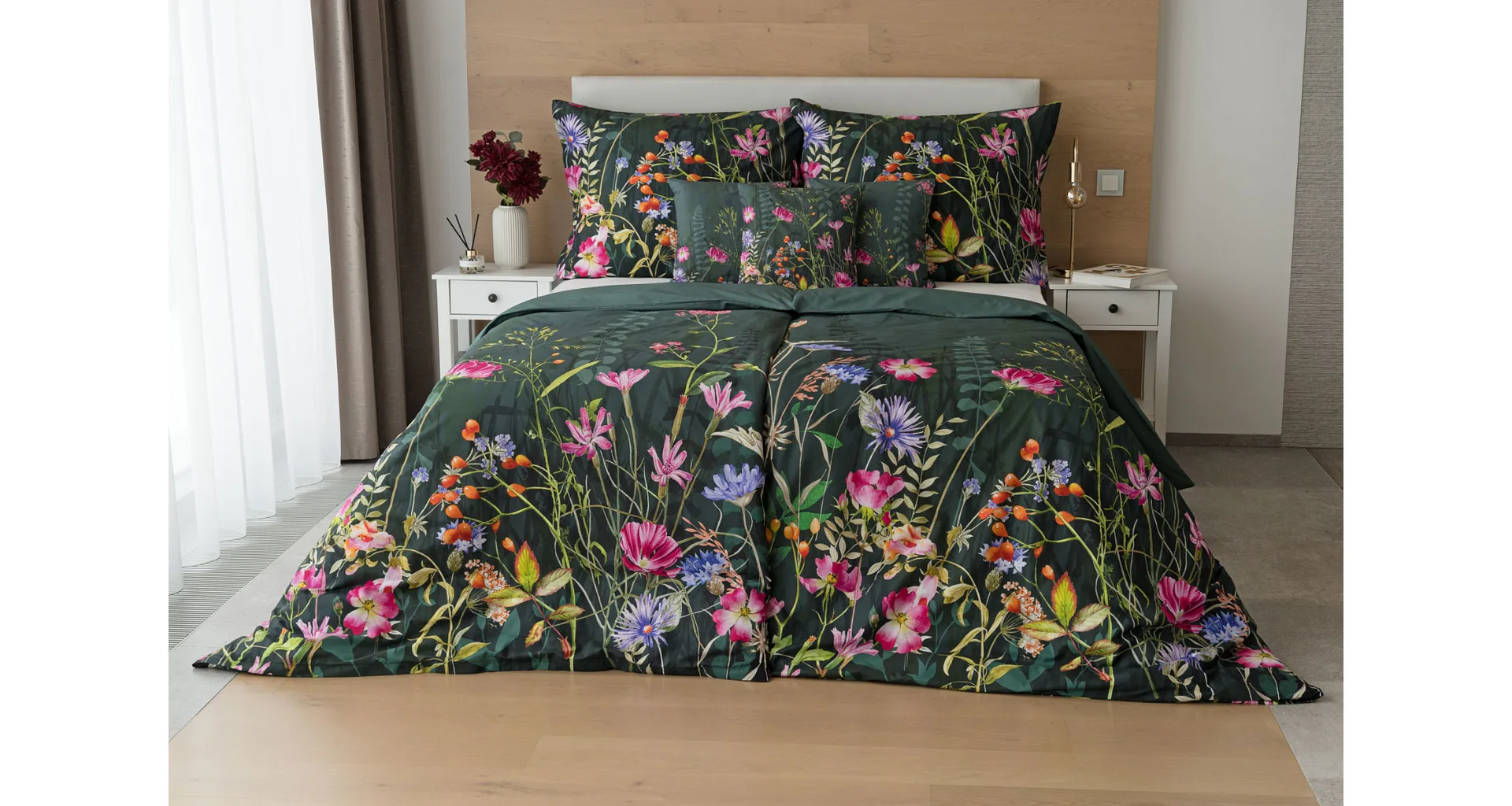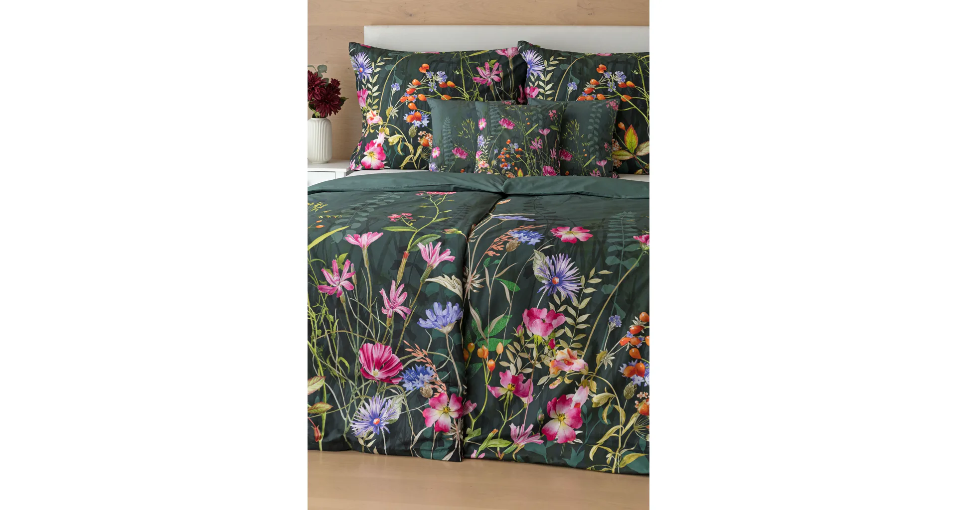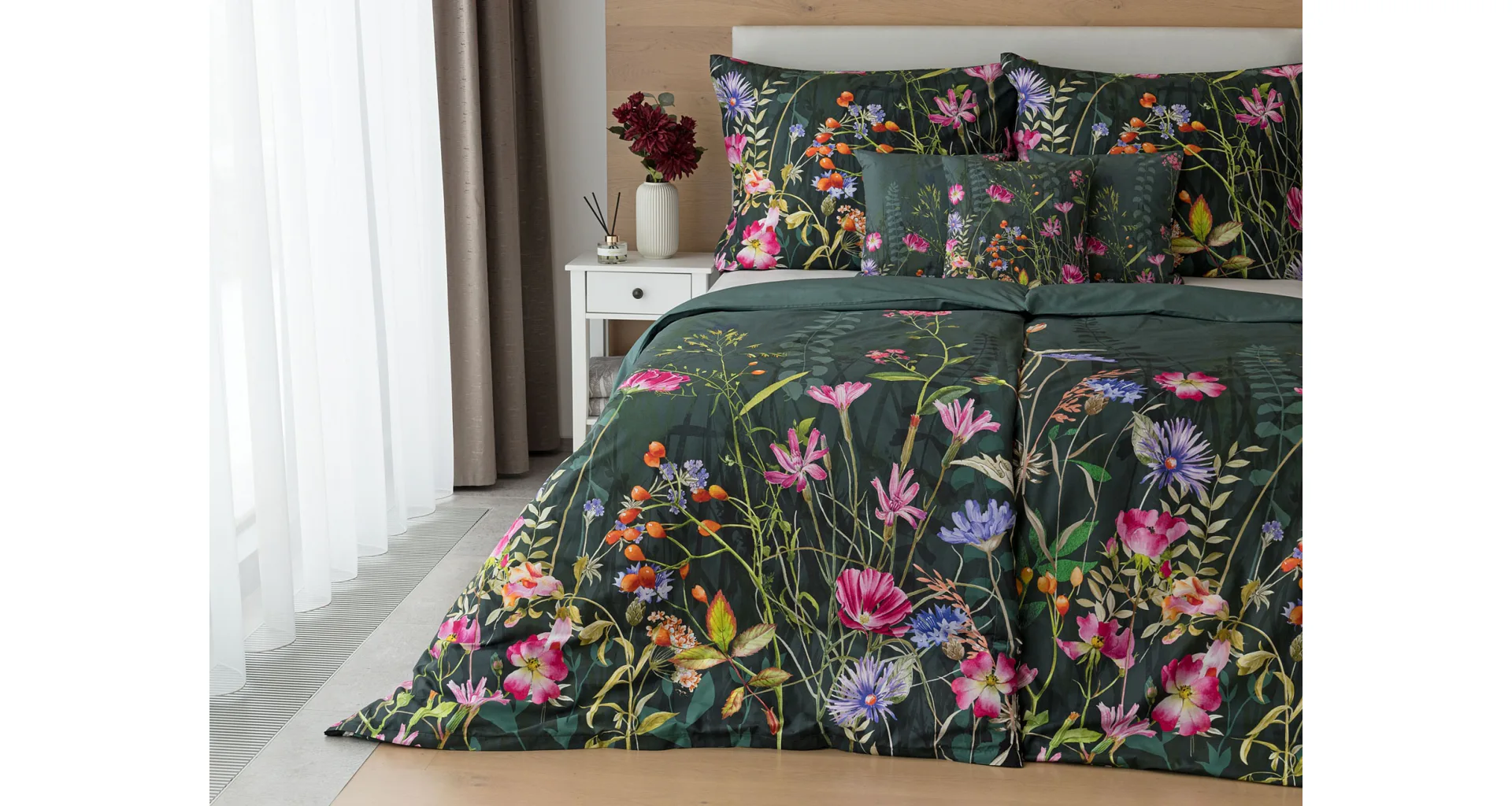 Povlak na přikrývku je z obou stran stejný, povlak na polštář zachycuje z každé strany jinou část květinového vzoru. Povlečení je opatřeno komfortním zipovým uzávěrem.