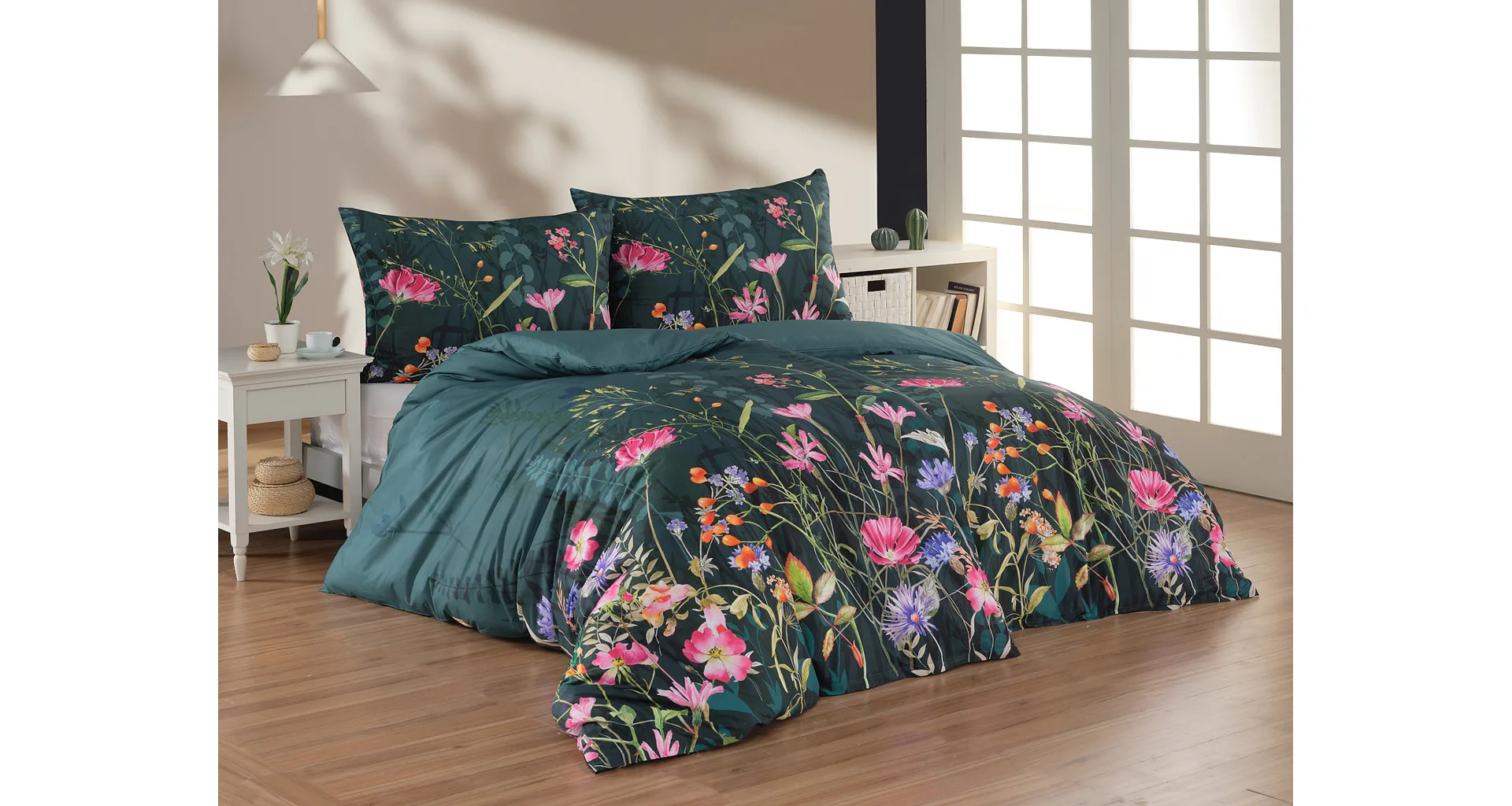 Povlečení Margot vás uchvátí na první pohled díky atraktivní kombinaci pestrých tónů, které se snoubí v okouzlujícím květinovém vzoru. Energický nádech ložního povlečení Margot podtrhuje výrazný podklad v zelenomodré barvě. Probouzejte se každý den s dobrou náladou!