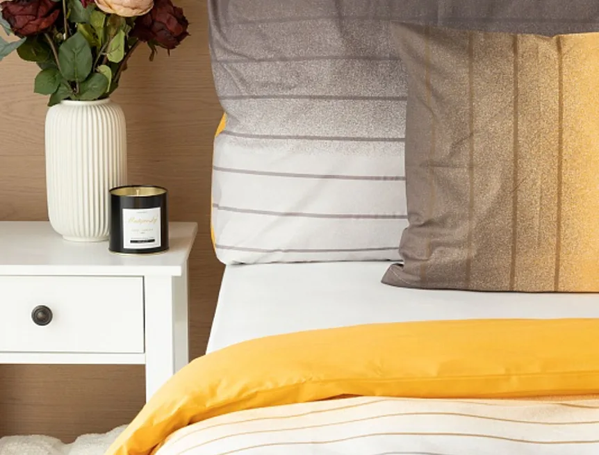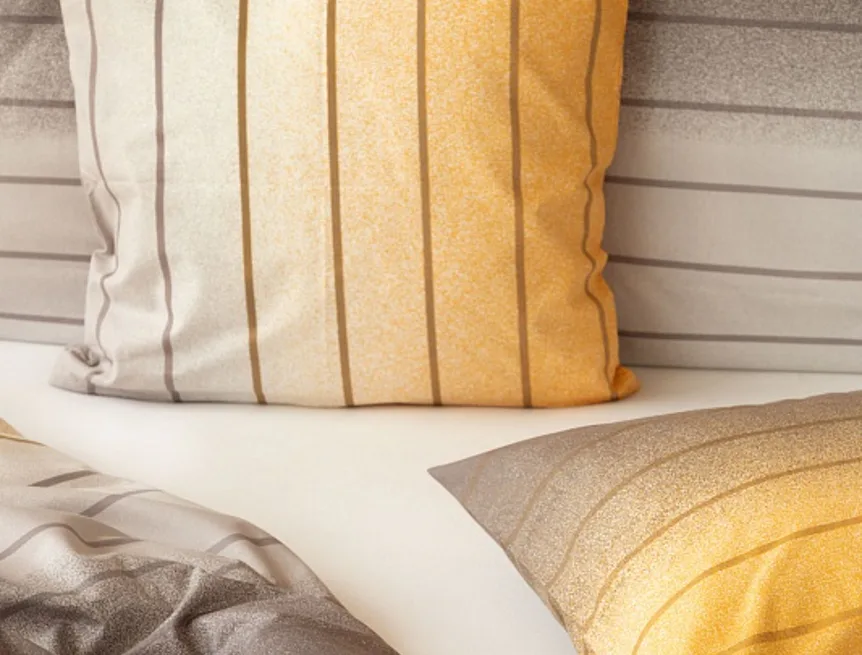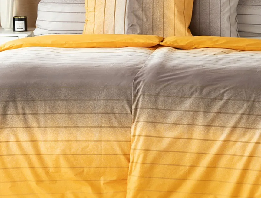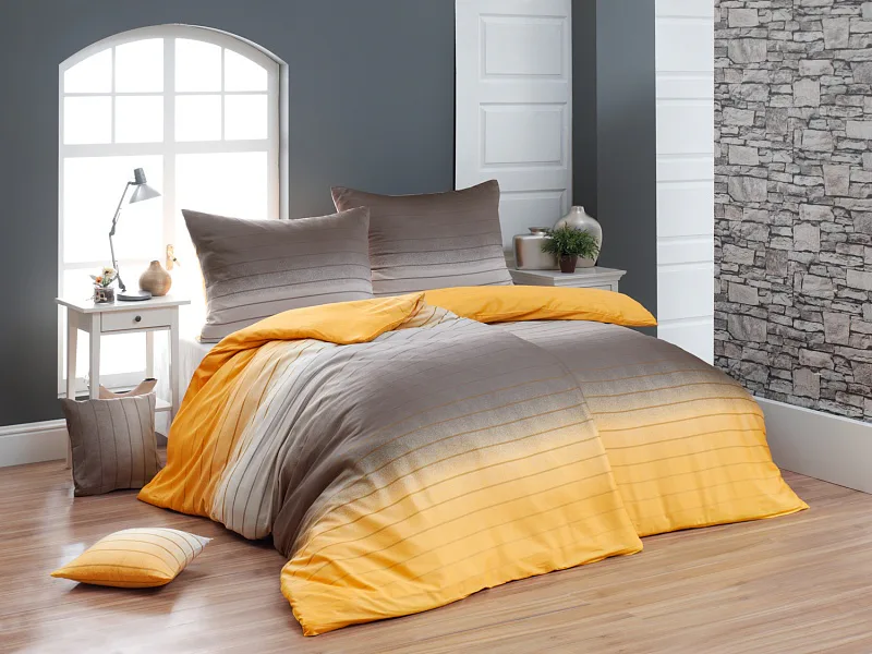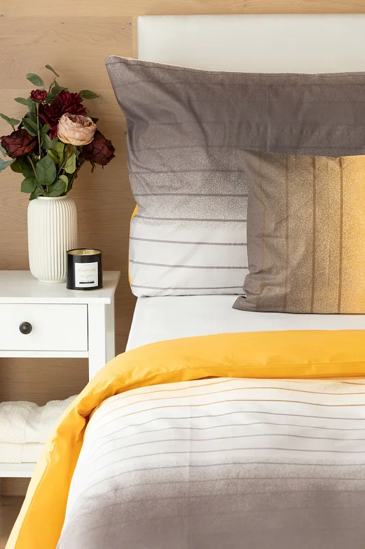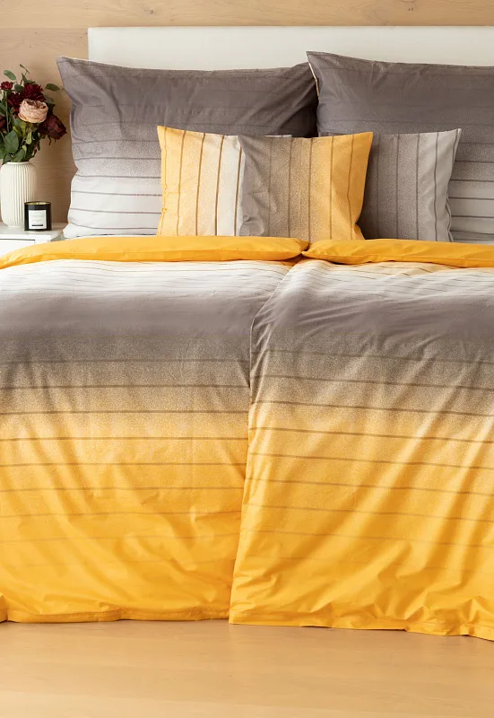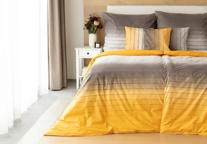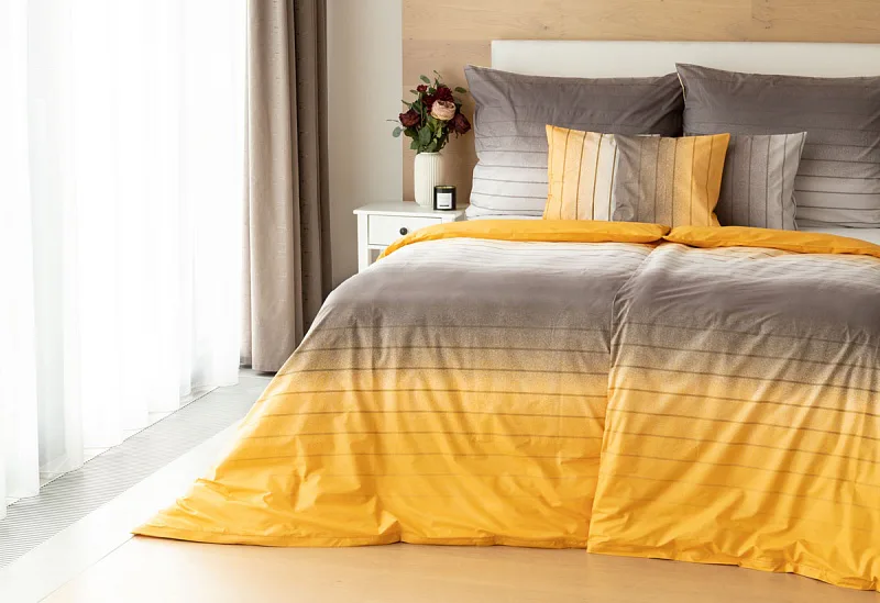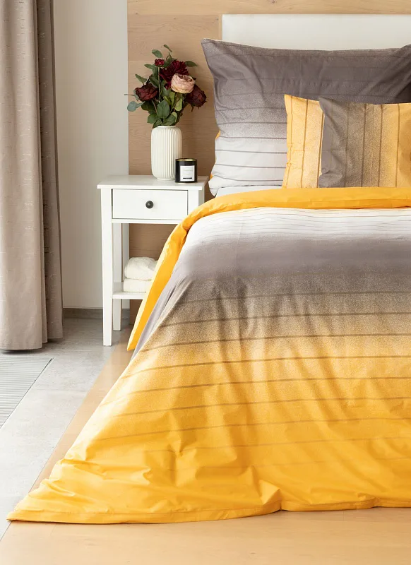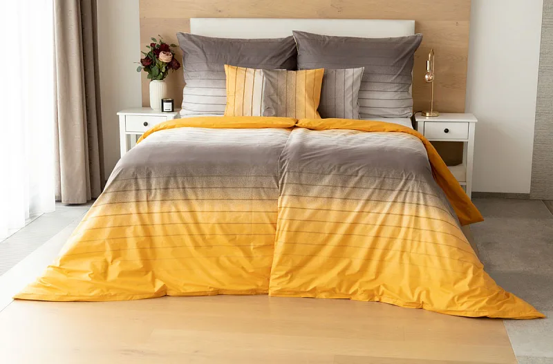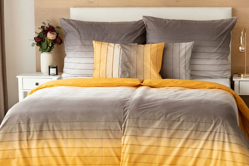 Hľadáte obliečky v jemnom dizajne? Vzor Melina Gold kombinuje tóny šedej a hrejivej medovo-žltej. Decentný prúžok s ombré efektom dodáva obliečkam elegantný vzhľad. Obliečka na vankúš aj prikrývku je z oboch strán rovnaká.