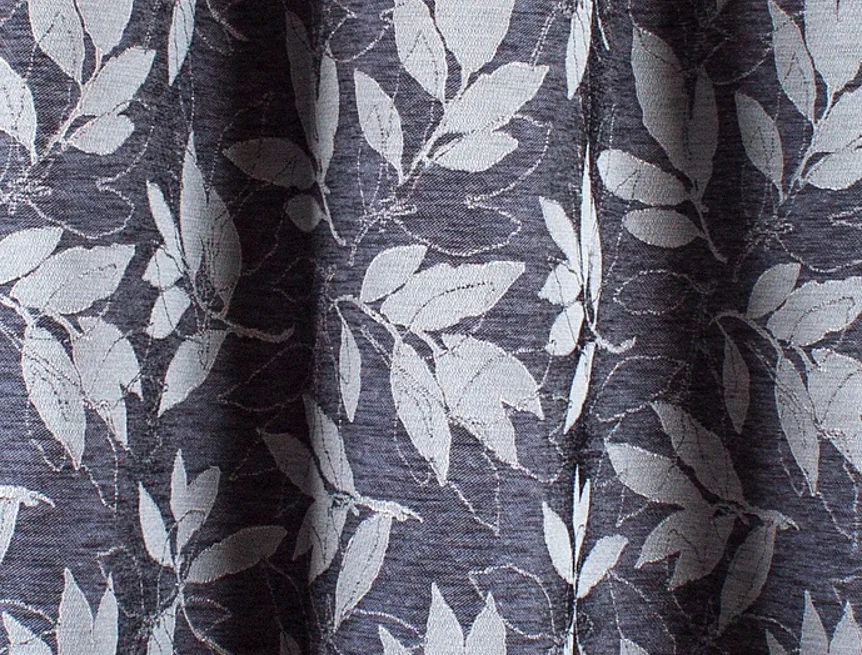 Látka má melírovanou, precizně tkanou proužkovanou strukturu doplněnou a vytkávaný lístečkový motiv v perfektně sladěných odstínech světlé a tmavě modré se stříbrnými konturami. Látka je částečně zatemňující, nejedná se o blackout. Příjemný matný lesk dodává závěsu nadčasovou eleganci.