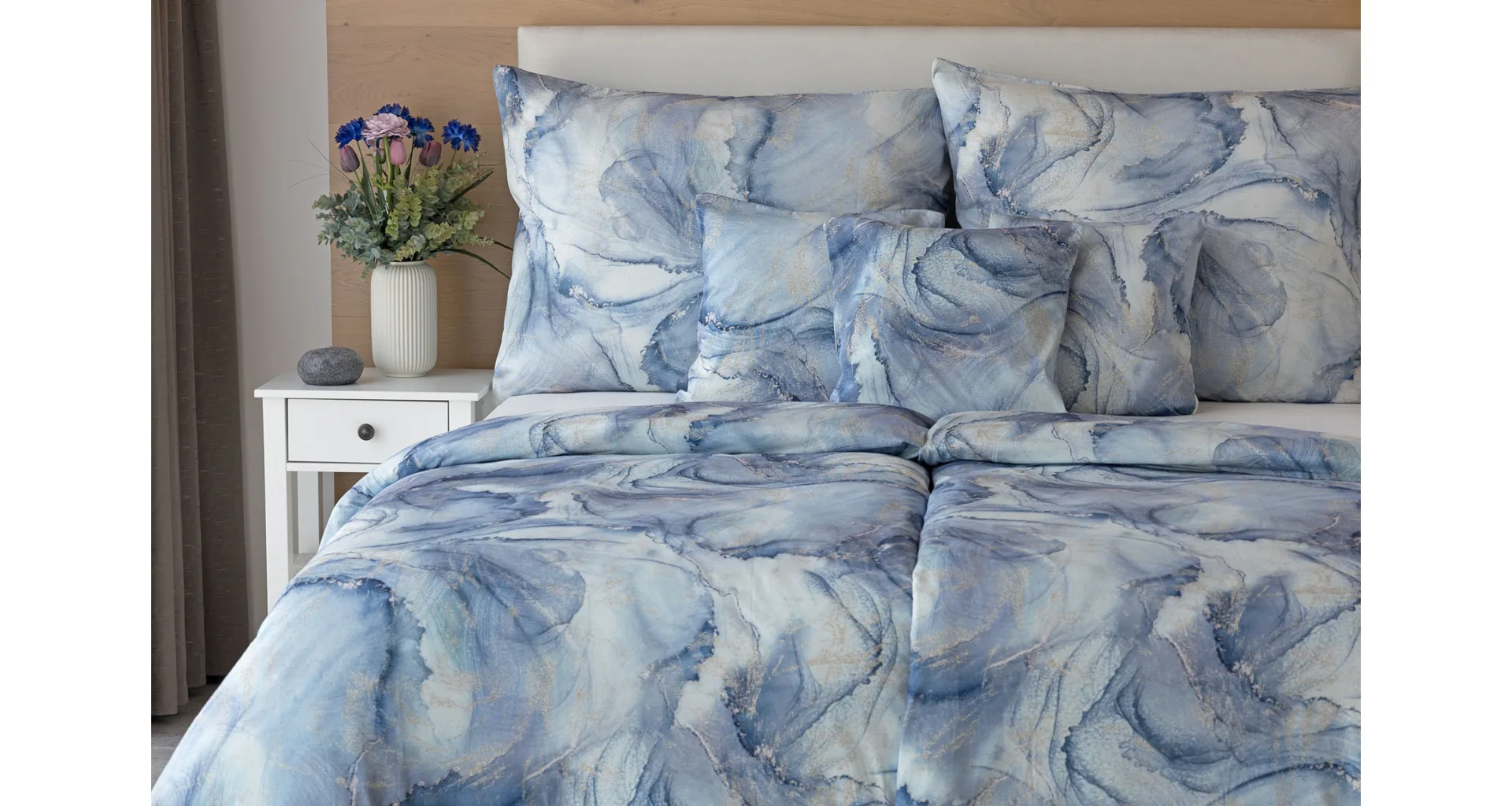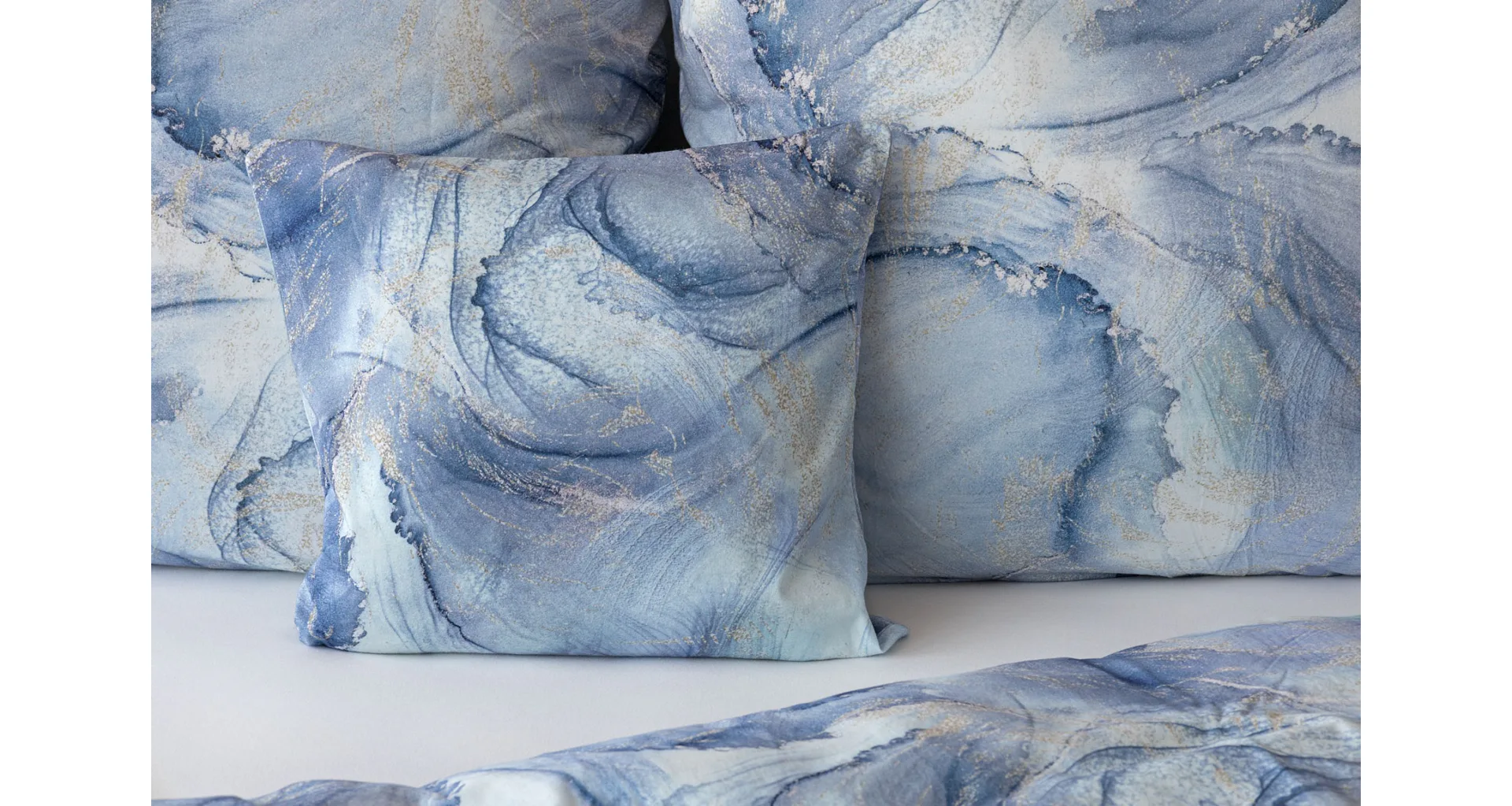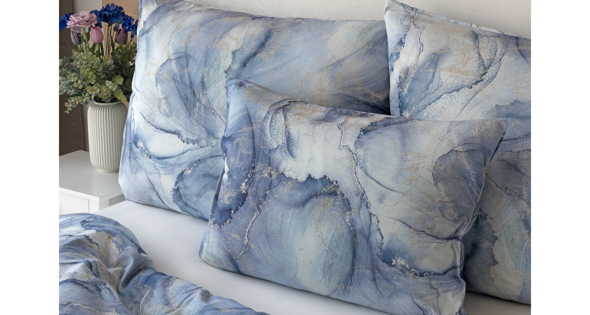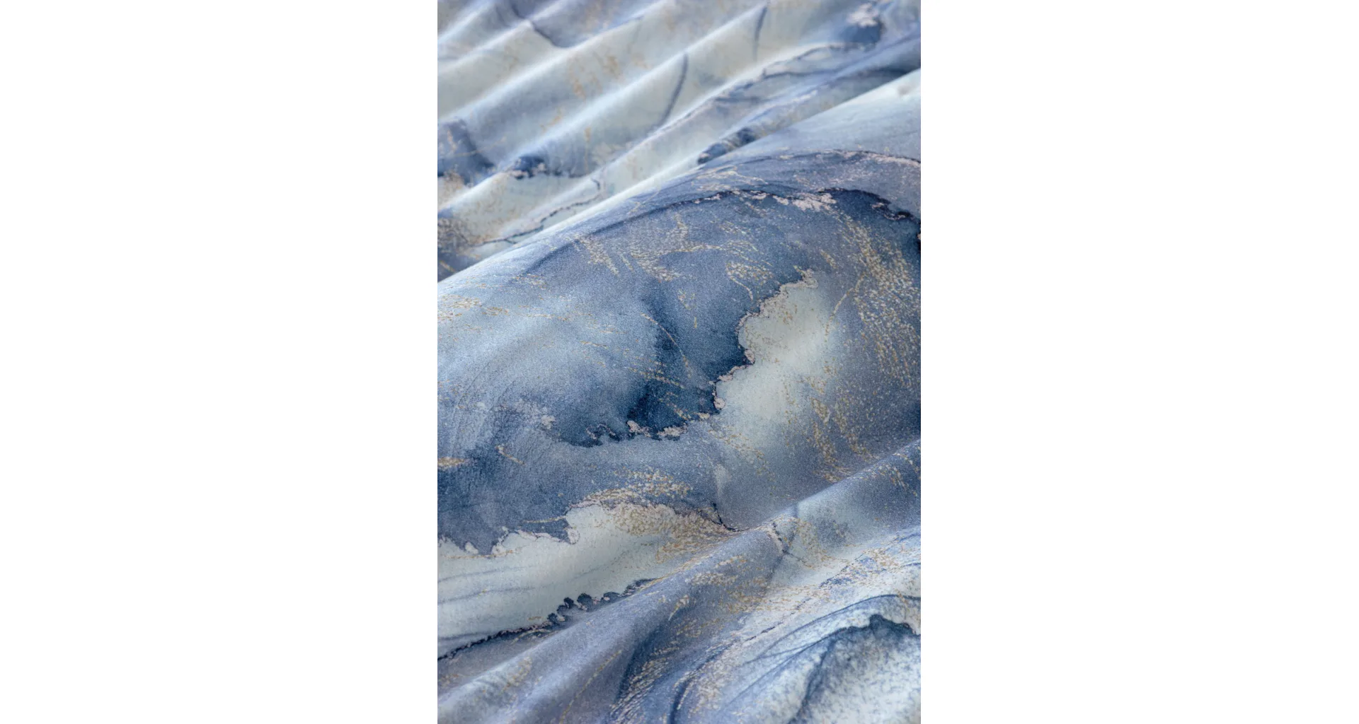 Pre novú kolekciu posteľných obliečok Mako jersey sme starostlivo vybrali motívy, ktoré sa tomuto pružnému materiálu hodia. Abstraktný vzor Odine, ktorý je tvorený paletou modrých tónov pretkaných zlatistými prvkami, rozžiari vašu spálňu.