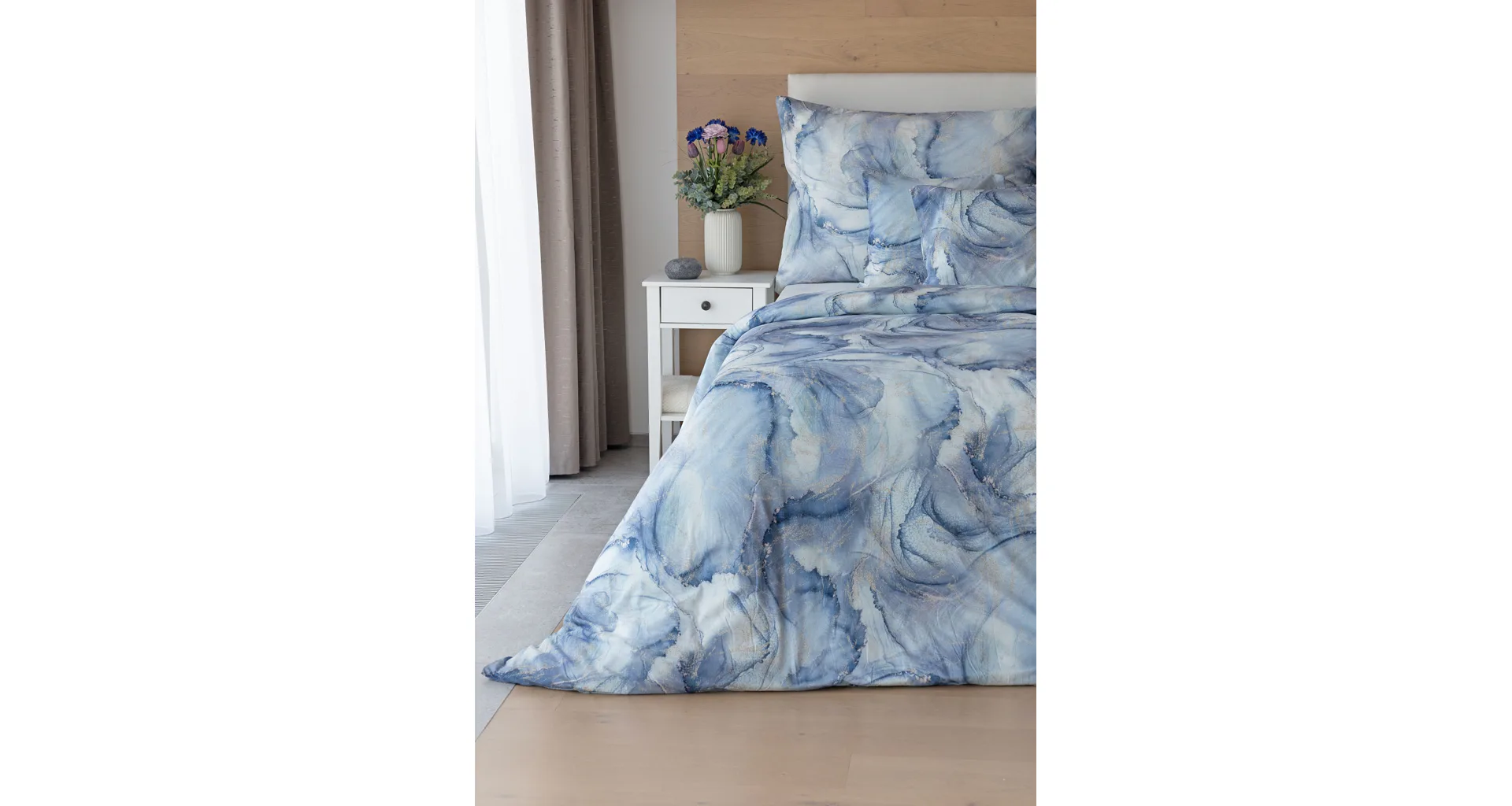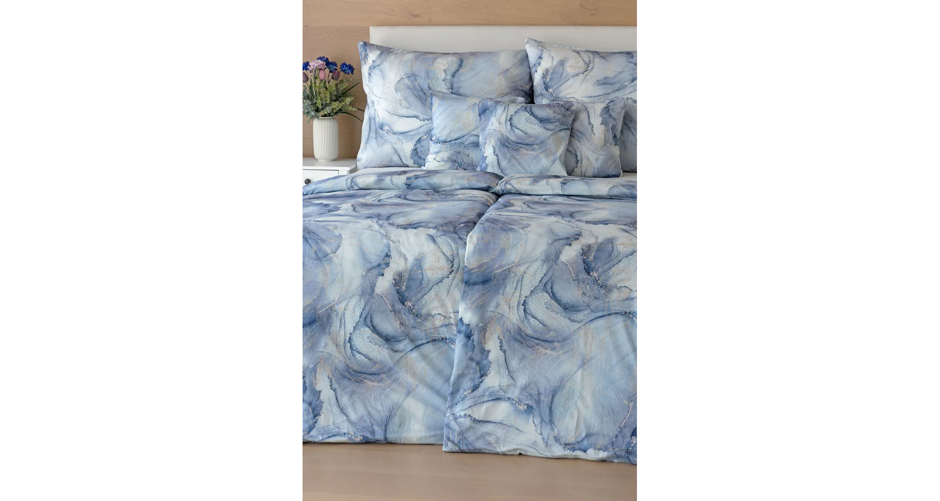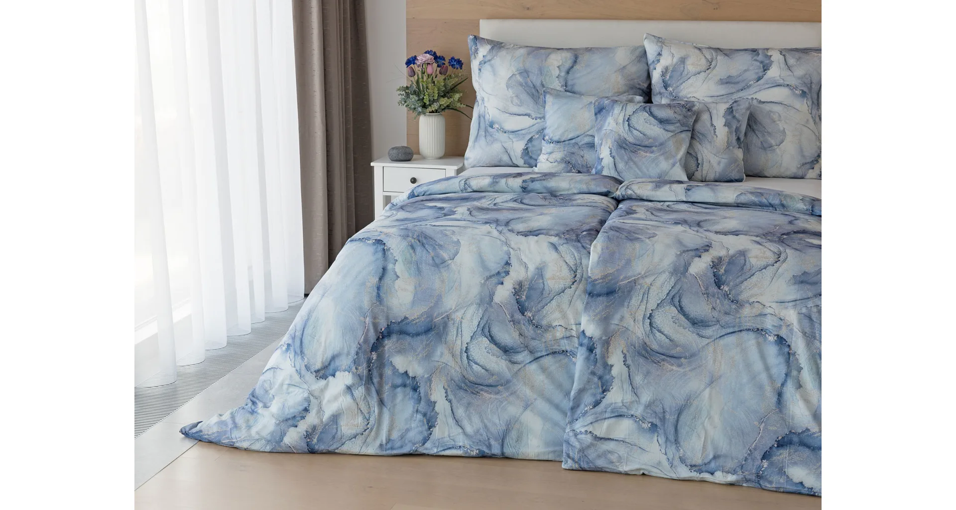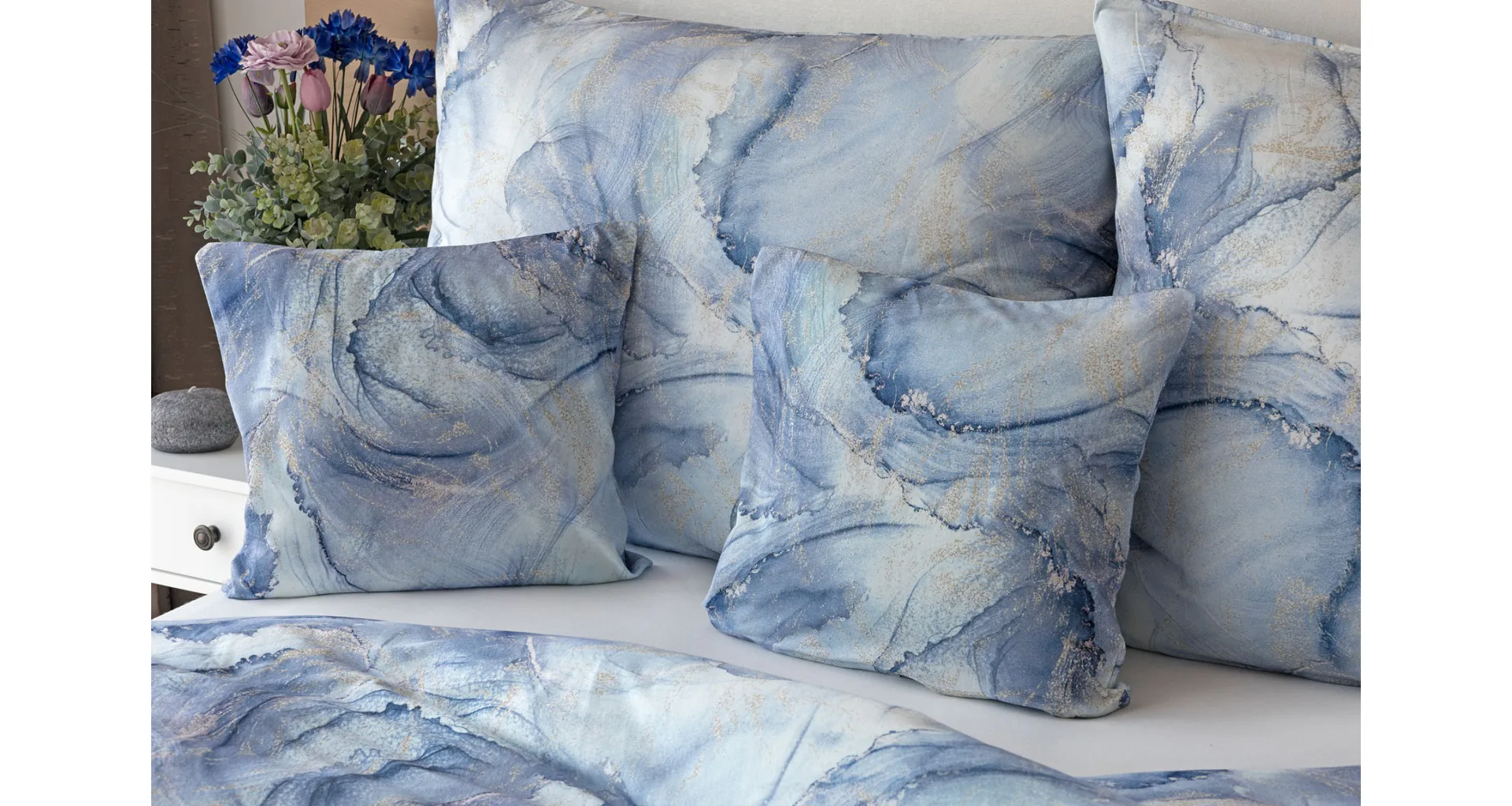 Pre novú kolekciu posteľných obliečok Mako jersey sme starostlivo vybrali motívy, ktoré sa tomuto pružnému materiálu hodia. Abstraktný vzor Odine, ktorý je tvorený paletou modrých tónov pretkaných zlatistými prvkami, rozžiari vašu spálňu.