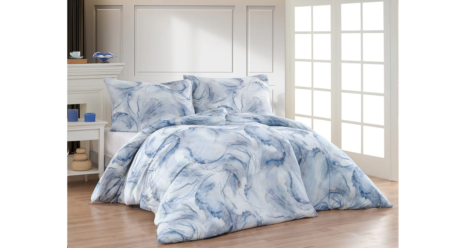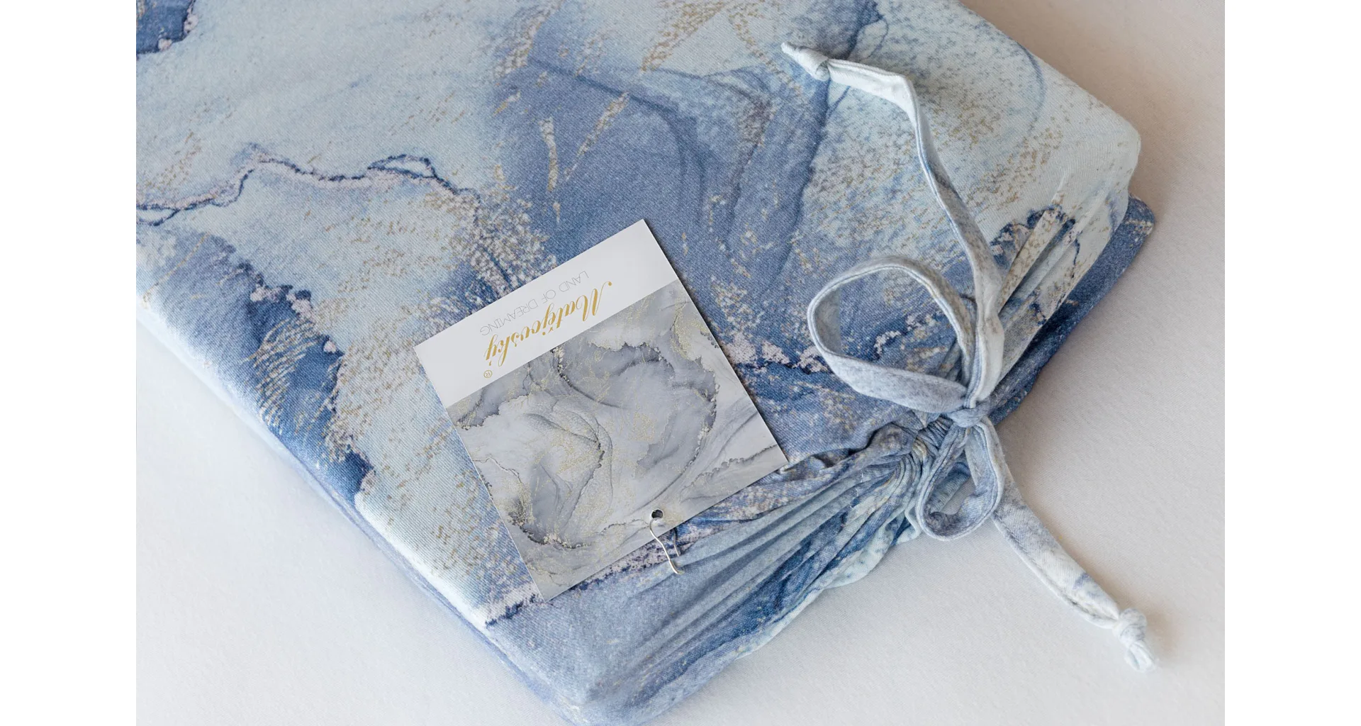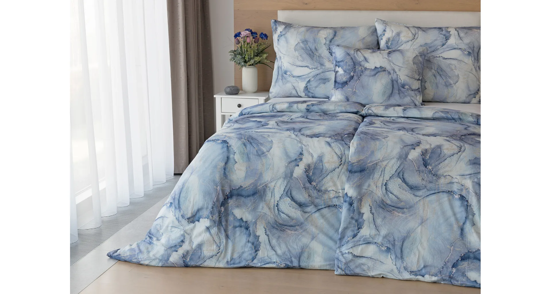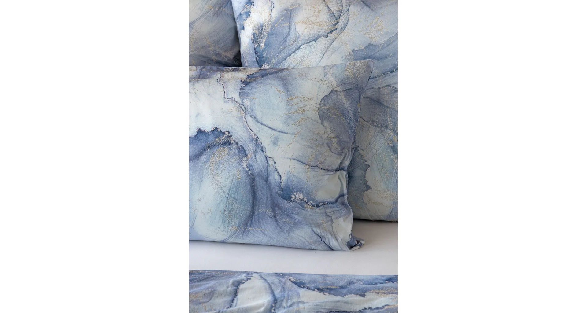 Pre novú kolekciu posteľných obliečok Mako jersey sme starostlivo vybrali motívy, ktoré sa tomuto pružnému materiálu hodia. Abstraktný vzor Odine, ktorý je tvorený paletou modrých tónov pretkaných zlatistými prvkami, rozžiari vašu spálňu.