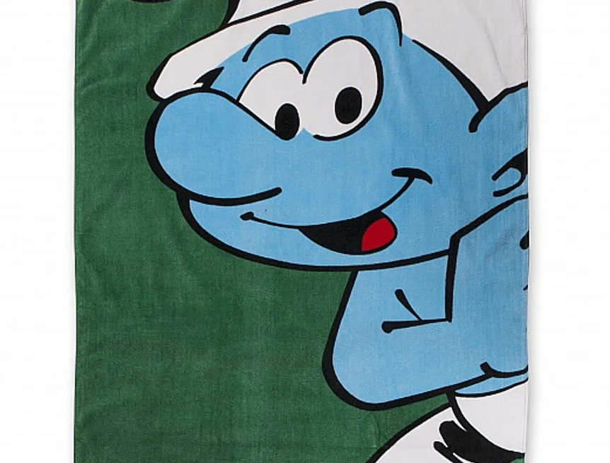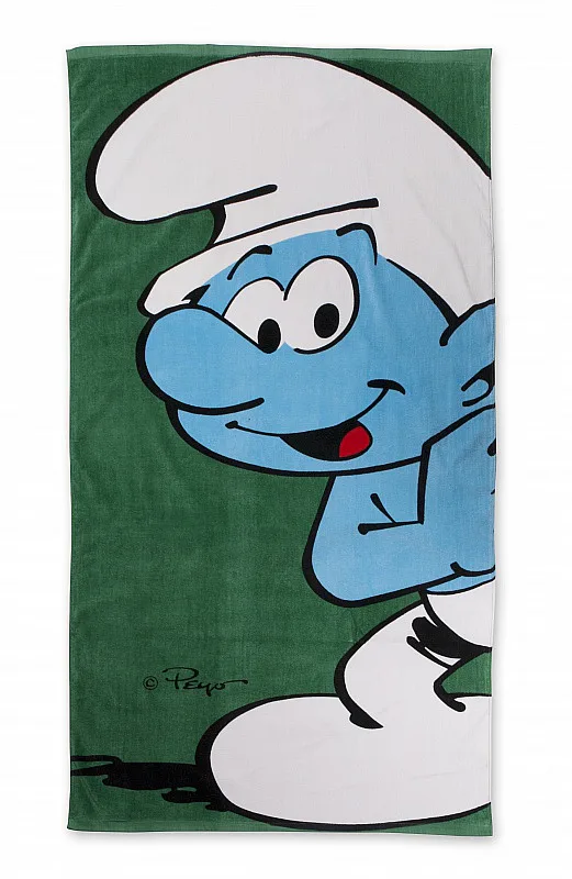 Plážová froté osuška ze 100% bavlny s postavou usměvavého Šmoulíka. Motiv je jednostranný. Firma Matějovský je distributor.