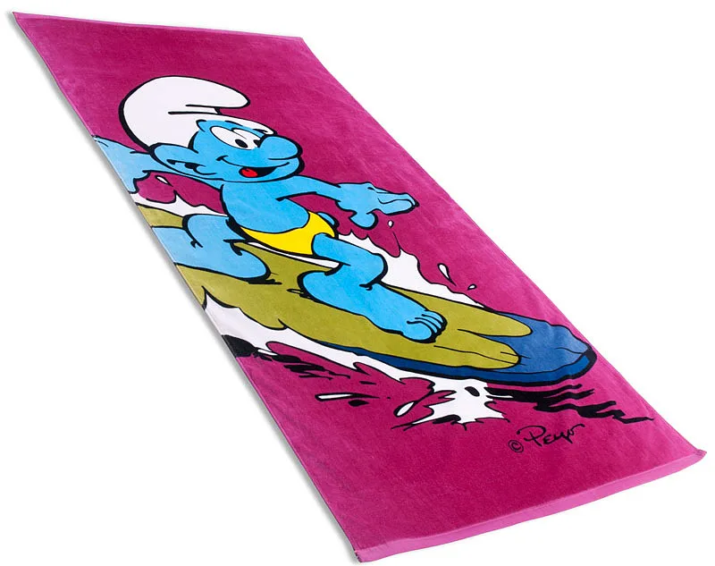 Veselá postava serfující Šmoulíka pro vodní radovánky jako stvořená. Froté plážová osuška za 100% bavlny. Firma Matějovský je distributor.