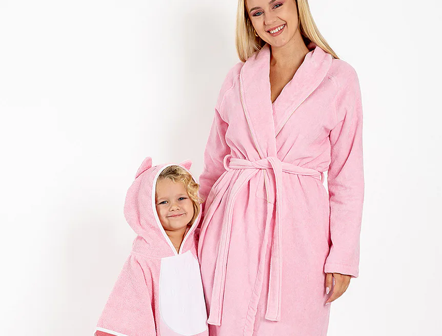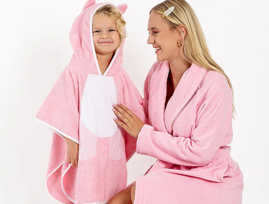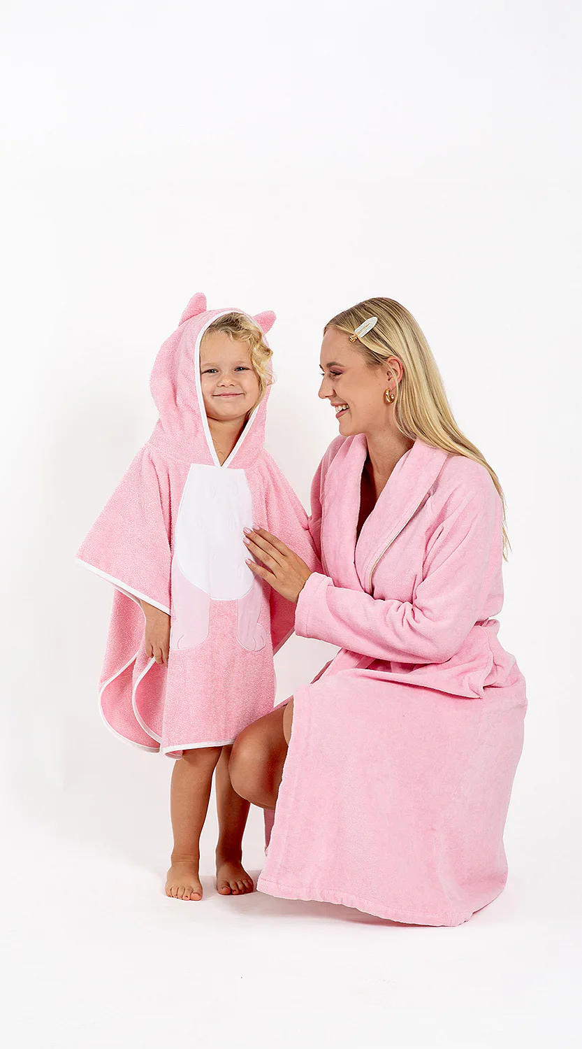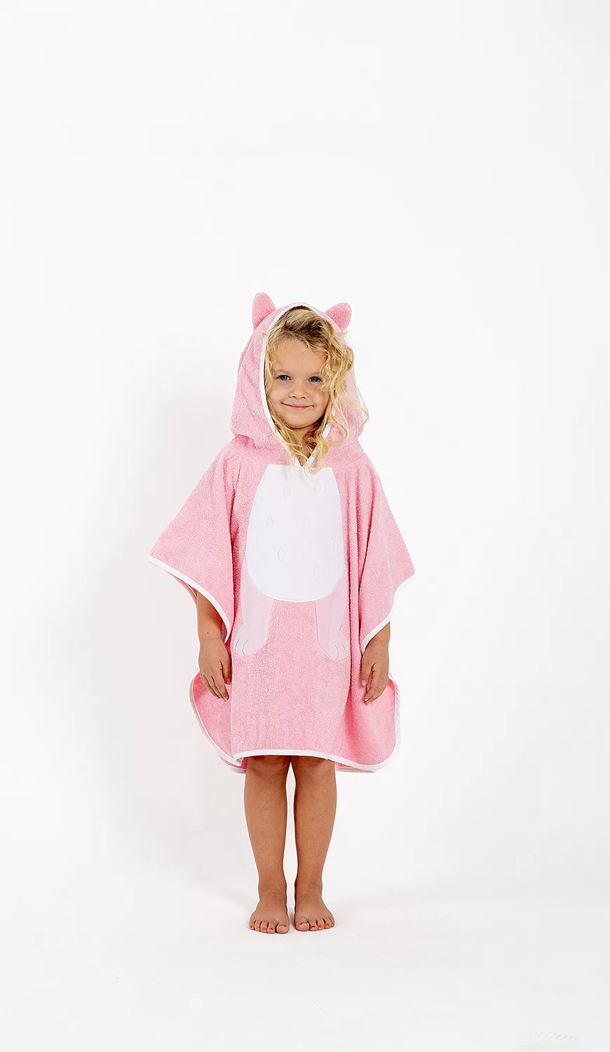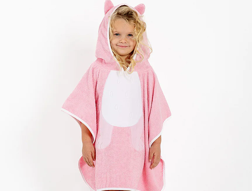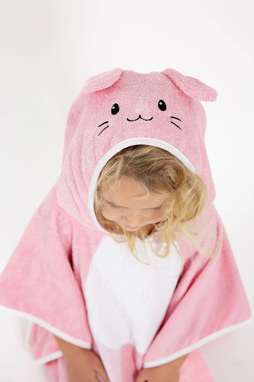 Dětské froté pončo se zvířecí výšivkou je ideální společník po koupeli, plavání nebo dovádění u moře. Výšivka s motivem zajíčka laděná do růžových tónů potěší hlavně malé princezny!