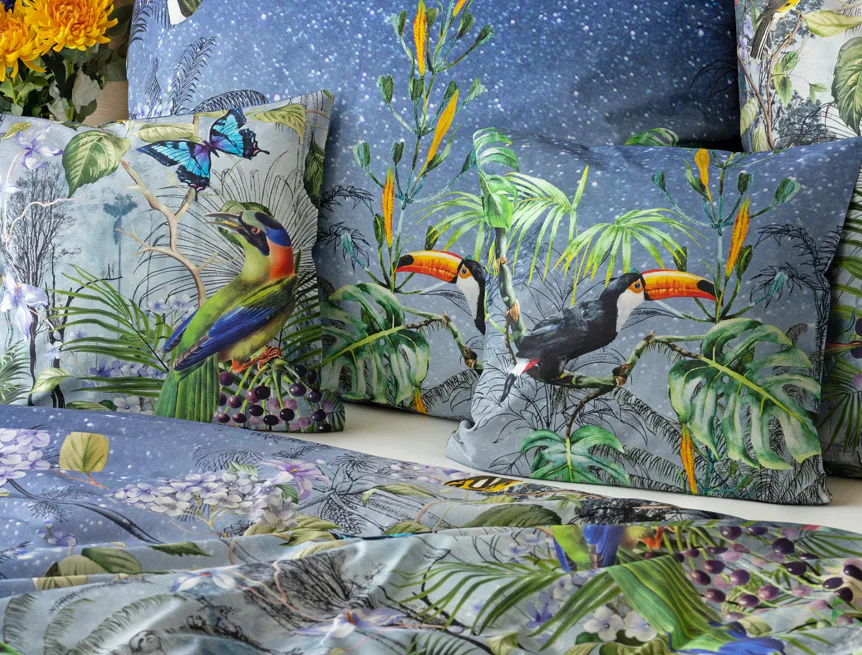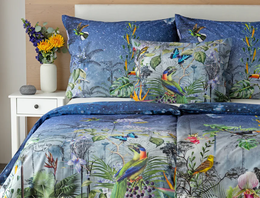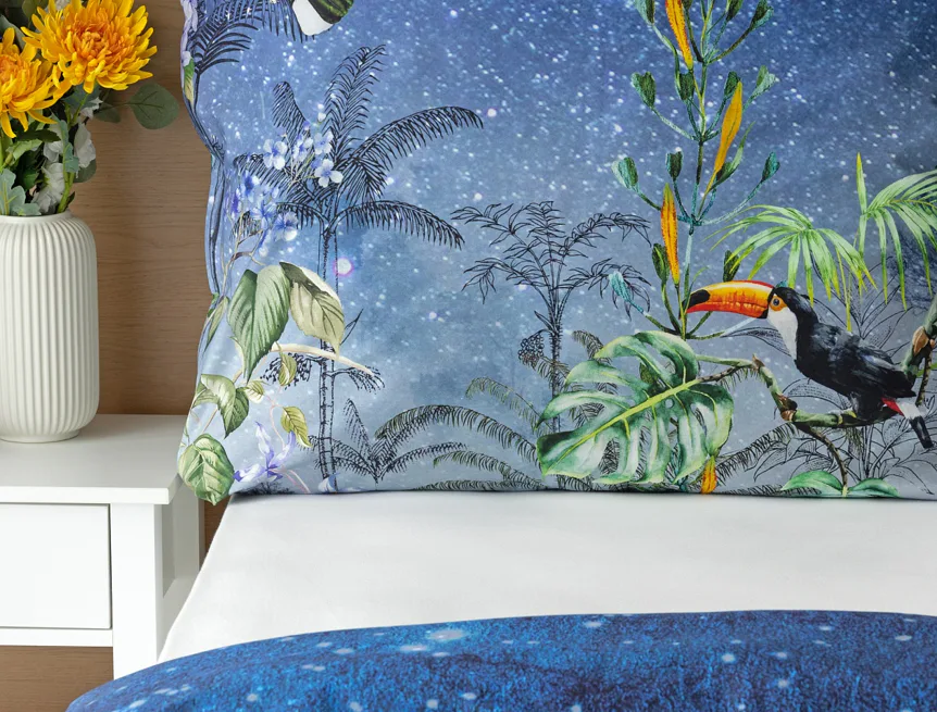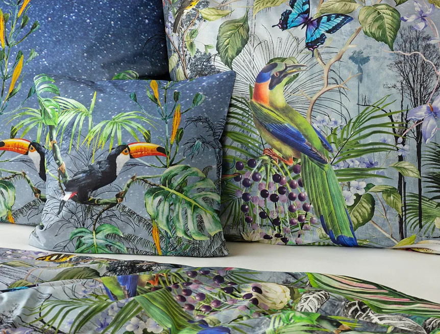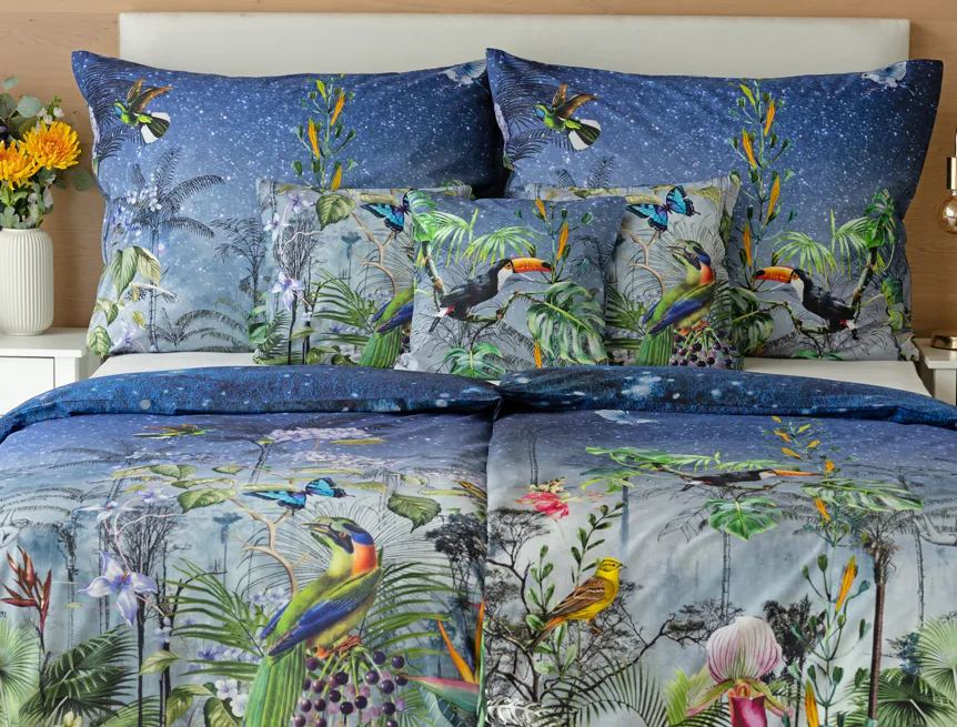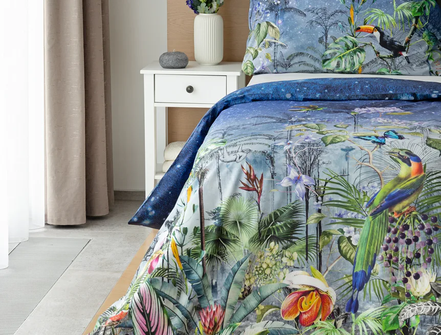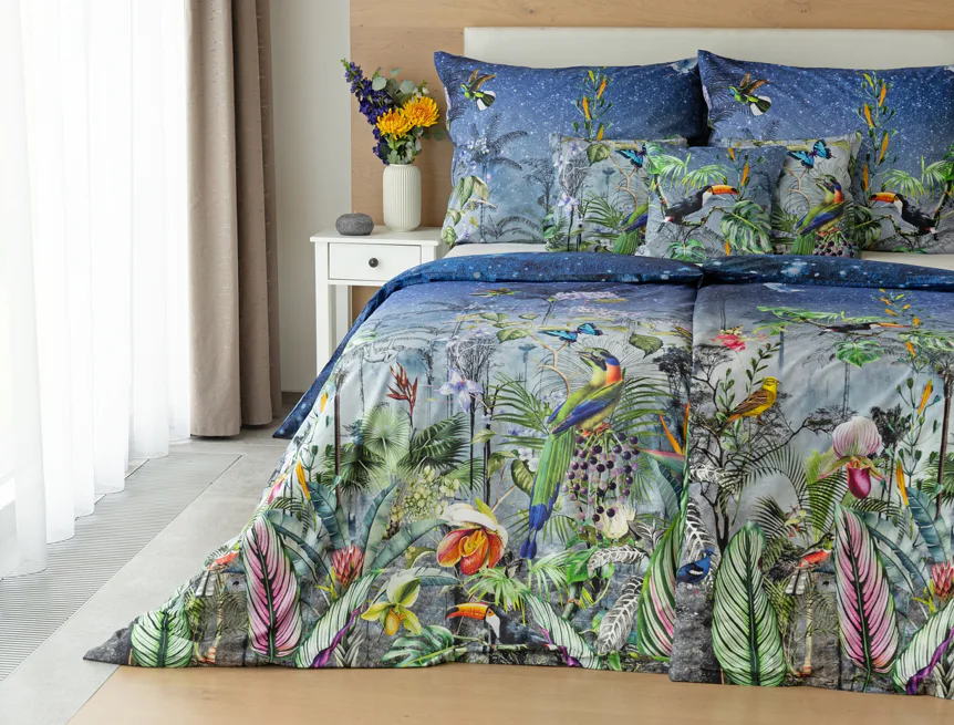 Obklopte sa exotikou s bavlnenými obliečkami Paradise. Kombináciou maľby a kresby vznikol motív exotického pralesa s nespútanou flórou a faunou. Vďaka najmodernejšej digitálnej tlači si vychutnáte každý detail.