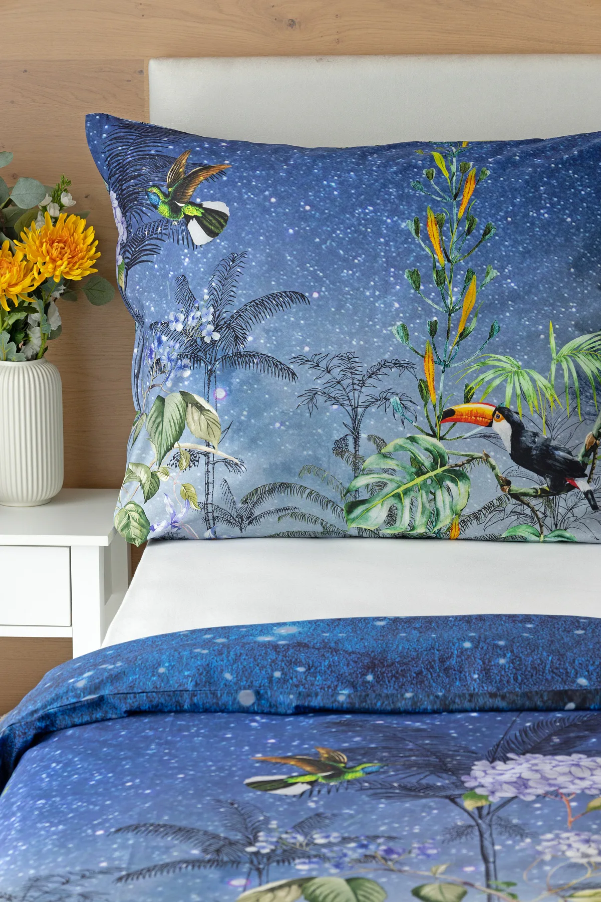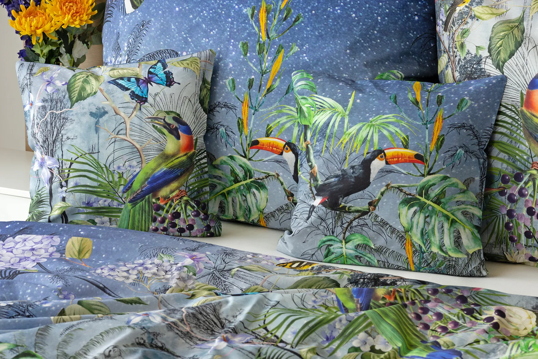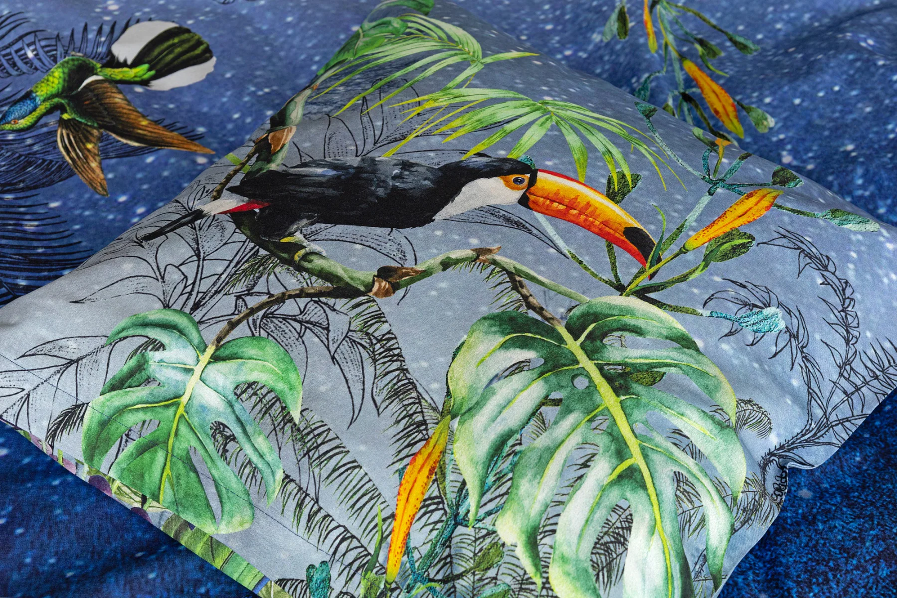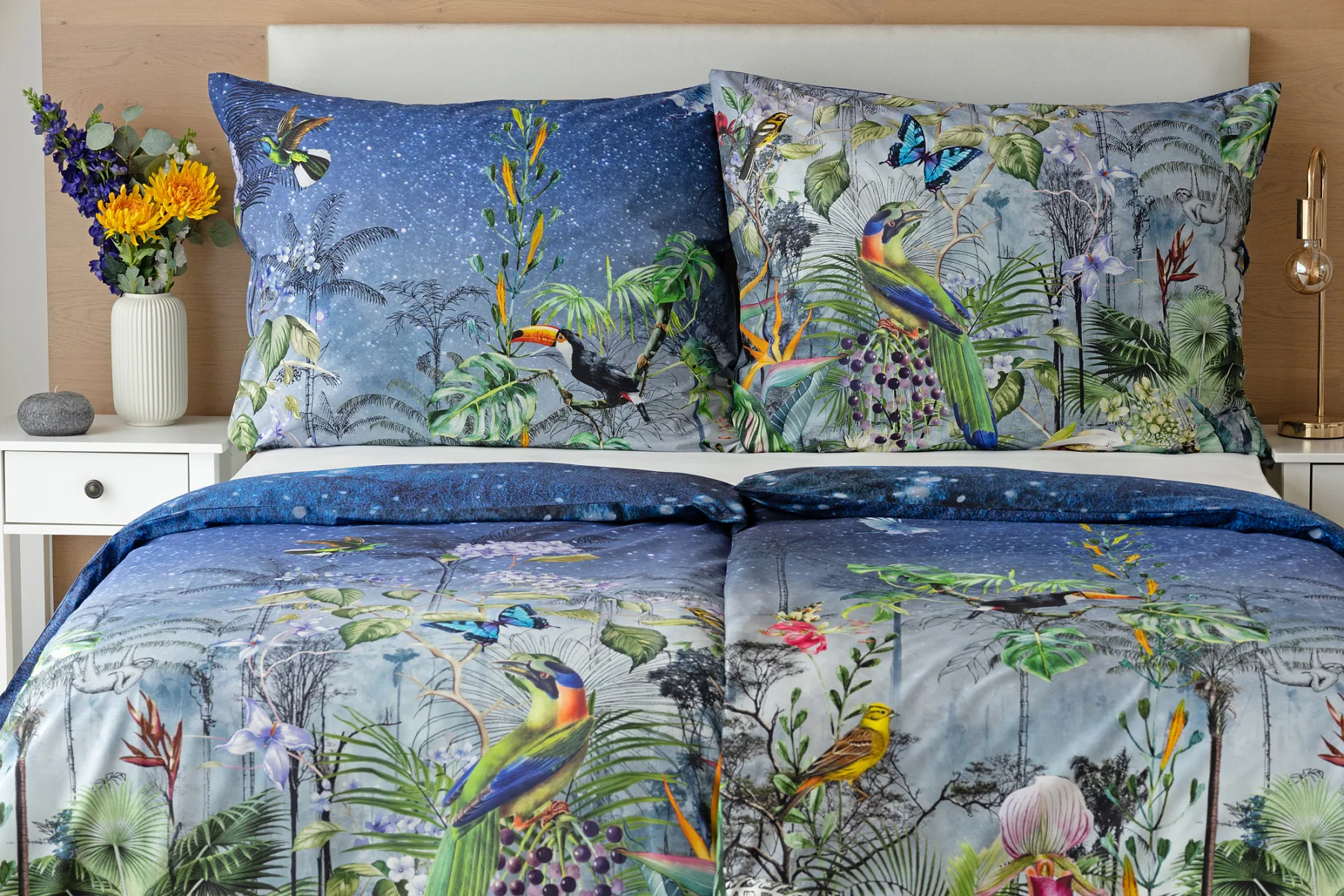 Obklopte sa exotikou s bavlnenými obliečkami Paradise. Kombináciou maľby a kresby vznikol motív exotického pralesa s nespútanou flórou a faunou. Vďaka najmodernejšej digitálnej tlači si vychutnáte každý detail.