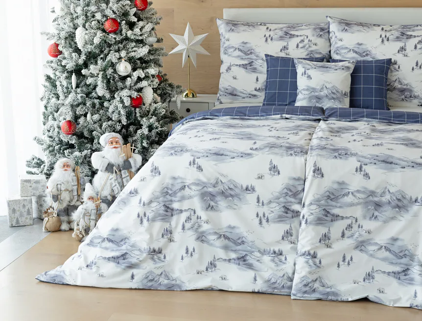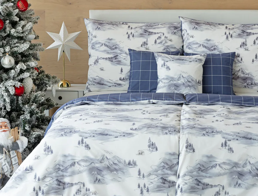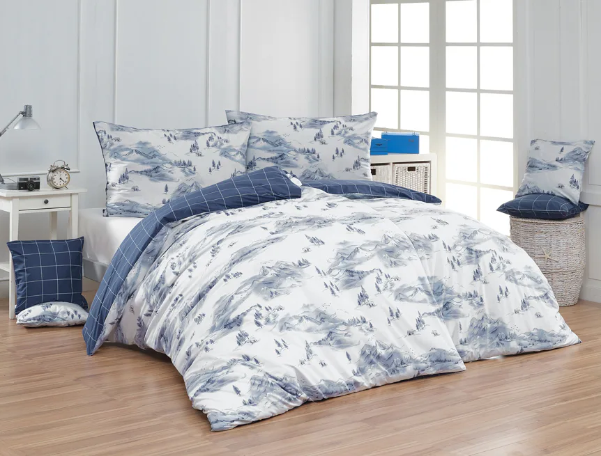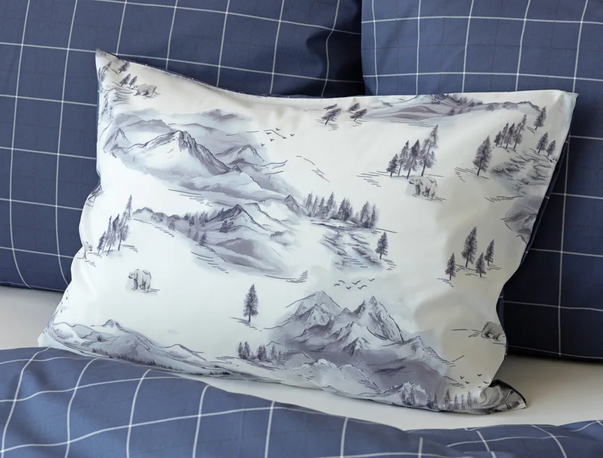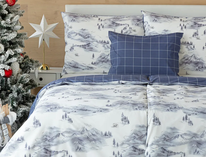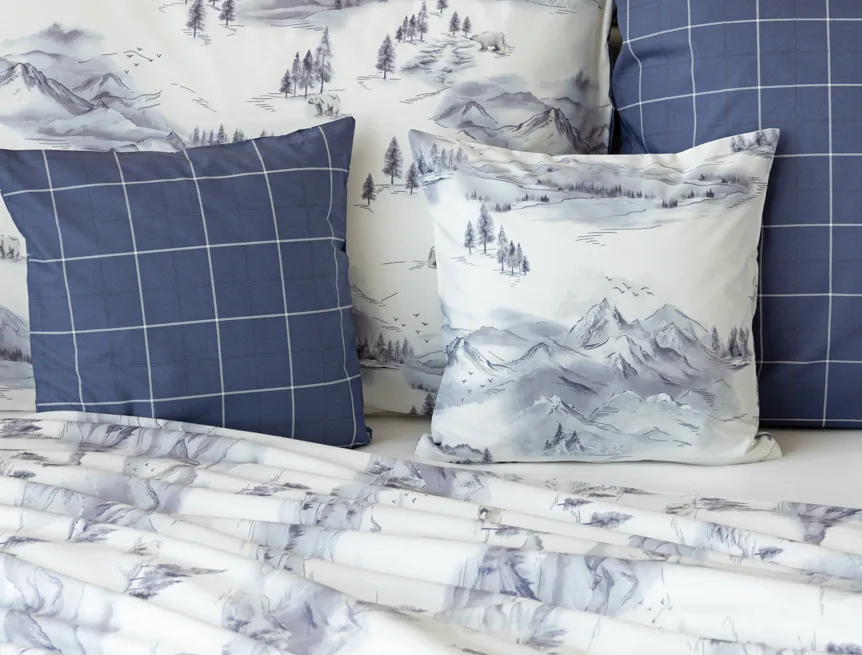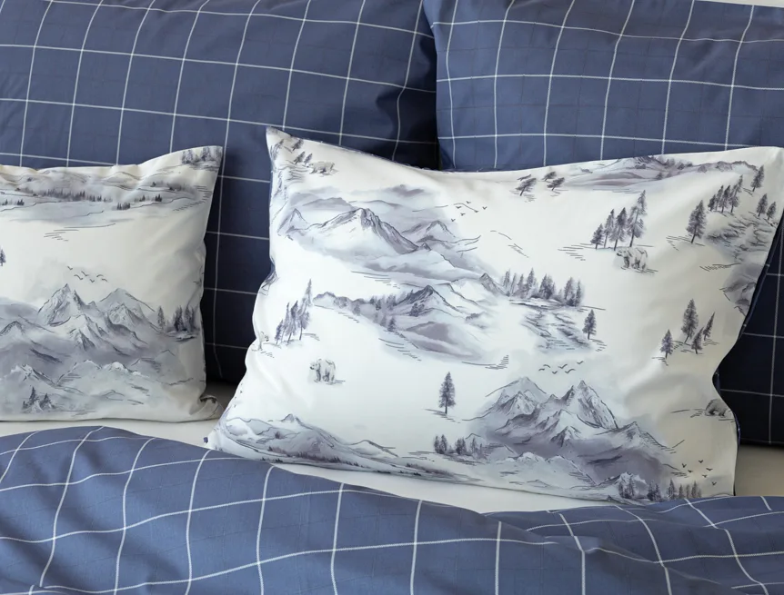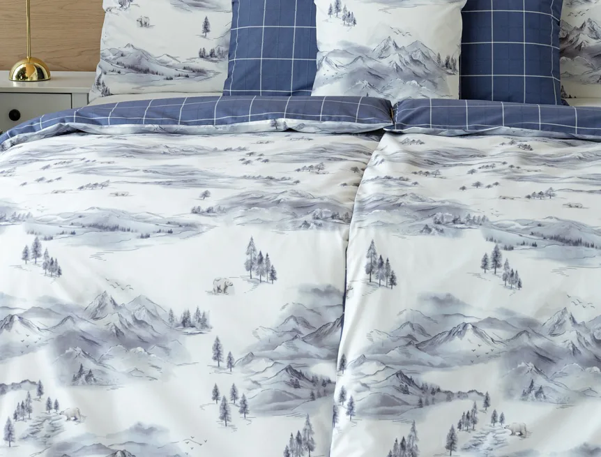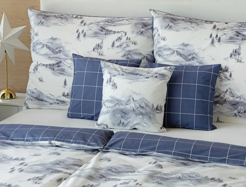 Bavlnené obliečky Polar Blue vnesú do vašej spálne sviežosť a navodia tú správnu zimnú atmosféru. Vrchnú stranu obliečok zdobí kresba horskej krajiny v palete modrošedých tónov na snehovo-bielom podklade. Spodnú stranu tvorí kocka s bielou kontúrou na modrošedom podklade. Vďaka tomuto obľúbenému obojstrannému prevedeniu môžete pri stlaní hravo experimentovať!