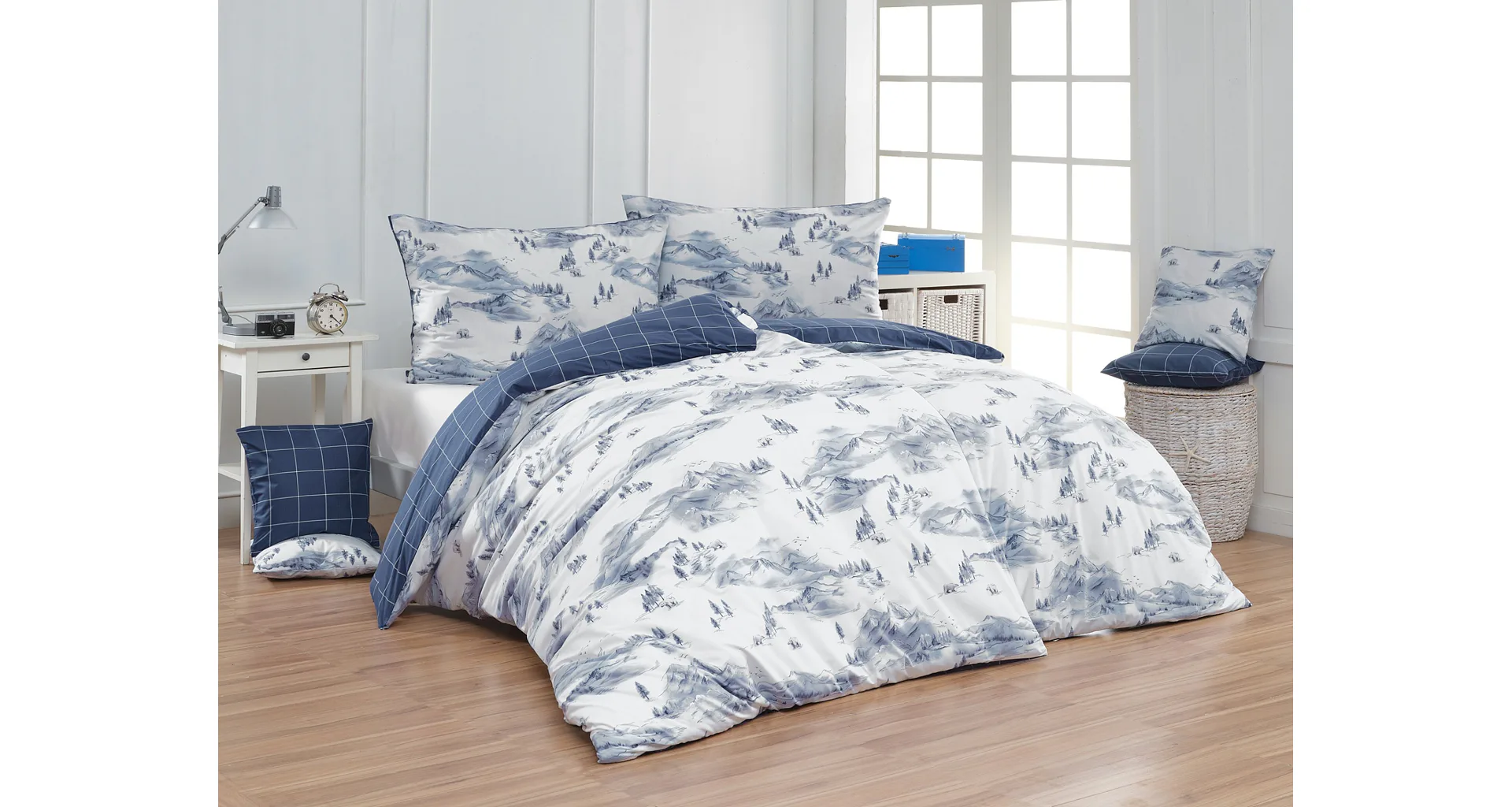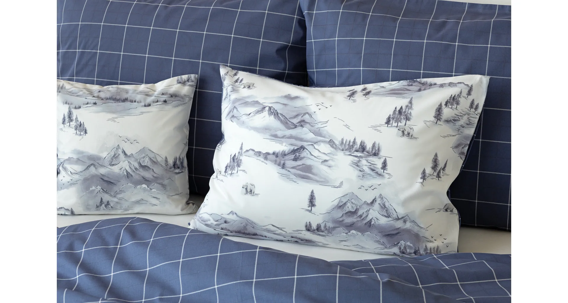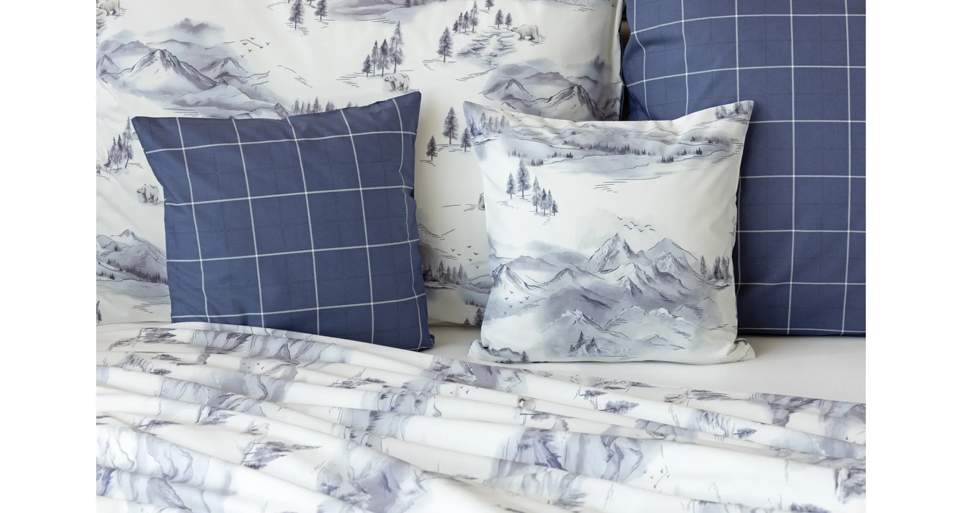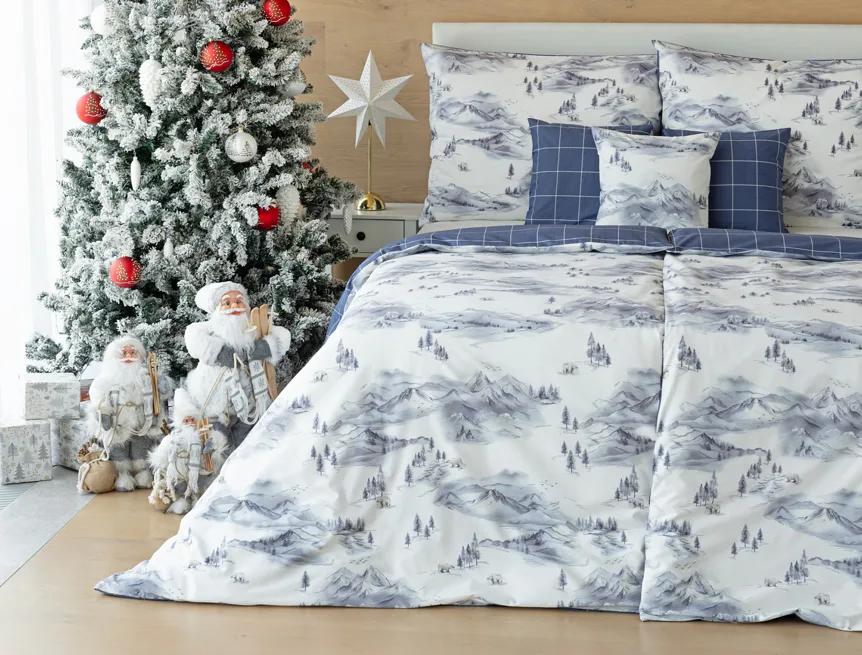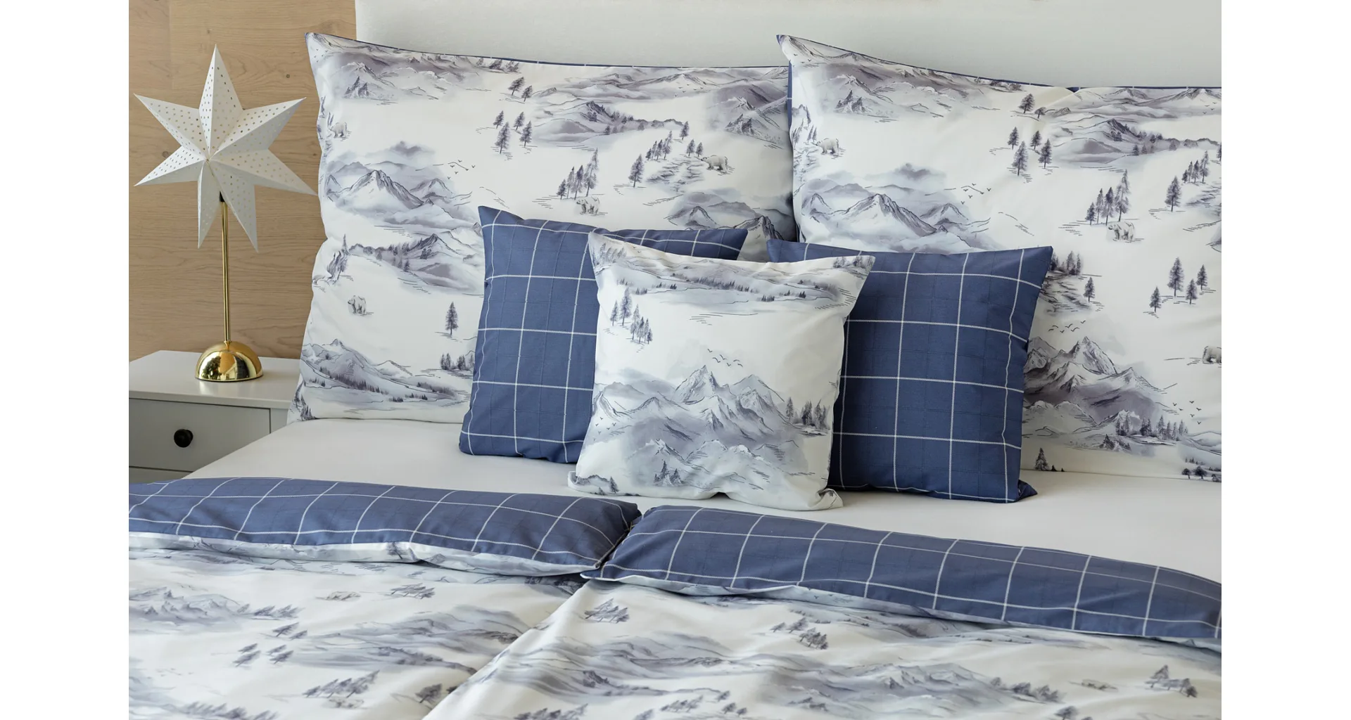 Bavlnené obliečky Polar Blue vnesú do vašej spálne sviežosť a navodia tú správnu zimnú atmosféru. Vrchnú stranu obliečok zdobí kresba horskej krajiny v palete modrošedých tónov na snehovo-bielom podklade. Spodnú stranu tvorí kocka s bielou kontúrou na modrošedom podklade. Vďaka tomuto obľúbenému obojstrannému prevedeniu môžete pri stlaní hravo experimentovať!