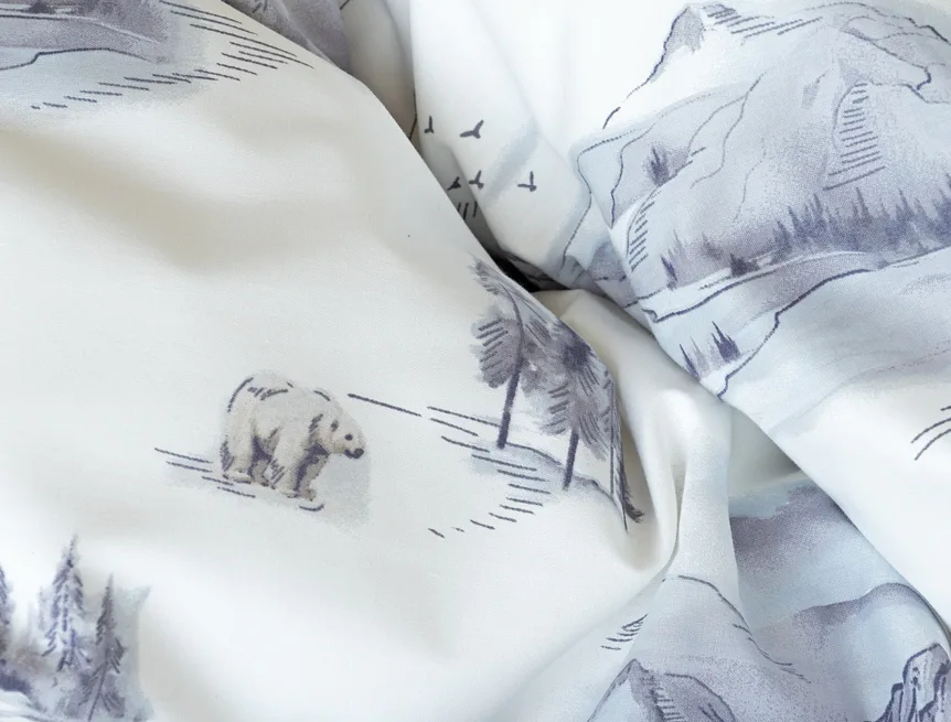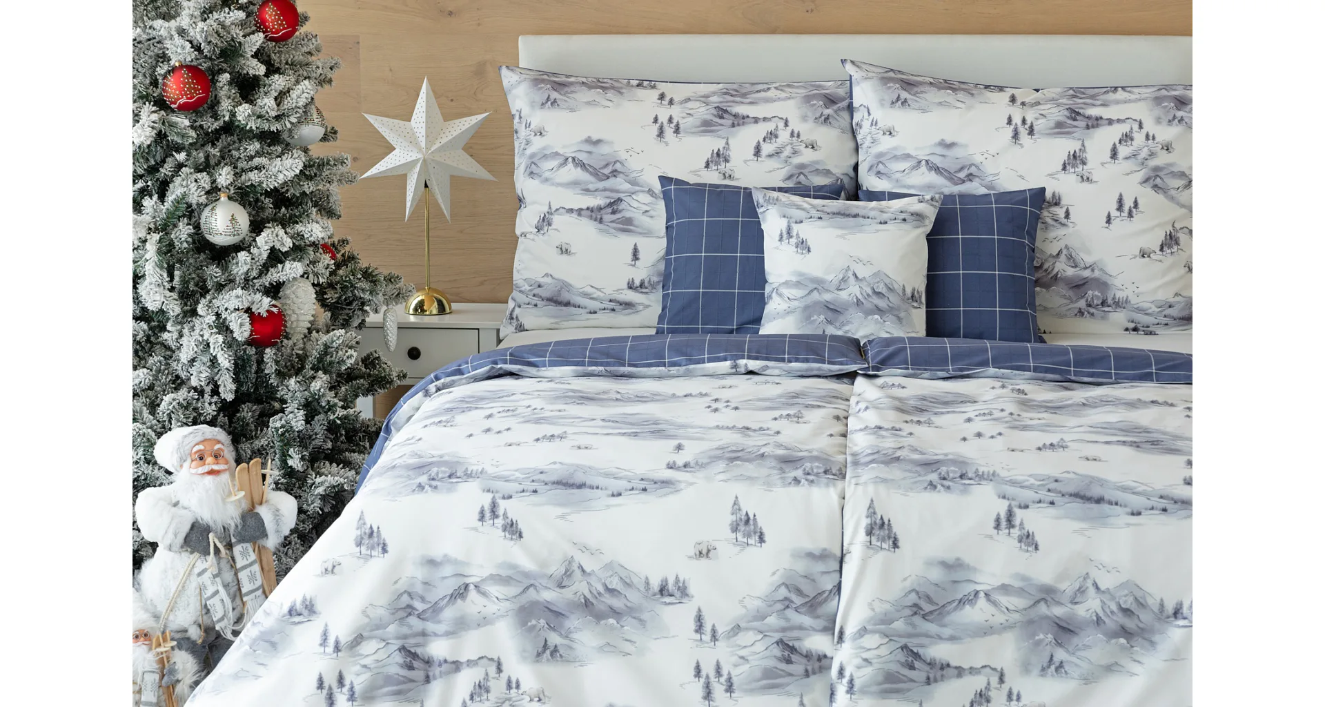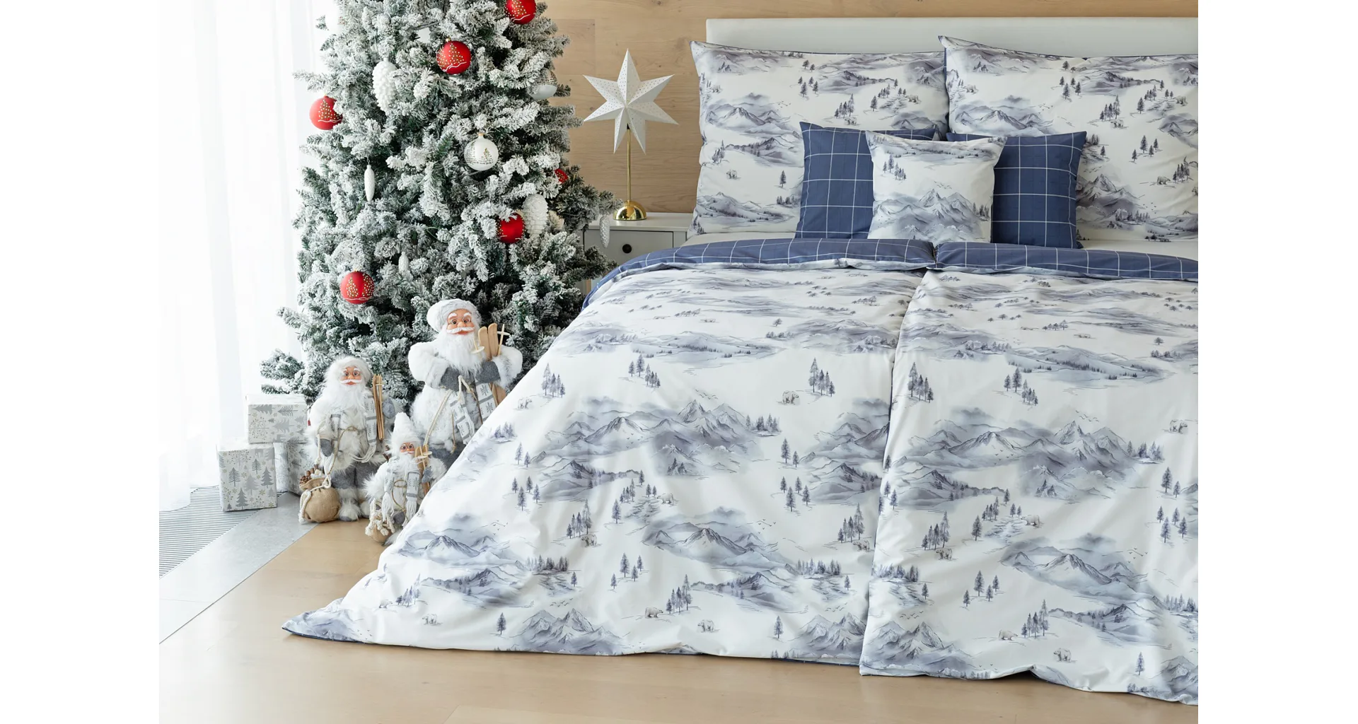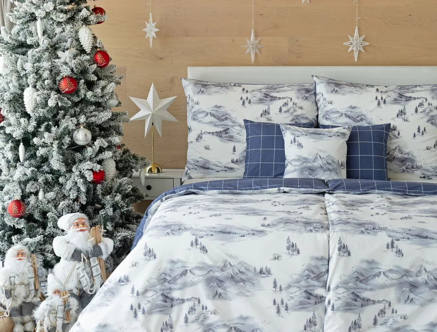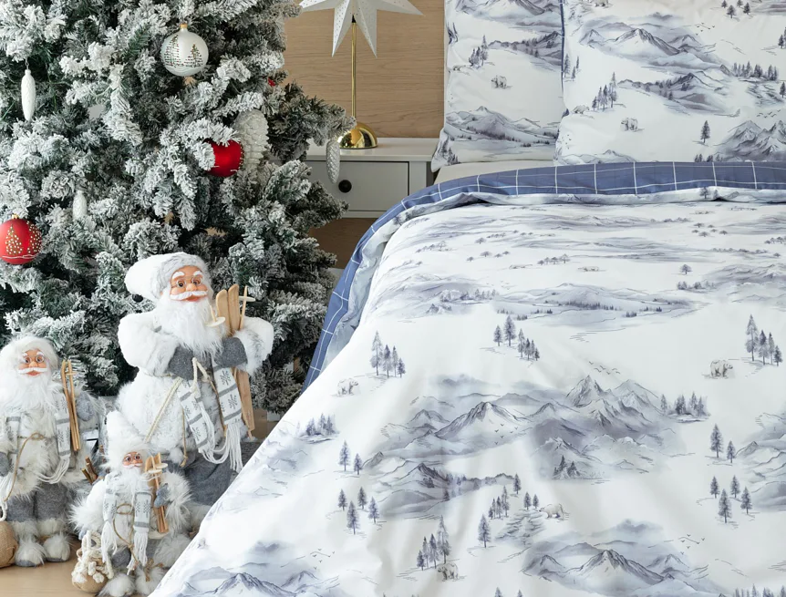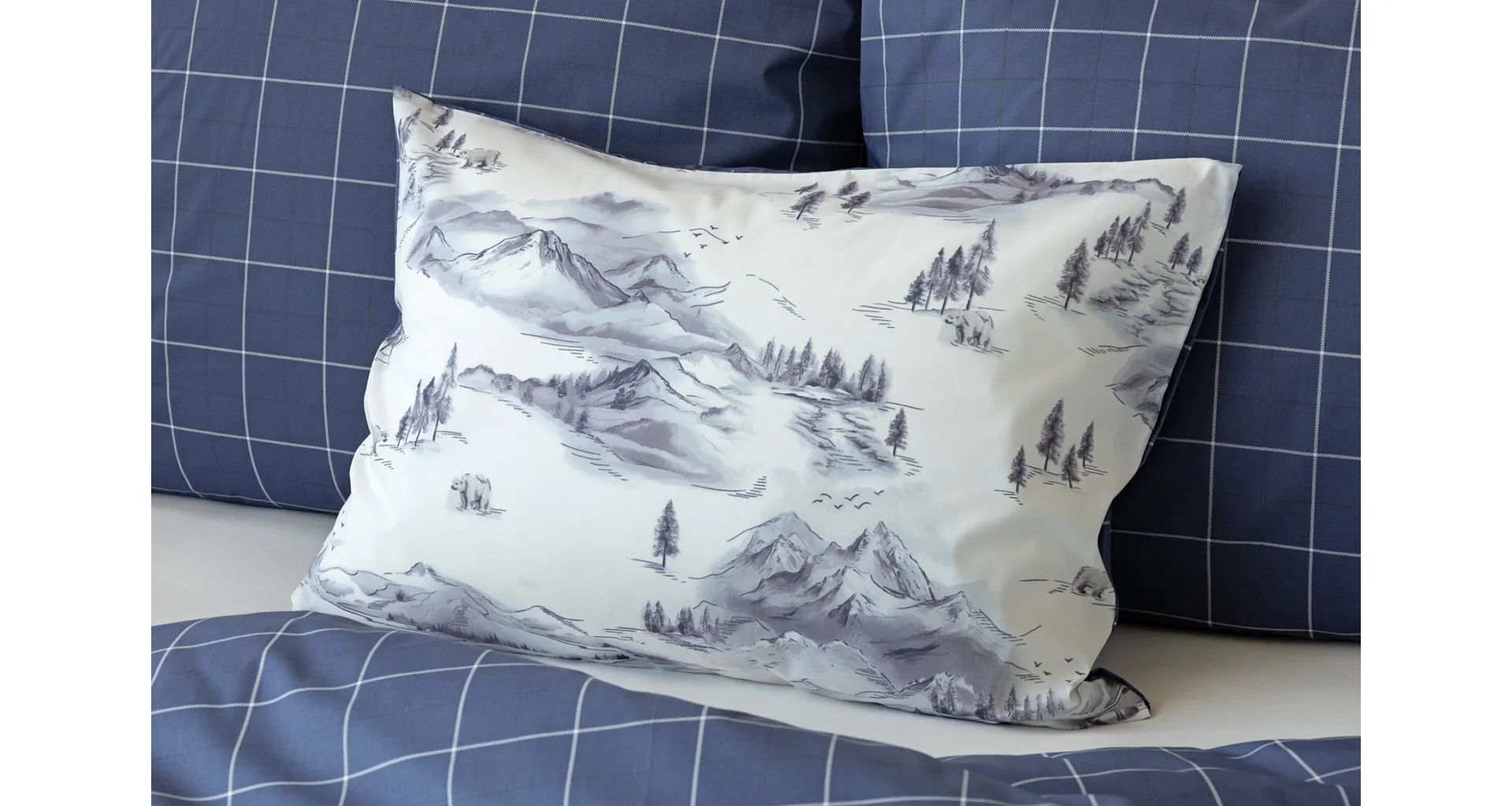 Bavlnené obliečky Polar Blue vnesú do vašej spálne sviežosť a navodia tú správnu zimnú atmosféru. Vrchnú stranu obliečok zdobí kresba horskej krajiny v palete modrošedých tónov na snehovo-bielom podklade. Spodnú stranu tvorí kocka s bielou kontúrou na modrošedom podklade. Vďaka tomuto obľúbenému obojstrannému prevedeniu môžete pri stlaní hravo experimentovať!