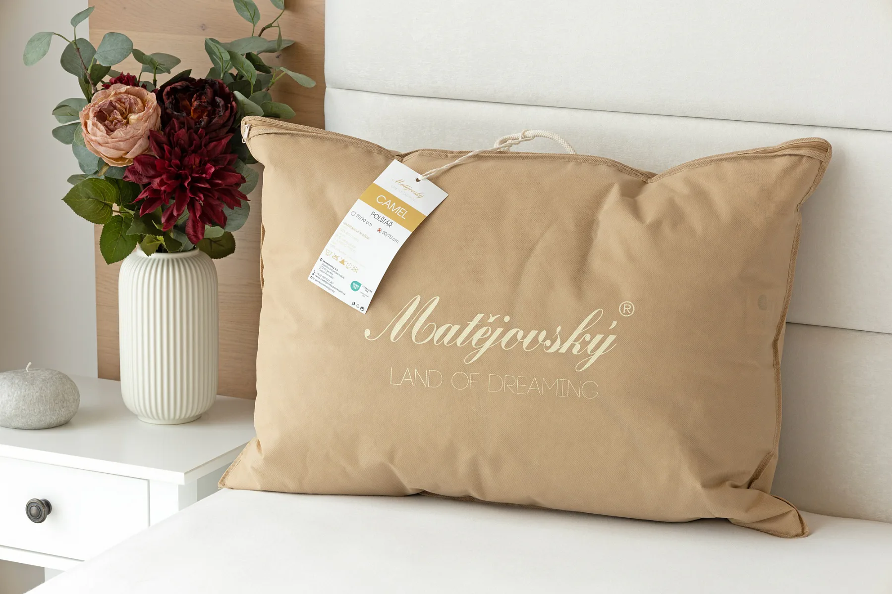Balení: polštář z řady Camel je dodáván bez plastového obalu, v praktické tašce z netkané textilie