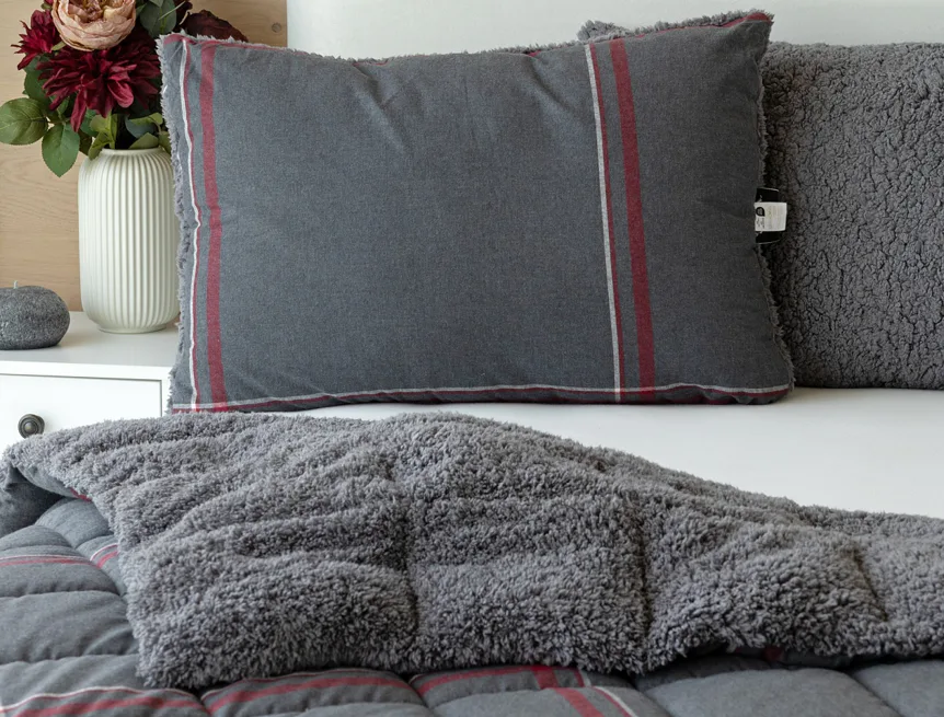 Nová kolekce flanelových polštářů s beránkem vám zajistí jedinečný tepelný komfort a úžasné pohodlí během sychravých dnů, chladných večerů a zimních nocí. Vrchní stranu polštáře tvoří hebký flanel s jemným chloupkem, spodní stranu pokrývá hřejivý nadýchaný beránek. Vrchní potah je snímatelný s praktickým zipovým uzávěrem na boku. Vnitřní výplň tvoří nadýchané polyesterové nano vlákno, které chrání potah z netkané textilie.